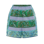 The Fraïche Boy Short in Blue by Boteh is a signature French scarf with a fresh tone of Boteh's duet of striped paisley, Fraiche ~ Azure lagoon-esque hues on mint base paired with emerald and cornflower blues. Exclusively designed BOTEH print with engineered print placement.