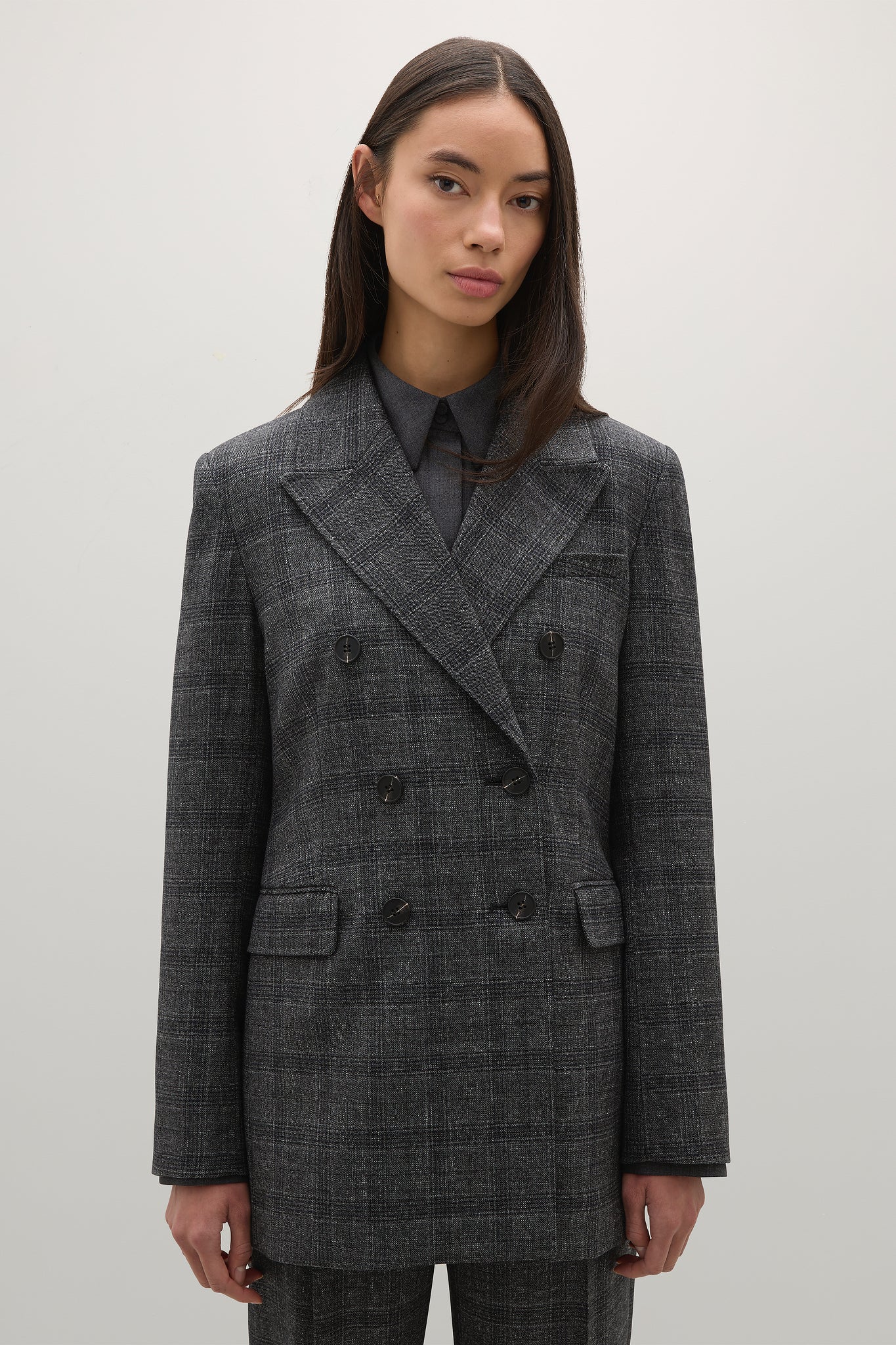 A modern take on tailoring, the Blanche Blazer is a double-breasted suiting style with six buttons, three pockets, a centre back vent and pick stitch detailing.