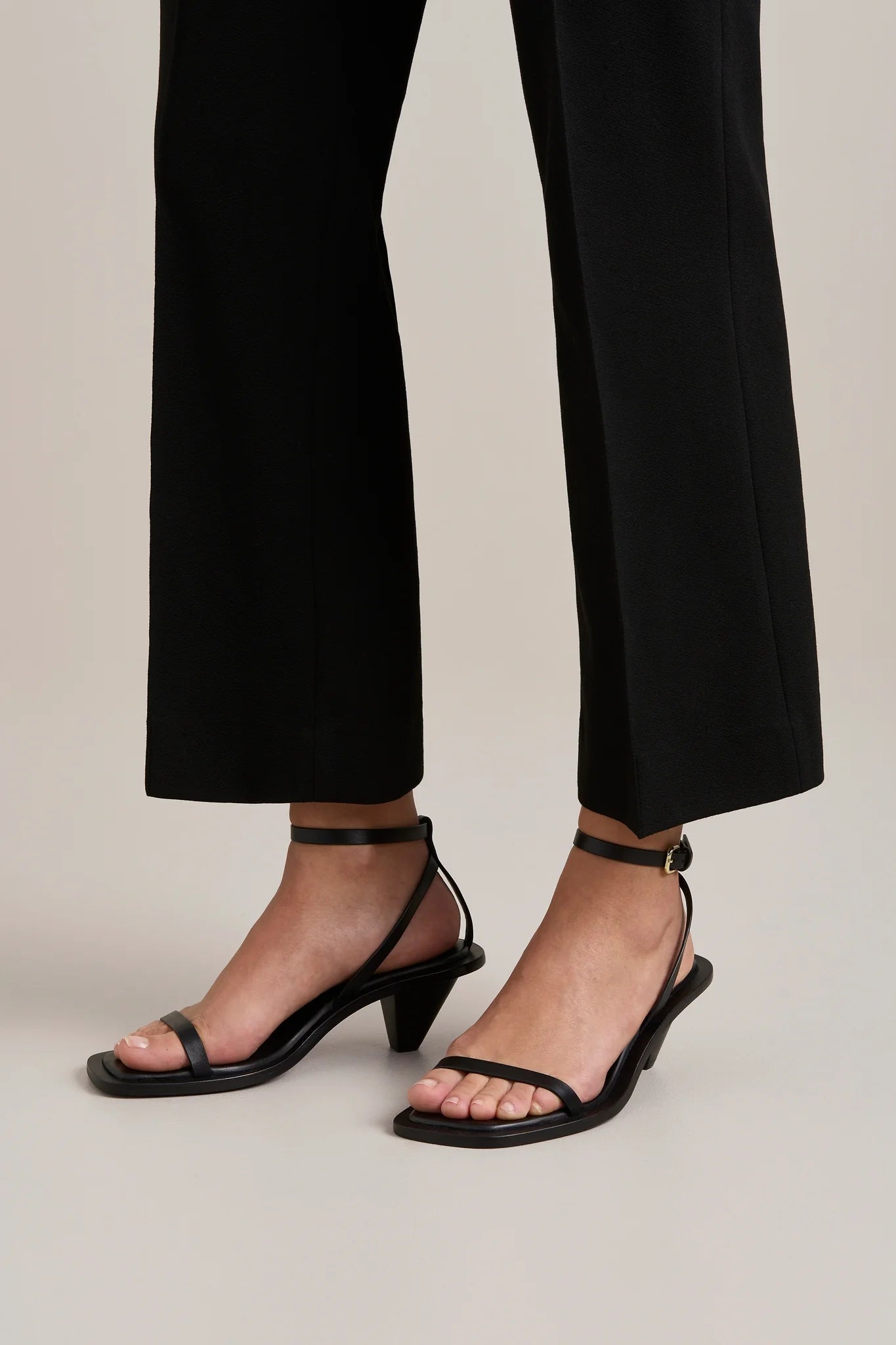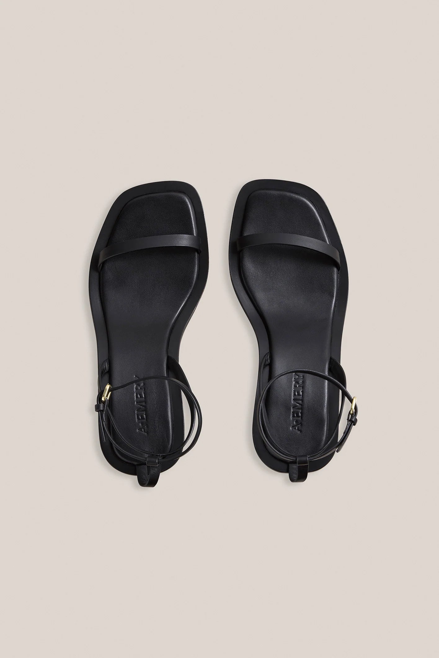 The Irving heeled sandal by A.Emery features a single minimal strap across the front of the foot and a wrap around ankle strap secured with a small soft gold buckle. The heel is angular in shape for a clean modern look. The upper sits atop a padded insole with a 5.5cm stacked leather heel that is perfect for everyday wear.
