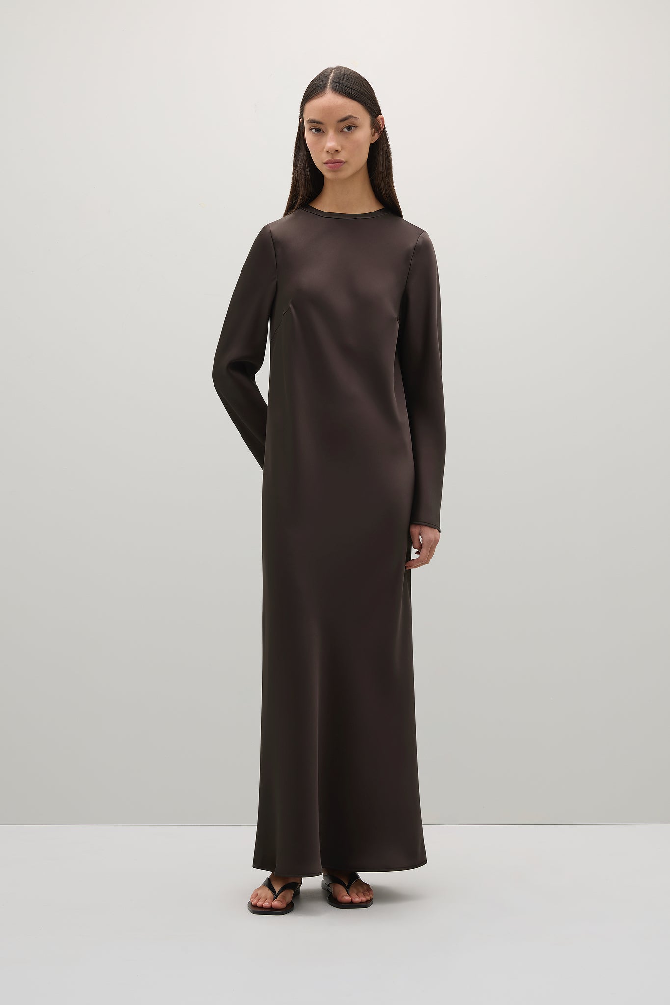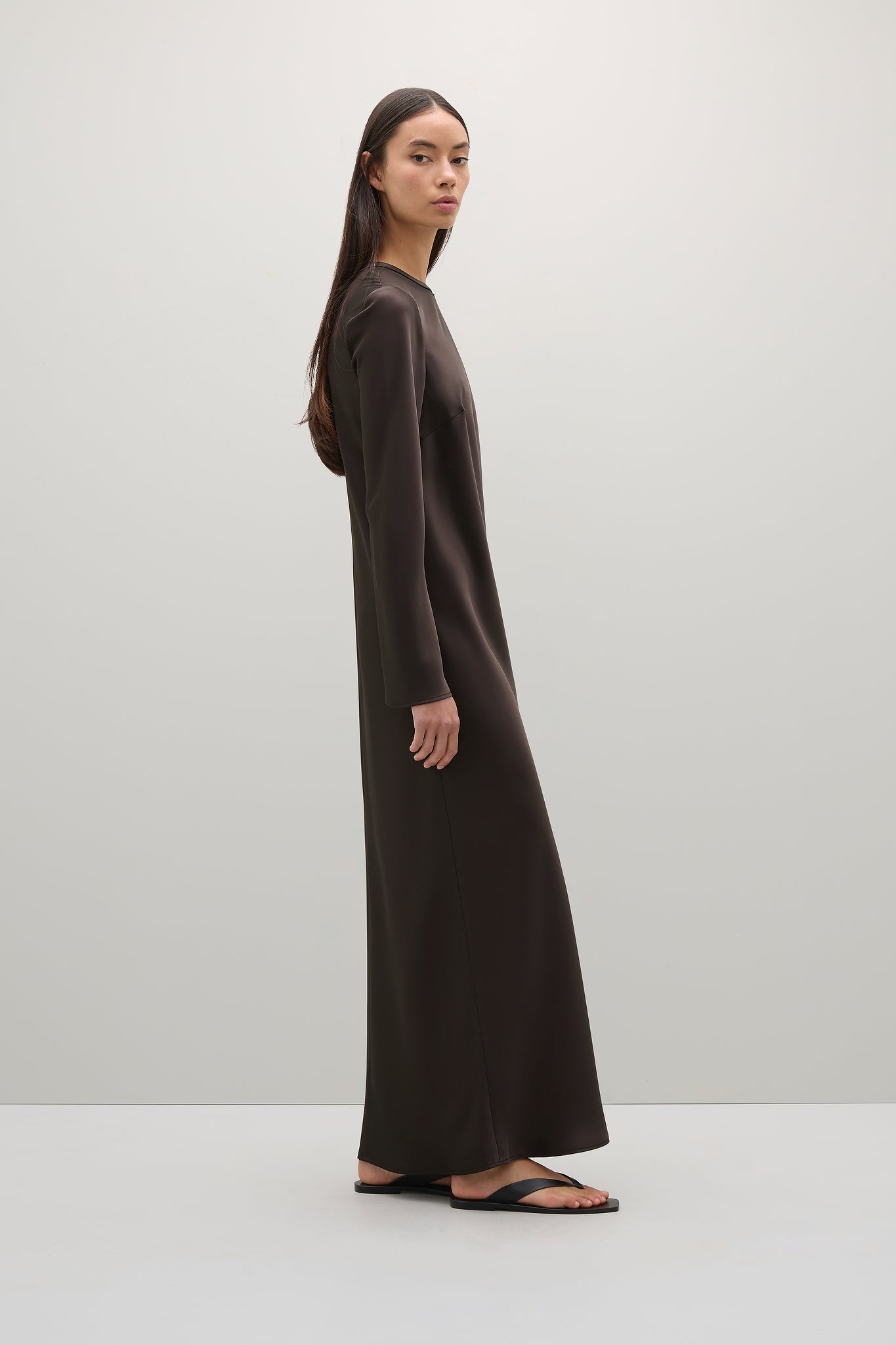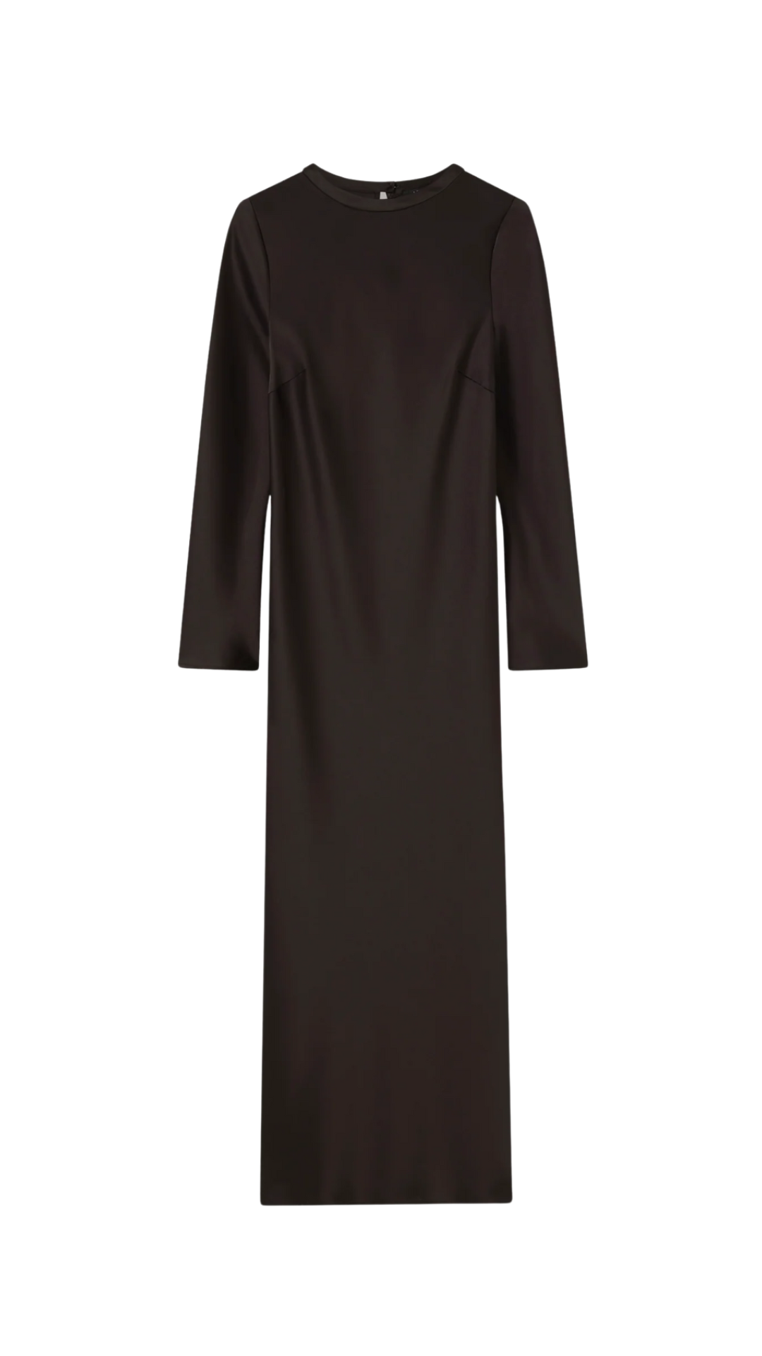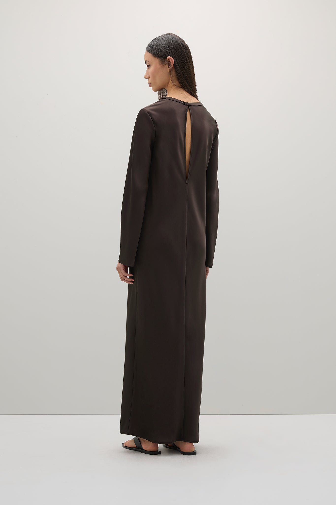 The Lowe Dress is a long sleeve maxi column dress, crafted from Japanese triacetate and cut on the bias to drape effortlessly on the body. A black slit detail elevates this style with a single button closure at the nape of the neck.