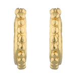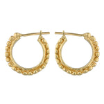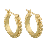 Gold hoop earrings with a border of small orbs.