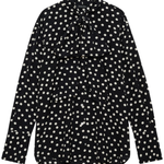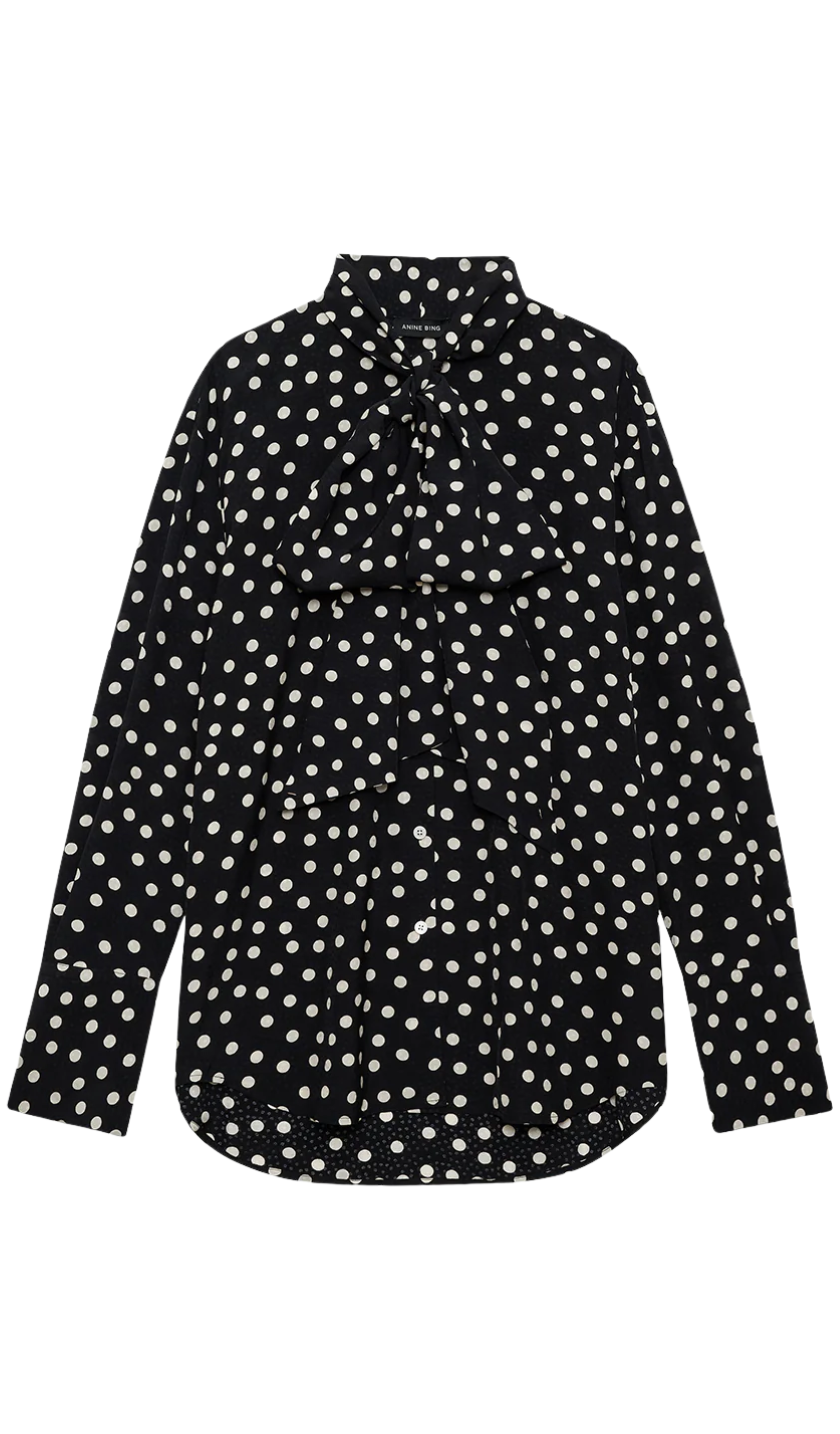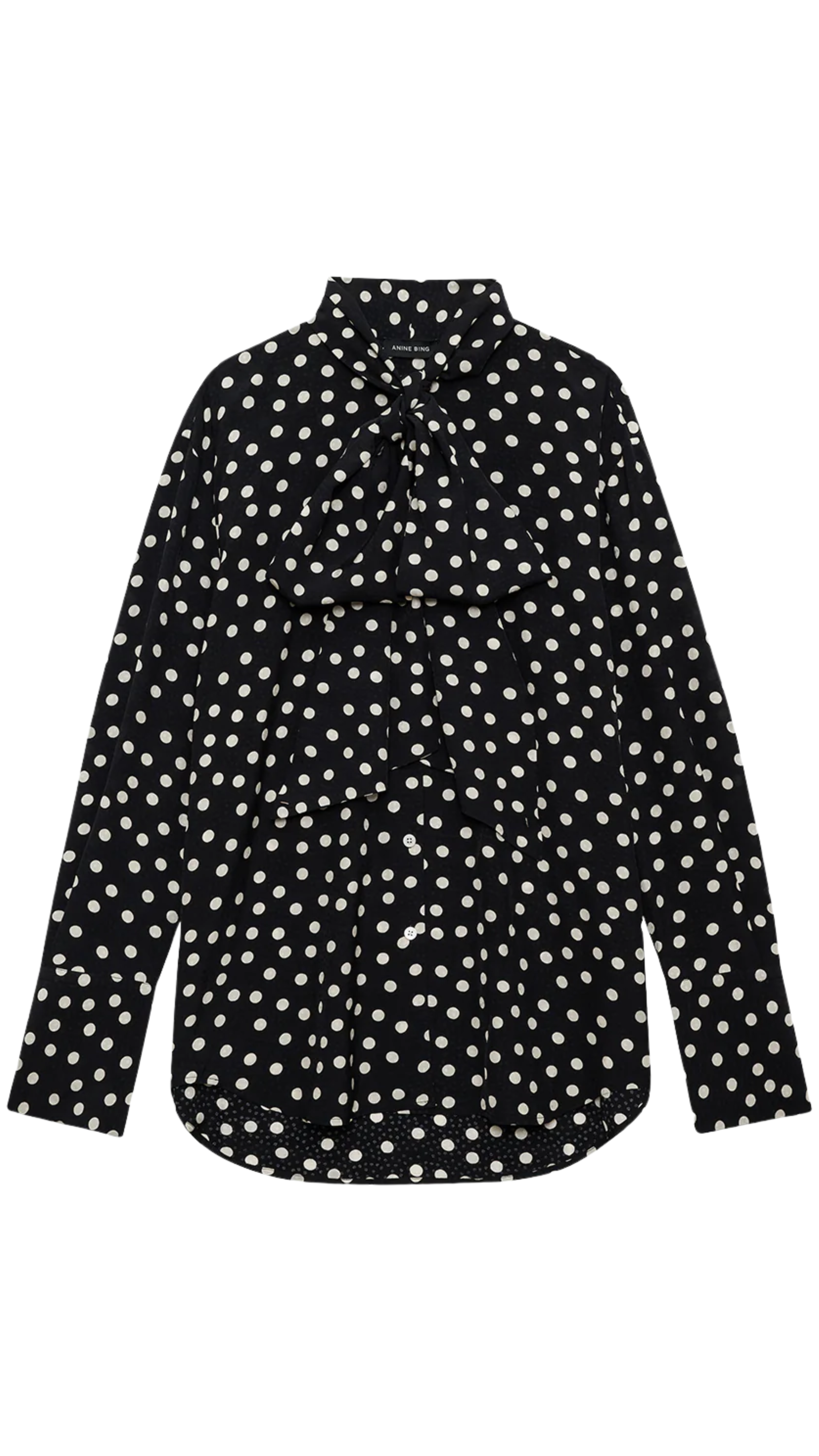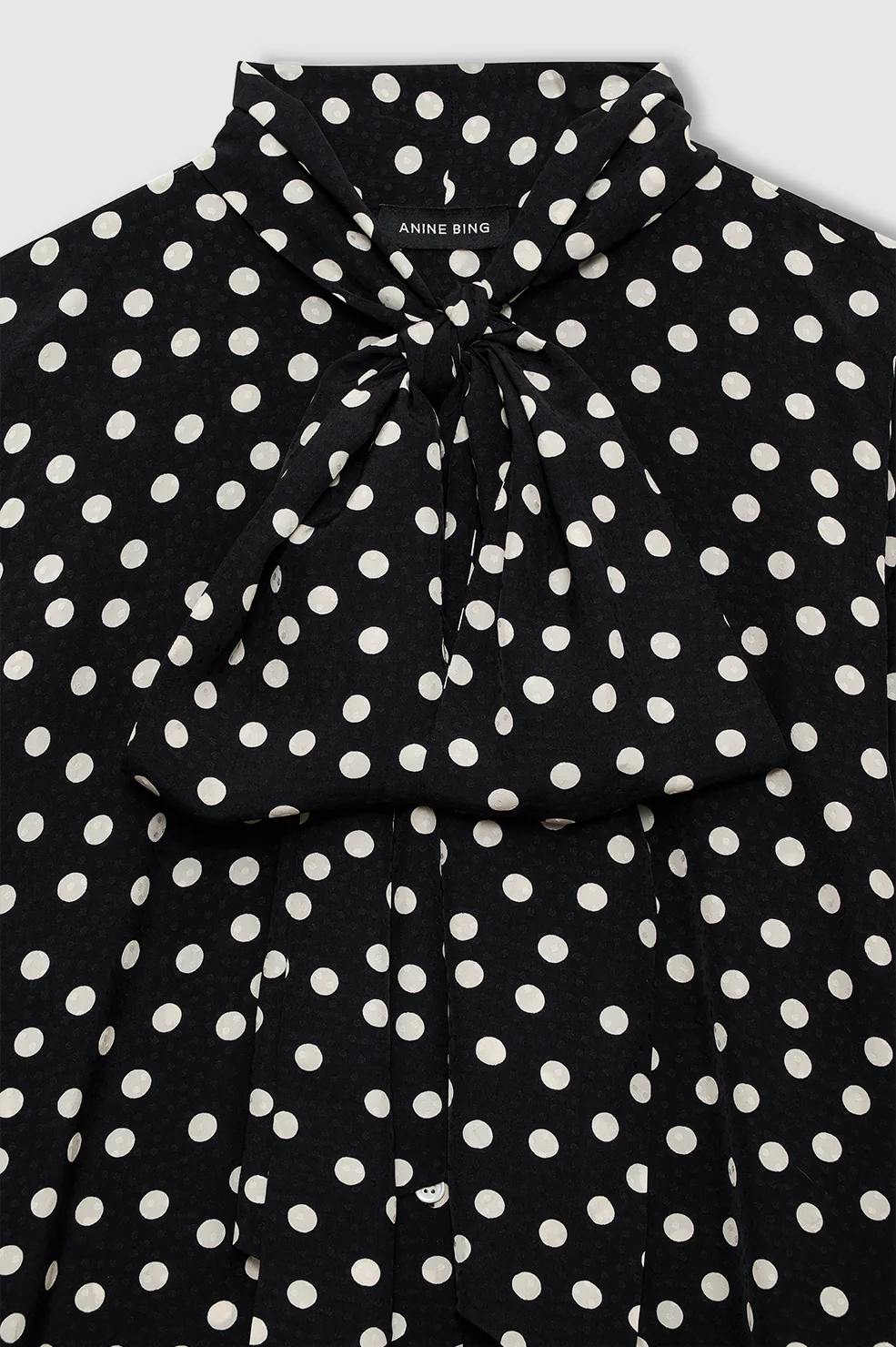 The Ruby Shirt combines timeless elegance with contemporary design, crafted from a luxurious black and white double-dot jacquard fabric. Its high-neck silhouette enhances sophistication, while the long sleeves provide a polished and versatile look perfect for both workdays and evening outings. The delicate tie closure at the neck adds a subtle, feminine touch, making it easy to style for any occasion. Designed to flatter the figure, this shirt balances comfort with chic appeal. Available in size S as modeled, it’s a refined addition to any wardrobe seeking understated yet distinctive style.