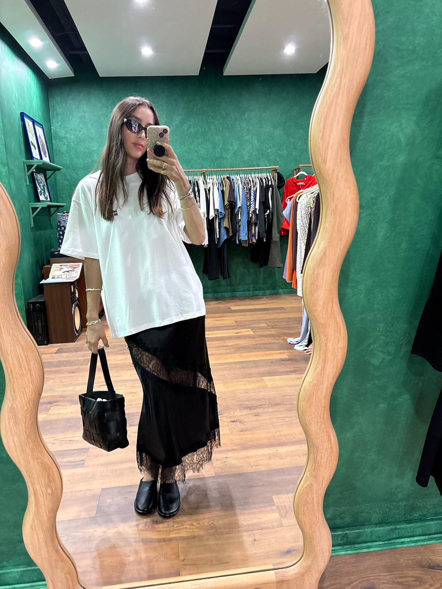 The Silk Lace Midi Skirt in Black is designed for versatile styling. Thoughtfully placed asymmetrical lace panels add dimension to the silk bias cut fabric, creating a refined yet modern look. Style with a simple tee or chunky sweater for colder weather.