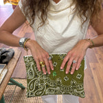 Zipped clover Pouch in bronze an weekend green is a versatile accessory crafted from 100% cotton. Measuring 24 cm x 32 cm, this handcrafted pouch combines practical storage with editorial style. Bandana designed in the USA, pouch constructed in Europe.