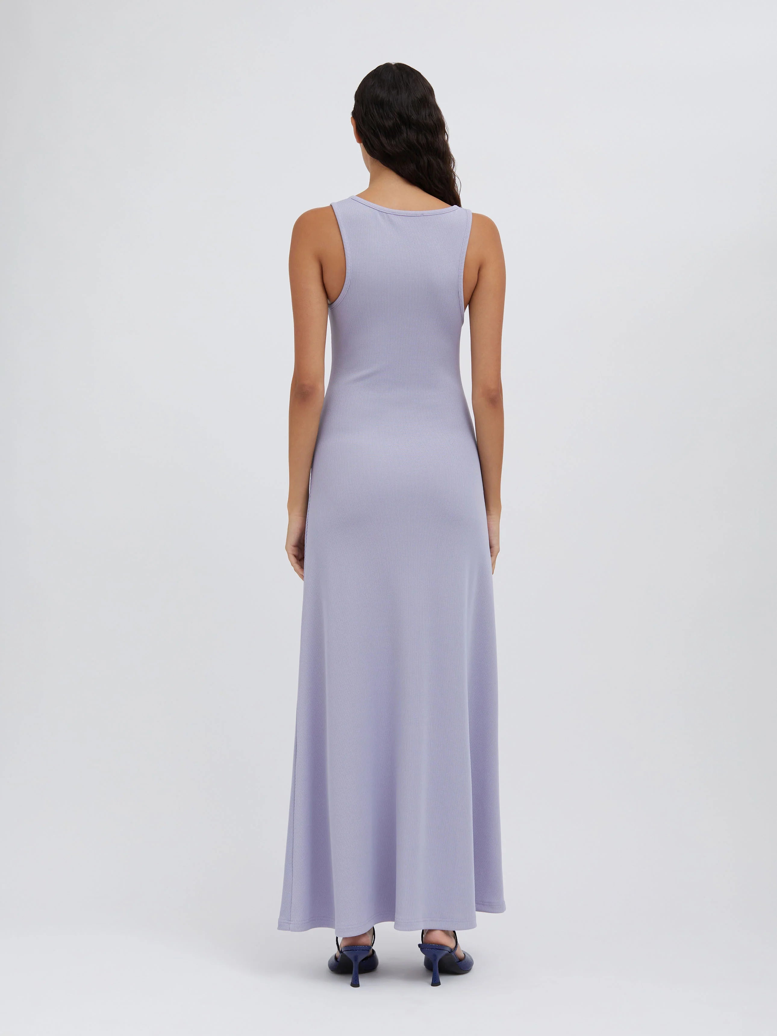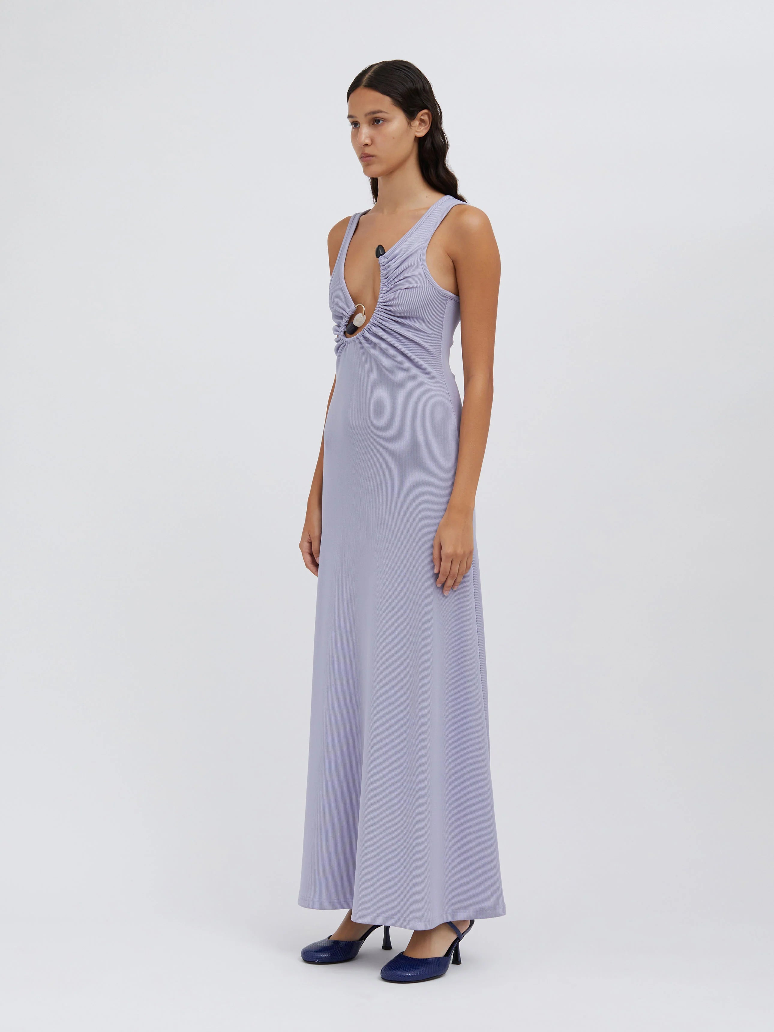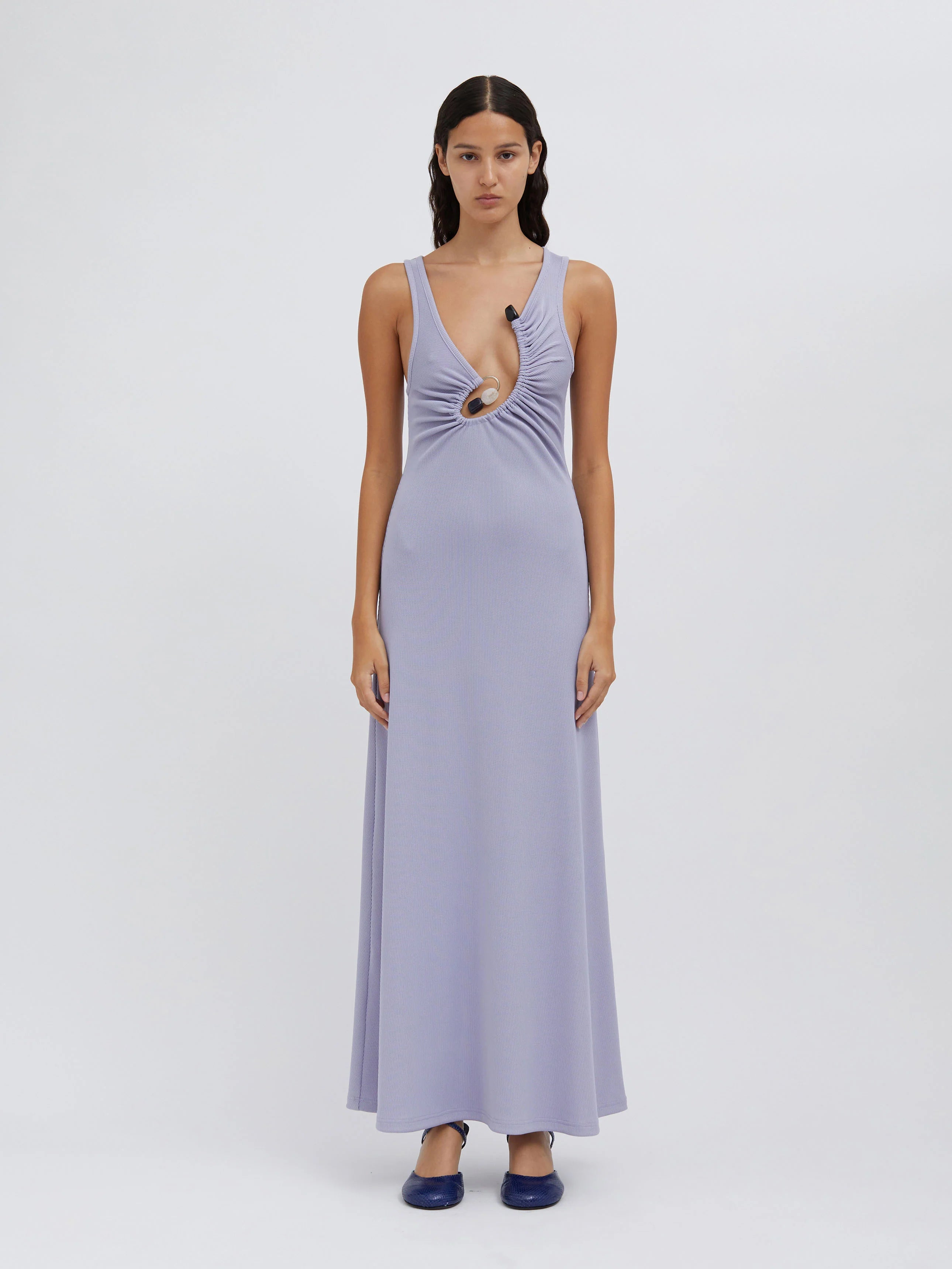 The Spiral Crystal Tank Dress - Lavender by Christopher Esber is adorned with bespoke natural stone hardware that enhances energy and optimism. This sleeveless rib tank dress is ruched to draw the eye in with its sculptural spiral cut-out. This is a timeless dress with a contemporary twist.