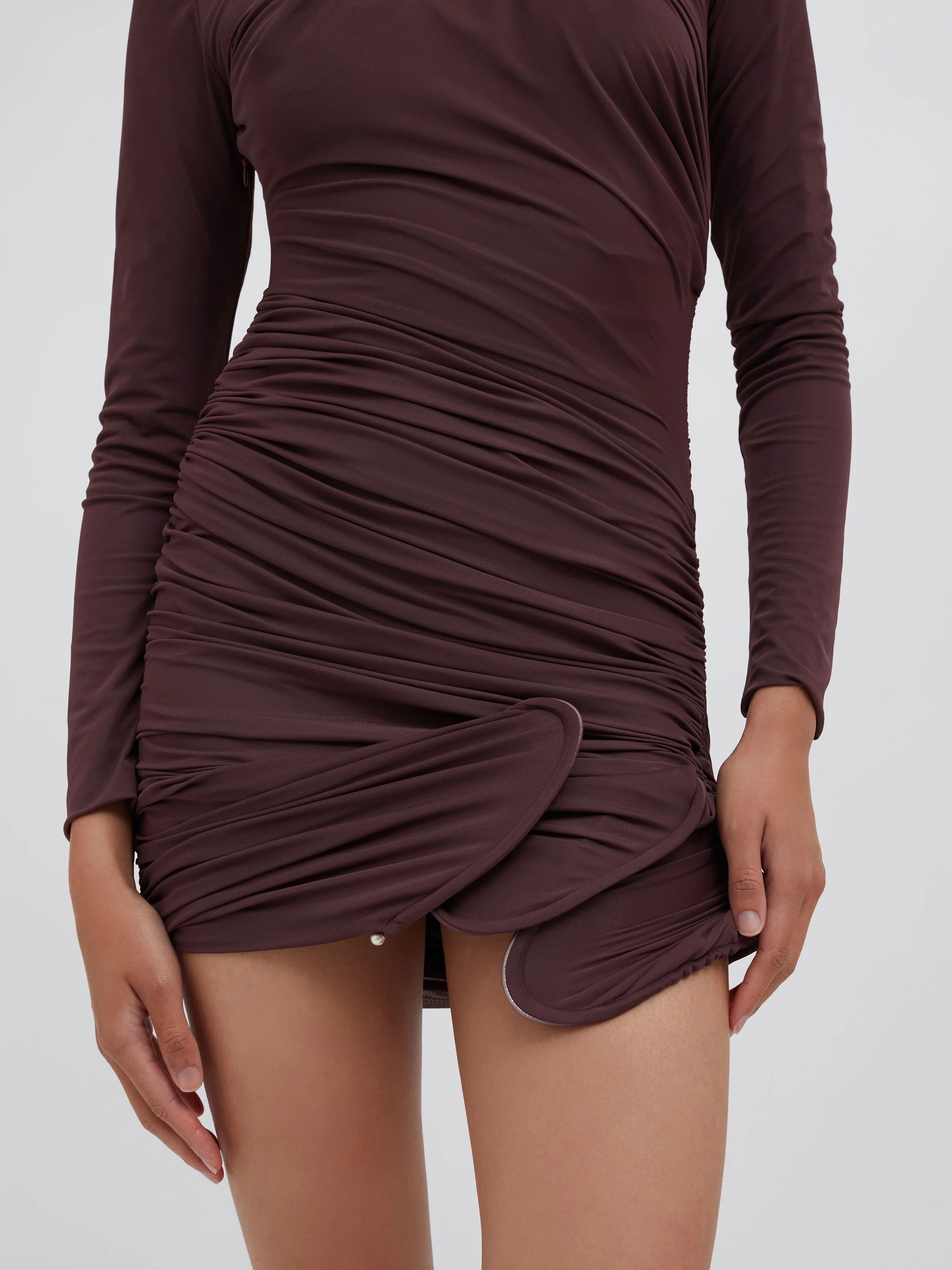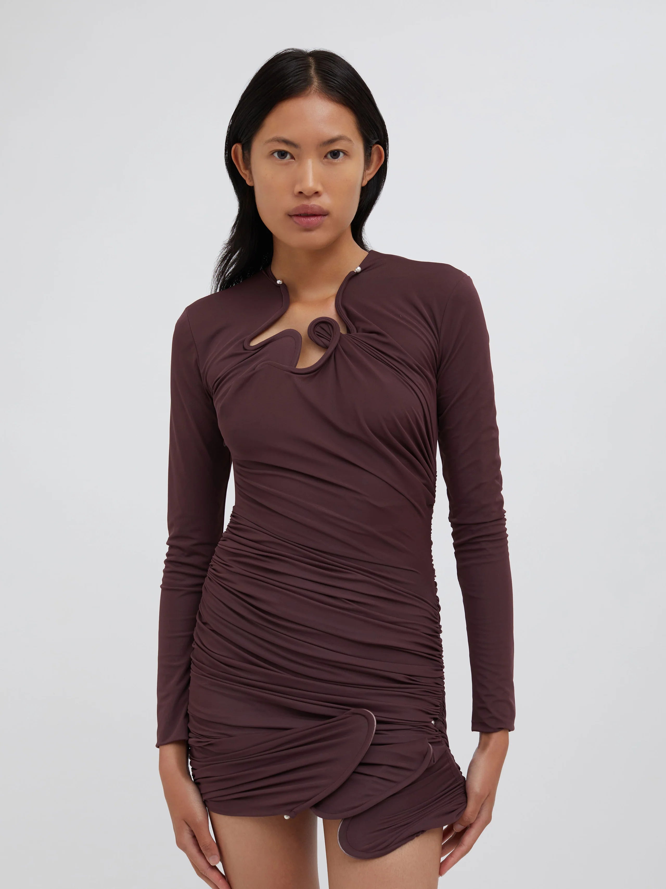 The Venus Looped Long Sleeve Dress - Mahogany by Christopher Esber is a sculptural dress with iconic Esber twisted hardware that anchors fine Italian jersey to form around the body. Sexy and chic all at once. This mini dress features ruched side seams and long sleeves with pearlescent studs.