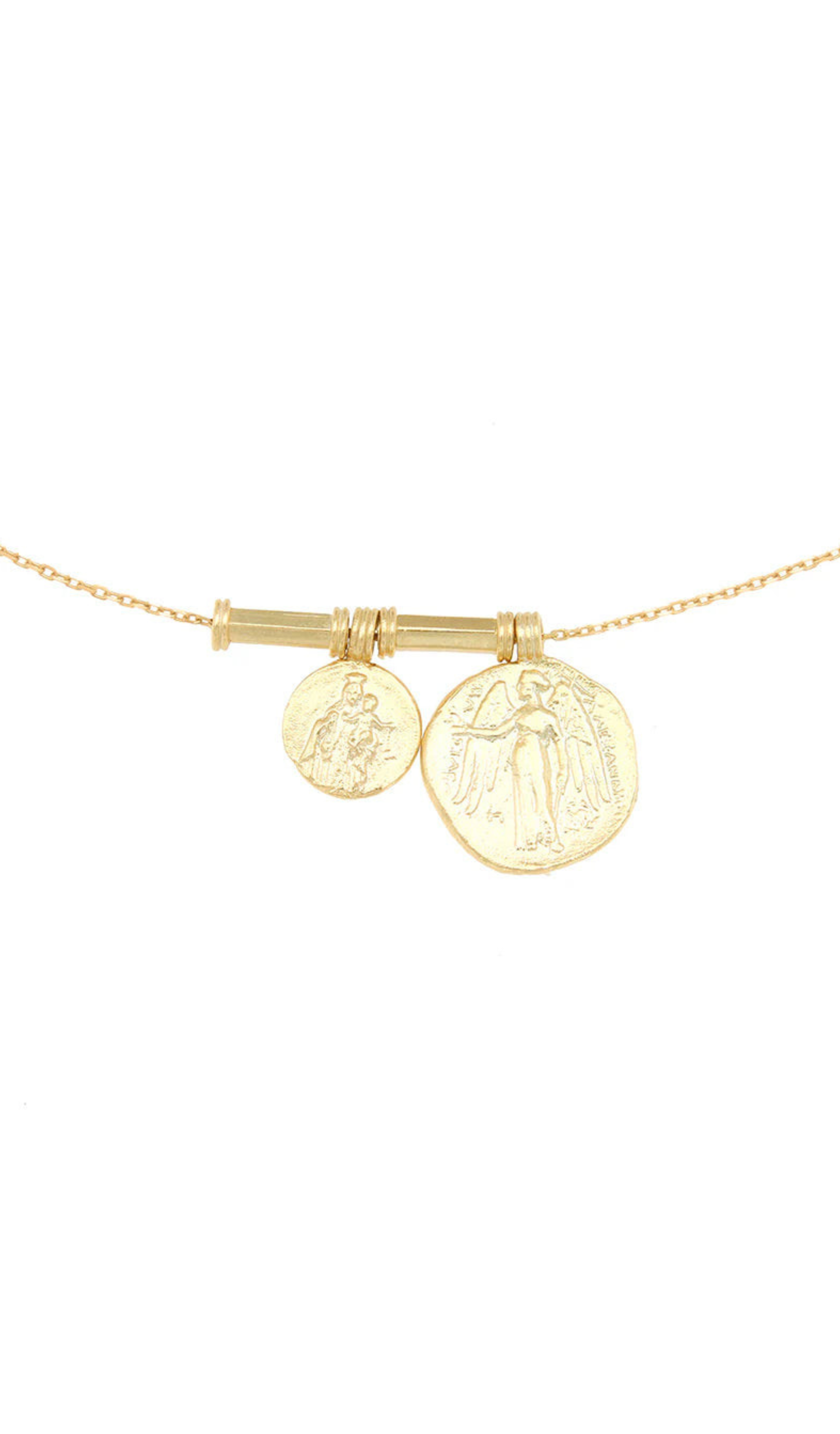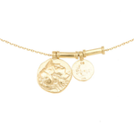 Crafted with an 18K gold-plated chain measuring 50-55cm, this Angelus Necklace features two elegant coin pendants. These ancient-inspired coins carry meaningful symbolism: the smaller coin depicts the love shared between Mother and Child, while the larger coin represents an angel, a healer and guide during challenging times. Each pendant adds a delicate touch—measuring 1.5 x 1.5cm and 1 x 1cm respectively. This necklace combines subtle beauty with a sense of warmth, illumination, and divine presence, making it a thoughtful accessory for daily wear or special moments.