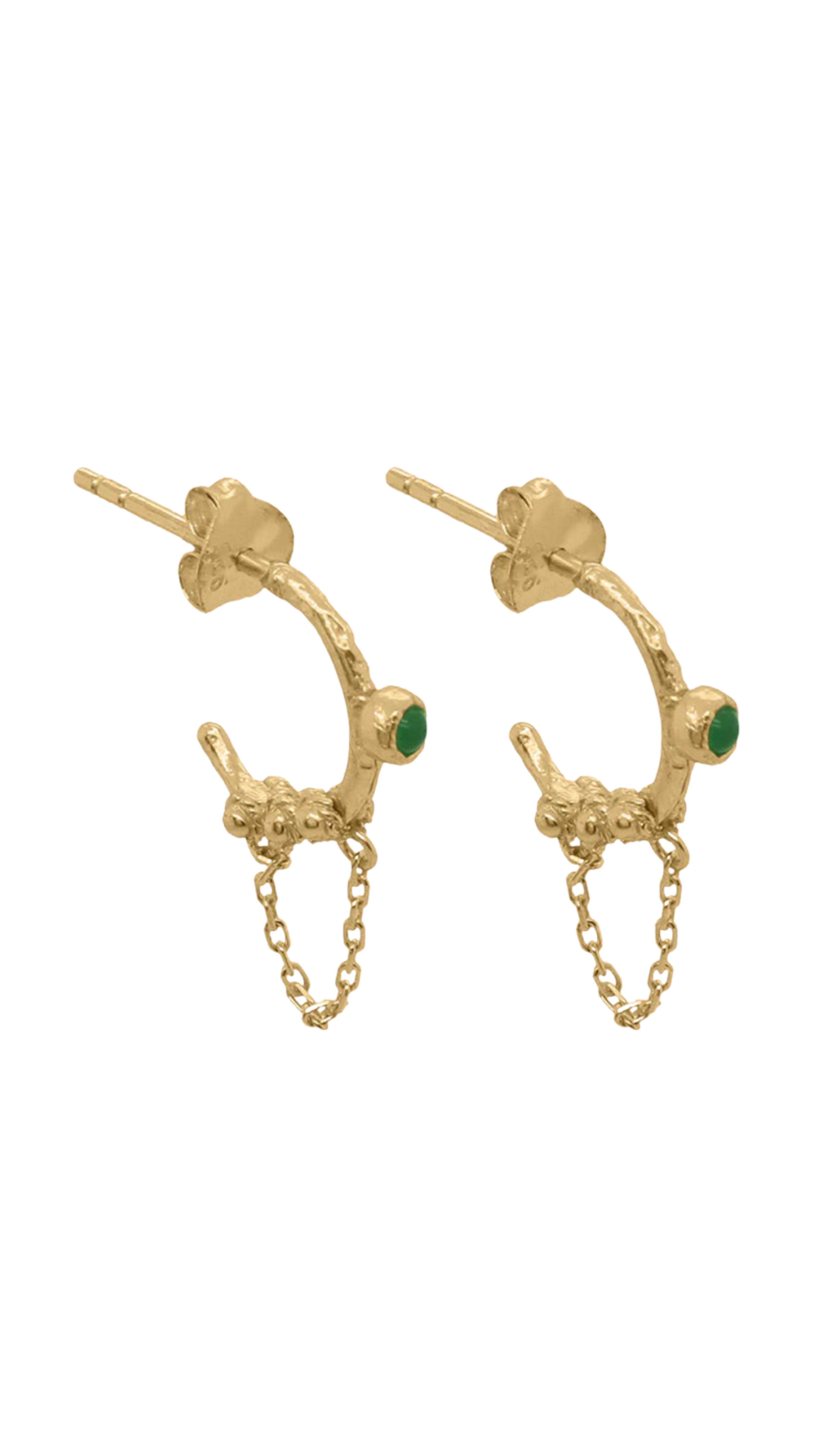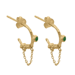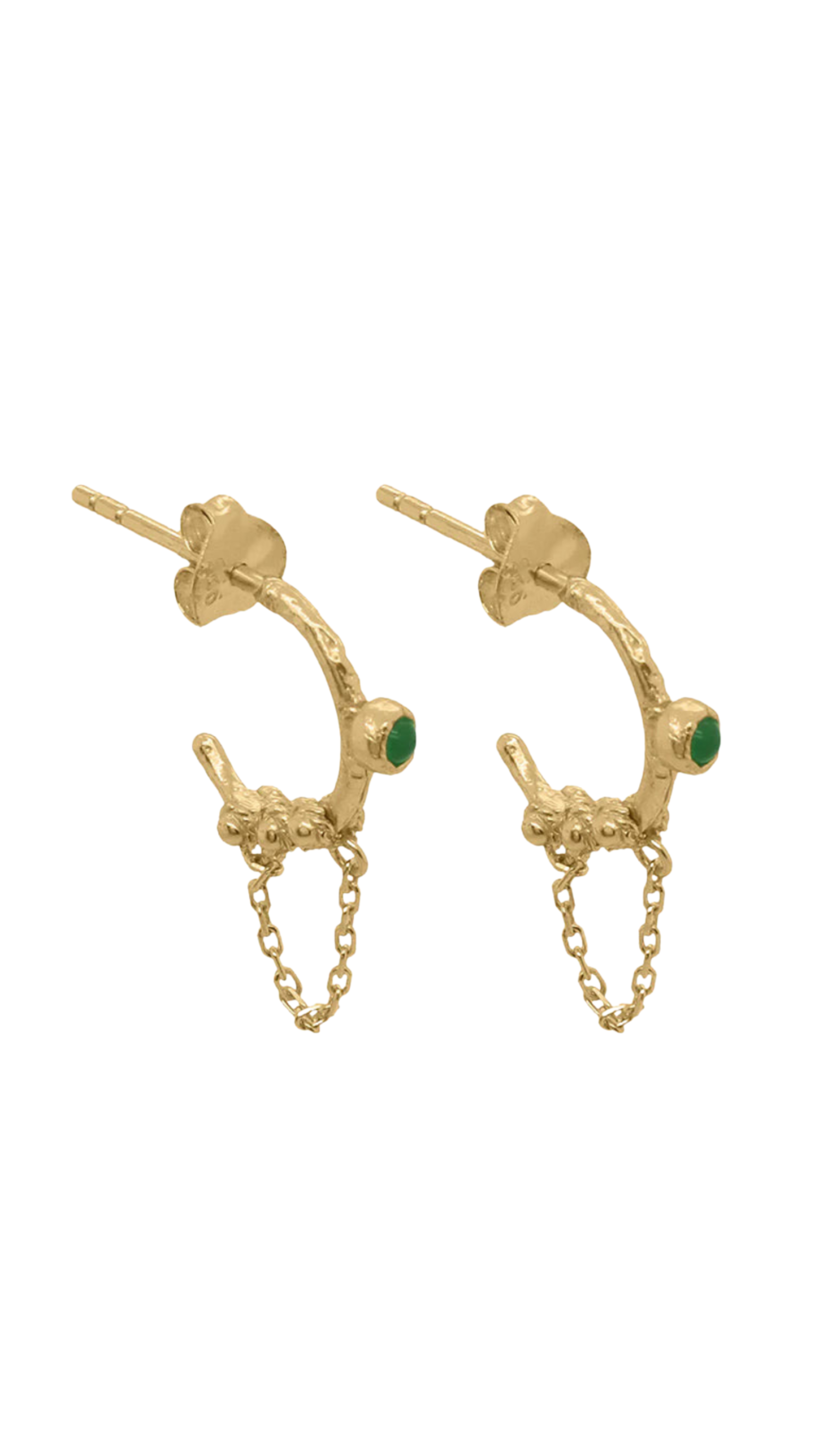 The Urraca by Cleopatra's Blingcare half-hoop earrings with a stud fastener, adorned with a jade gem, and looped golden chain.