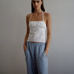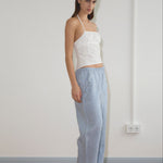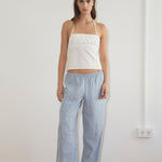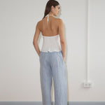 The Angle Pocket Pant by Deiji Studios in Blue Stripe combines effortless style with sustainable comfort. Designed with a relaxed mid-waist and ankle-length cut, these pants sit at a flattering low to mid-rise for a modern silhouette. Crafted from 100% GOTS certified organic, OEKO-TEX 100 certified, and EU certified stone-washed French linen, they offer breathable softness and durable quality. Functional front seam pockets with button details add subtle sophistication, while the soft minimal elastic waist ensures an easy fit all day. Perfect for a stylish yet laid-back look, this versatile pant elevates any wardrobe with its timeless design. Model is 176 cm, wears size S (AU 8).
