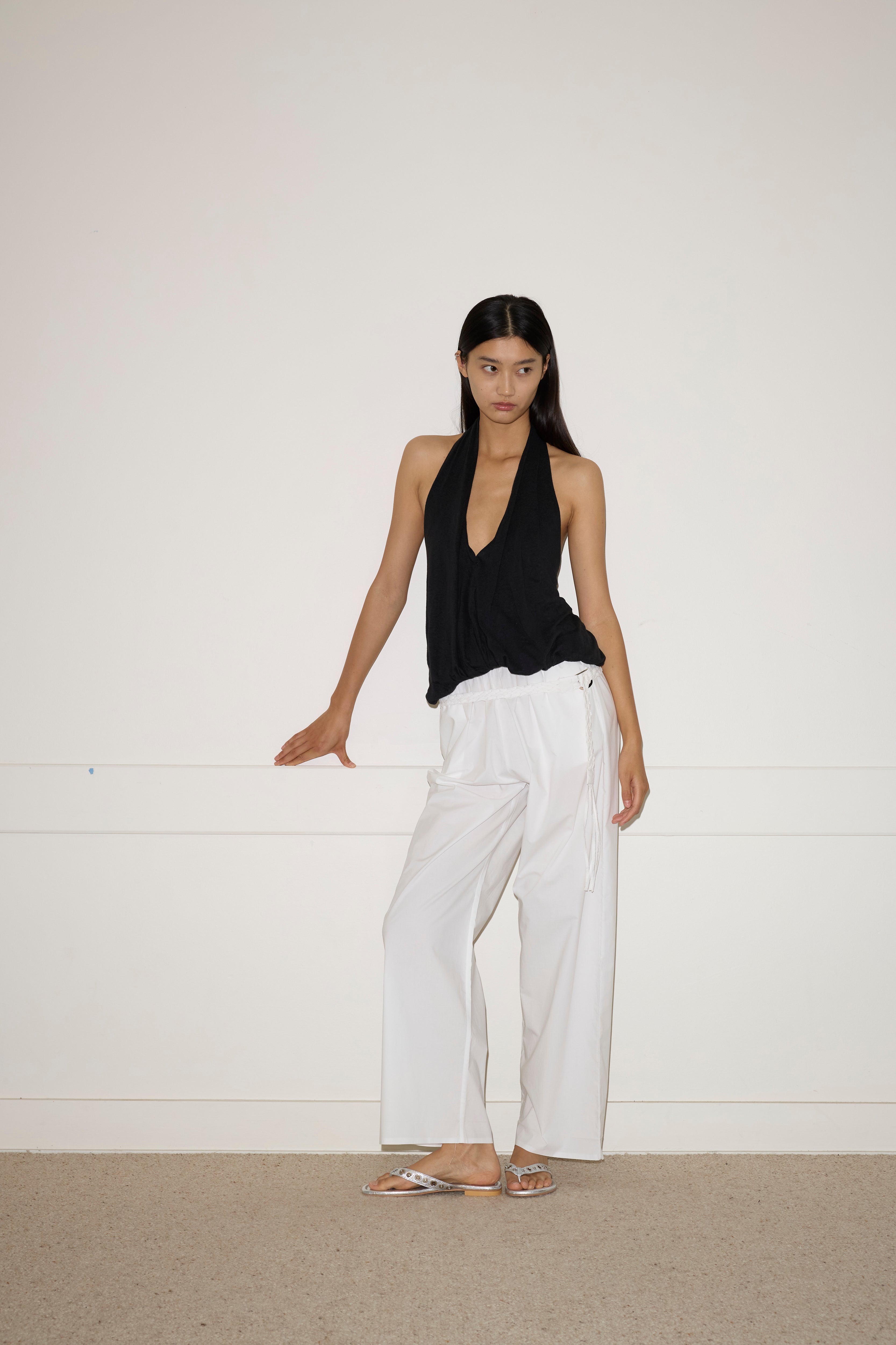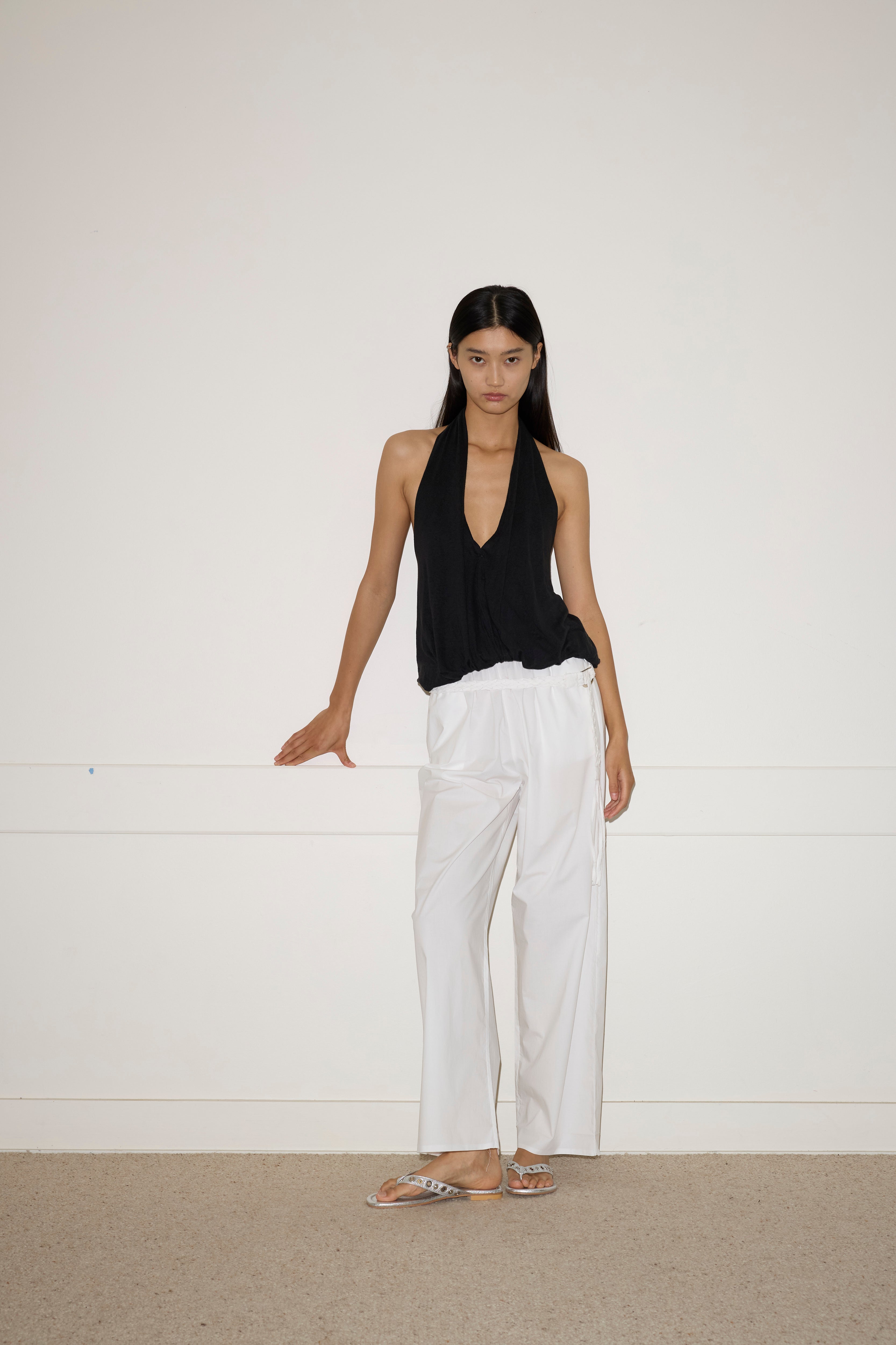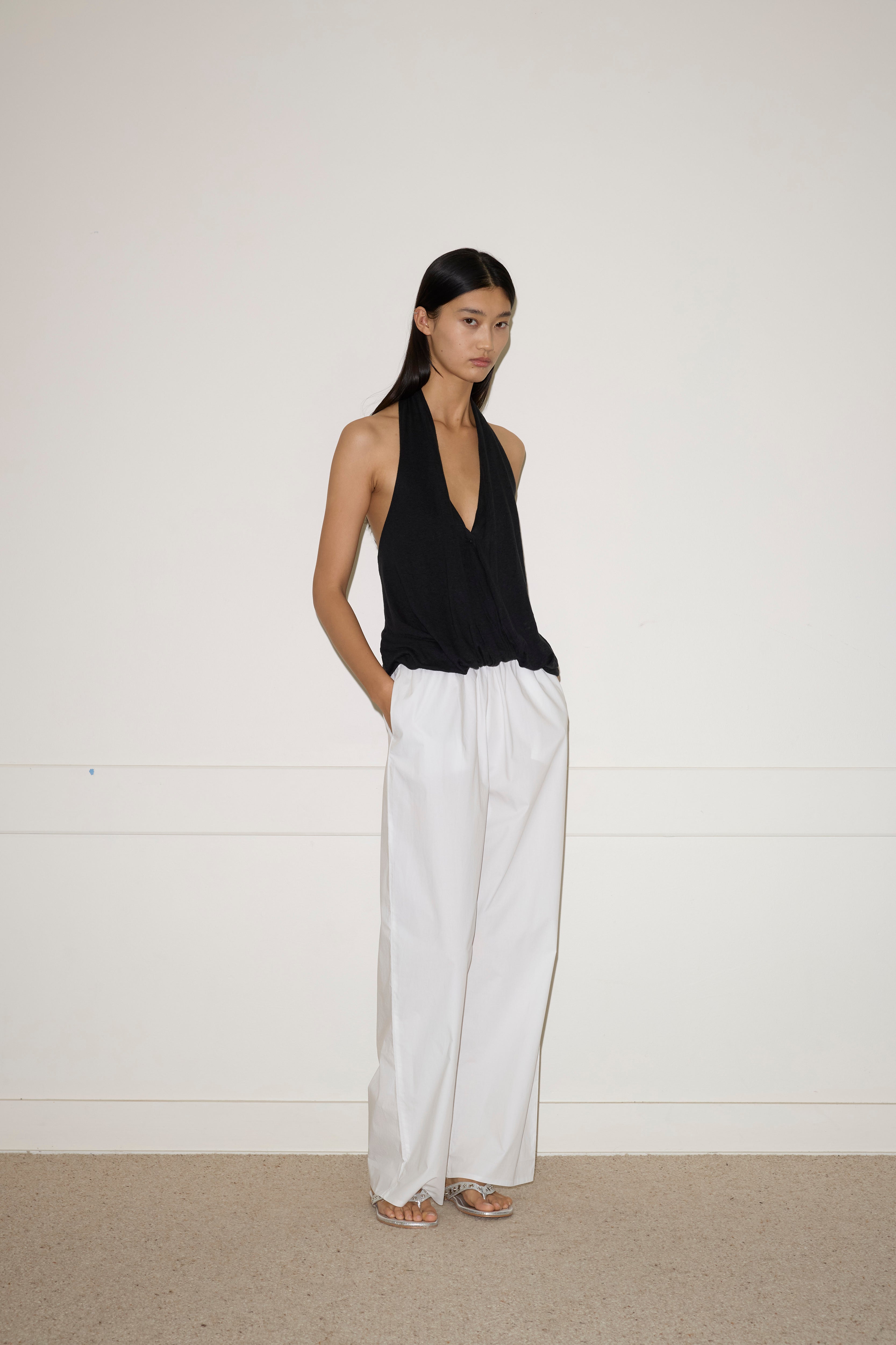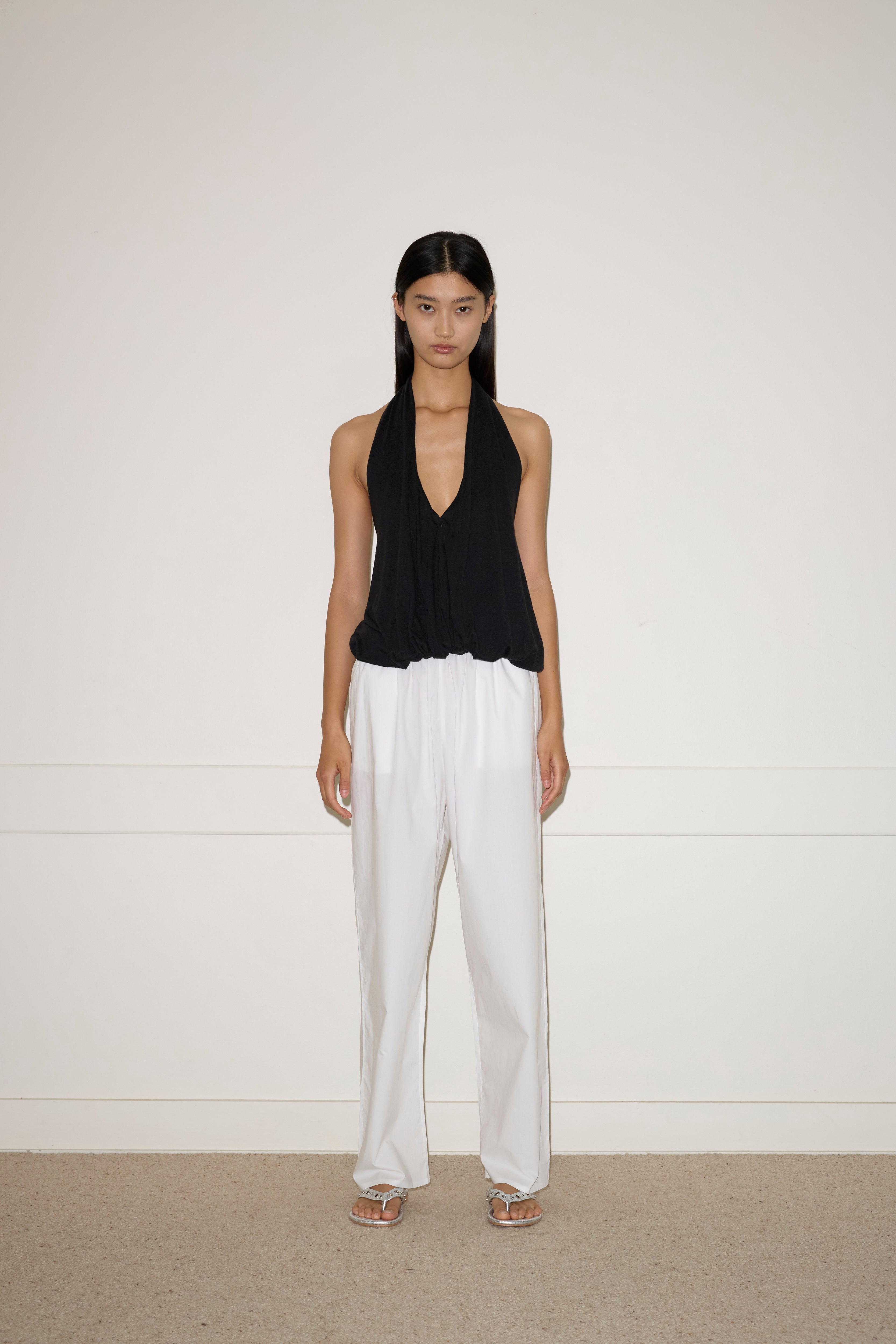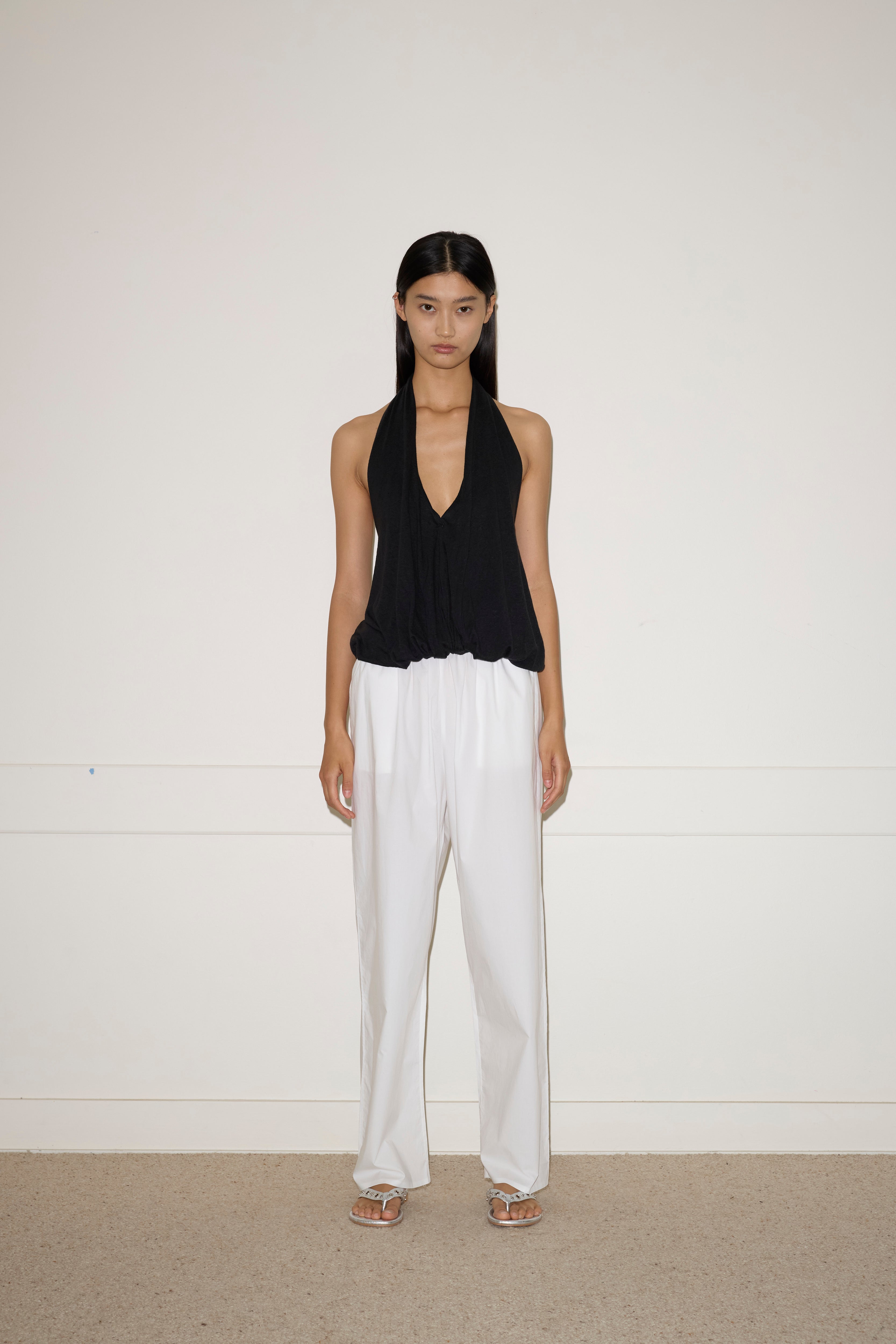 Relaxed halter top features flattering v neckline, soft wrap over with elasticated bubble-hem, low back in a relaxed silhouette.