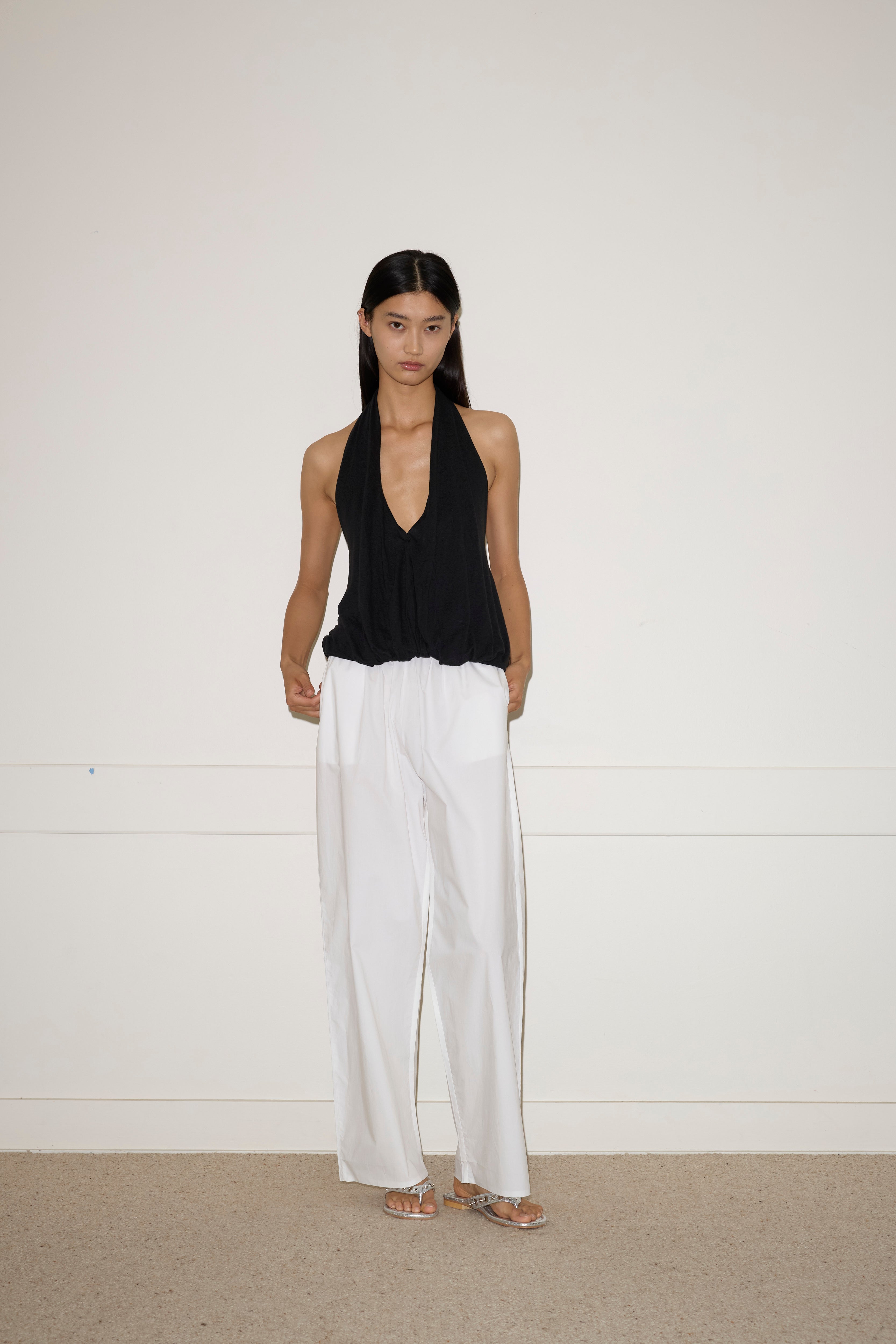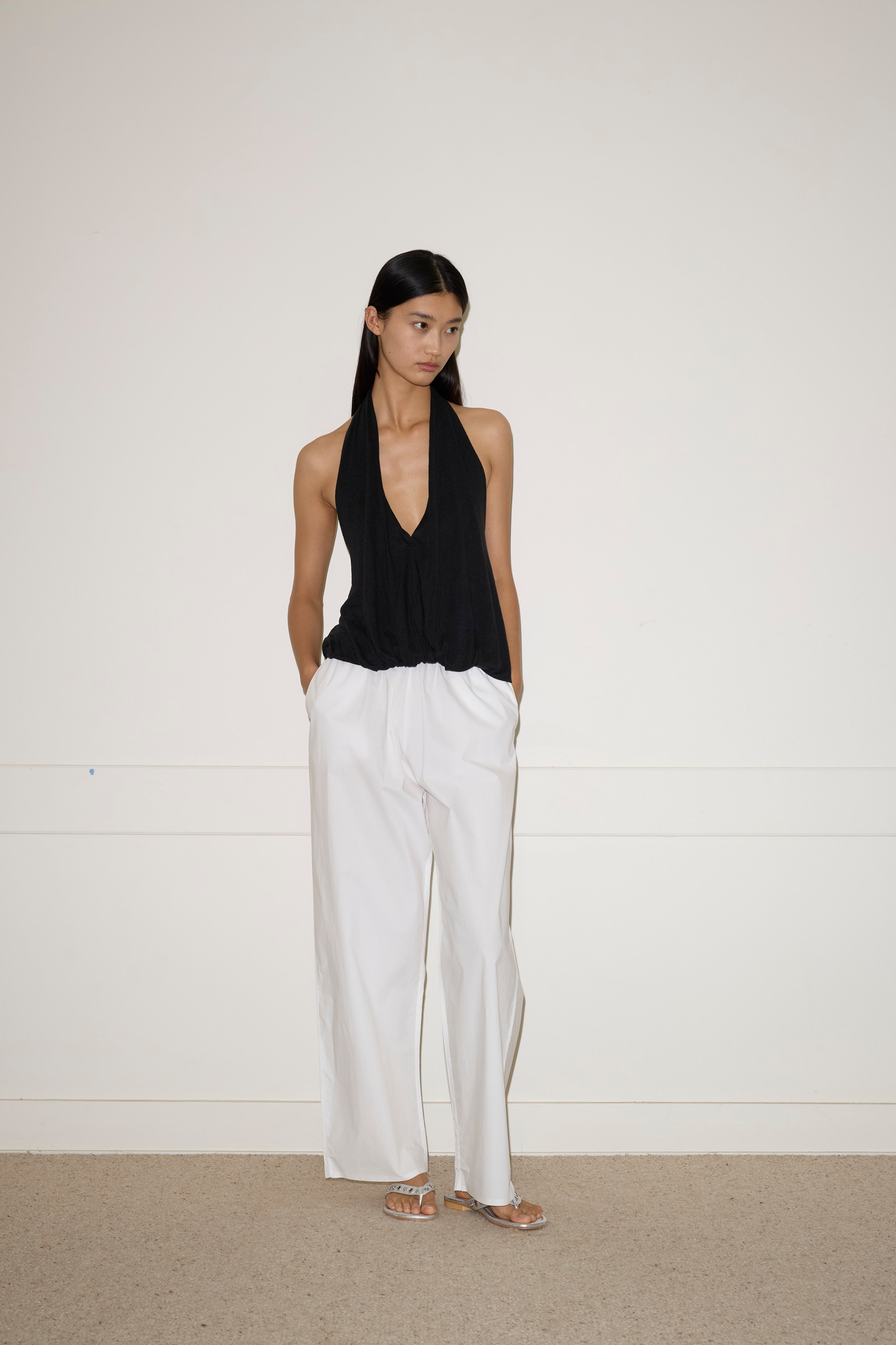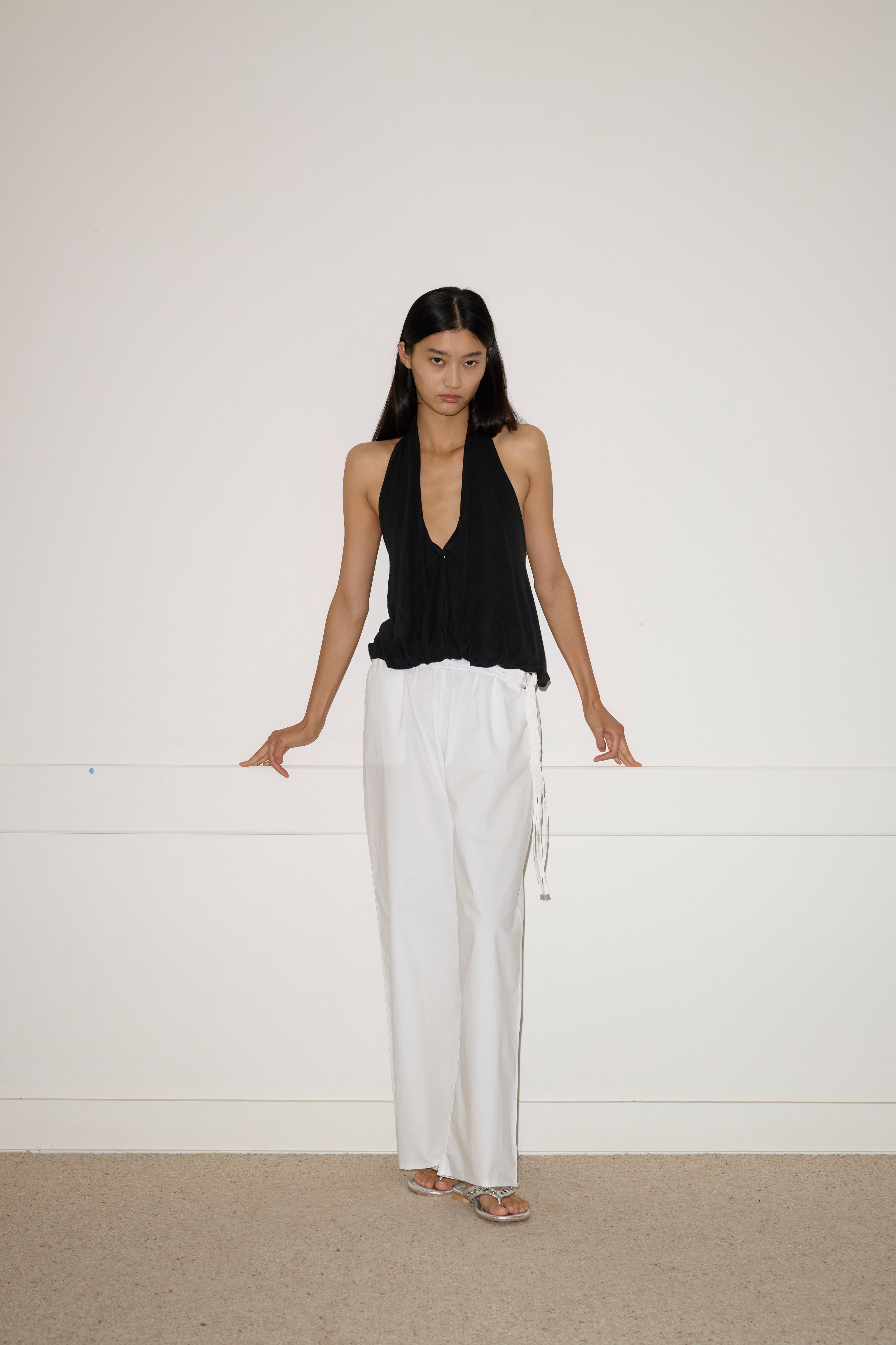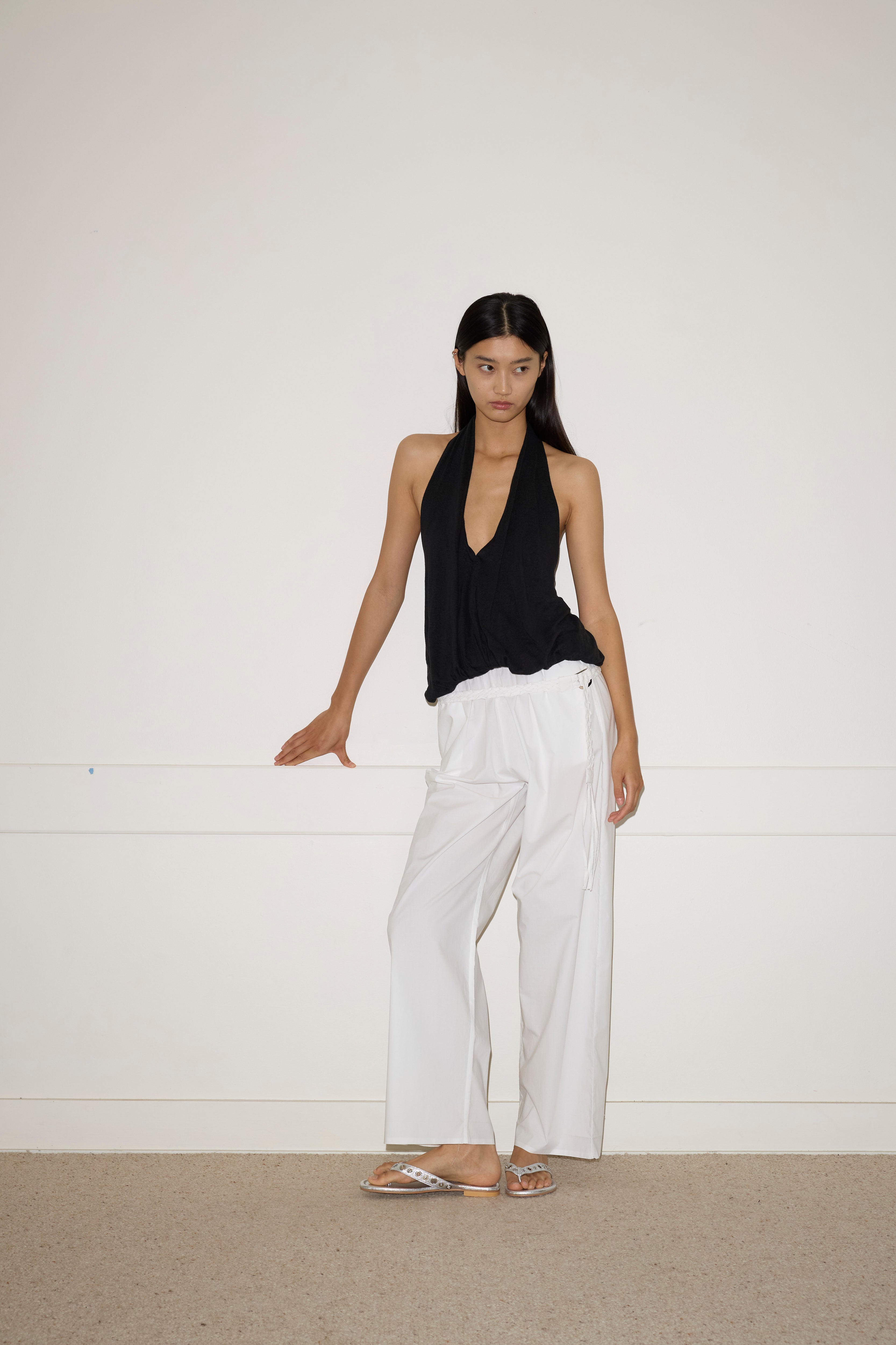 Relaxed halter top features flattering v neckline, soft wrap over with elasticated bubble-hem, low back in a relaxed silhouette.