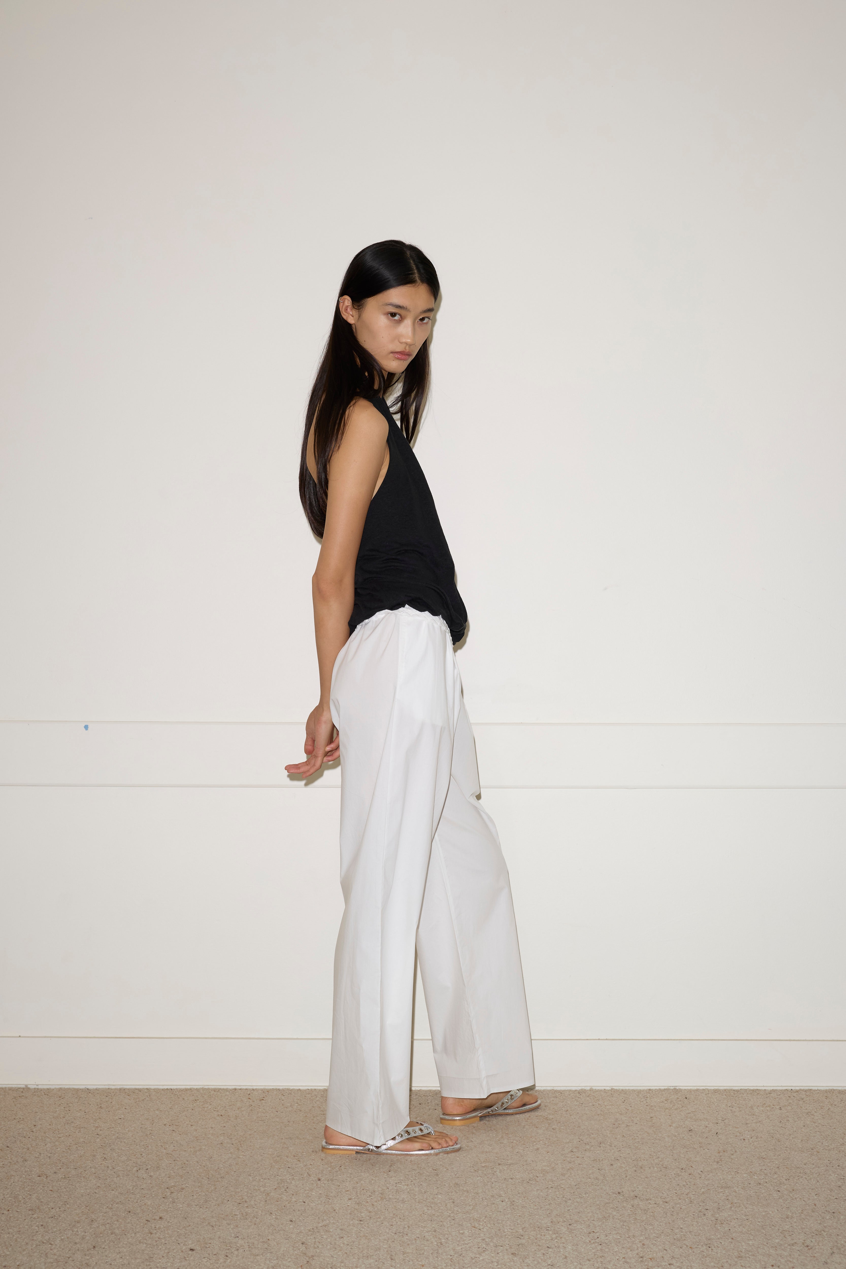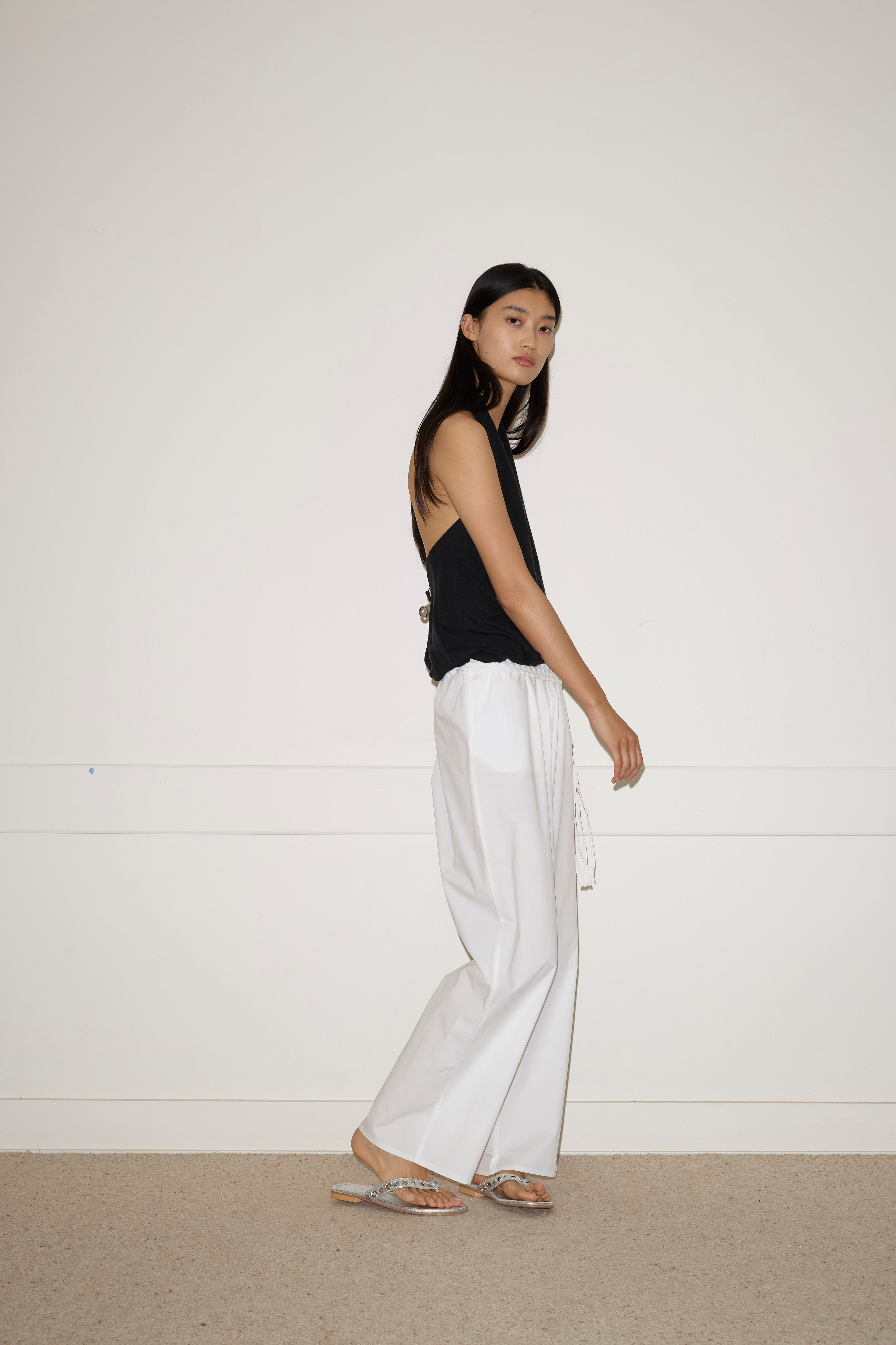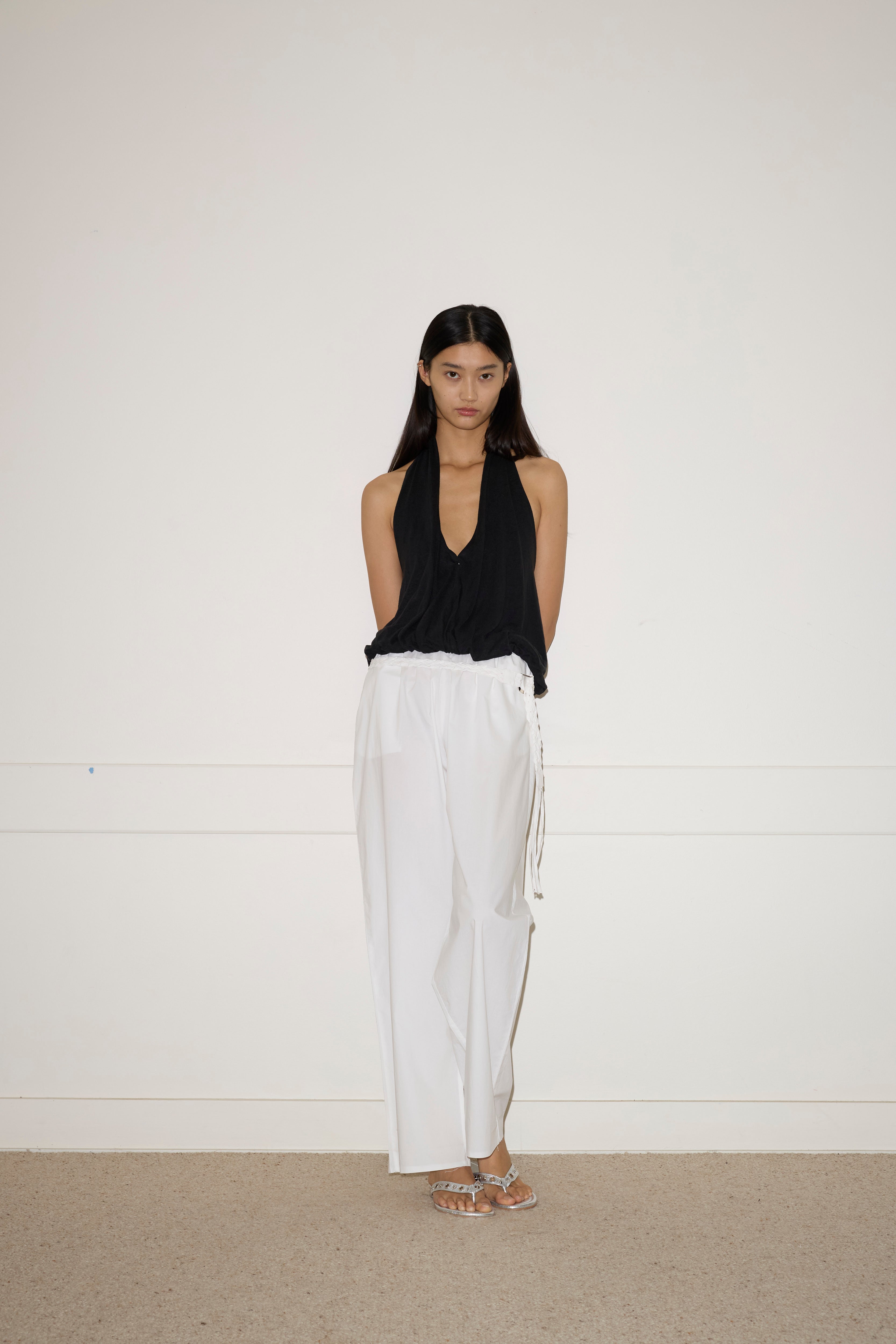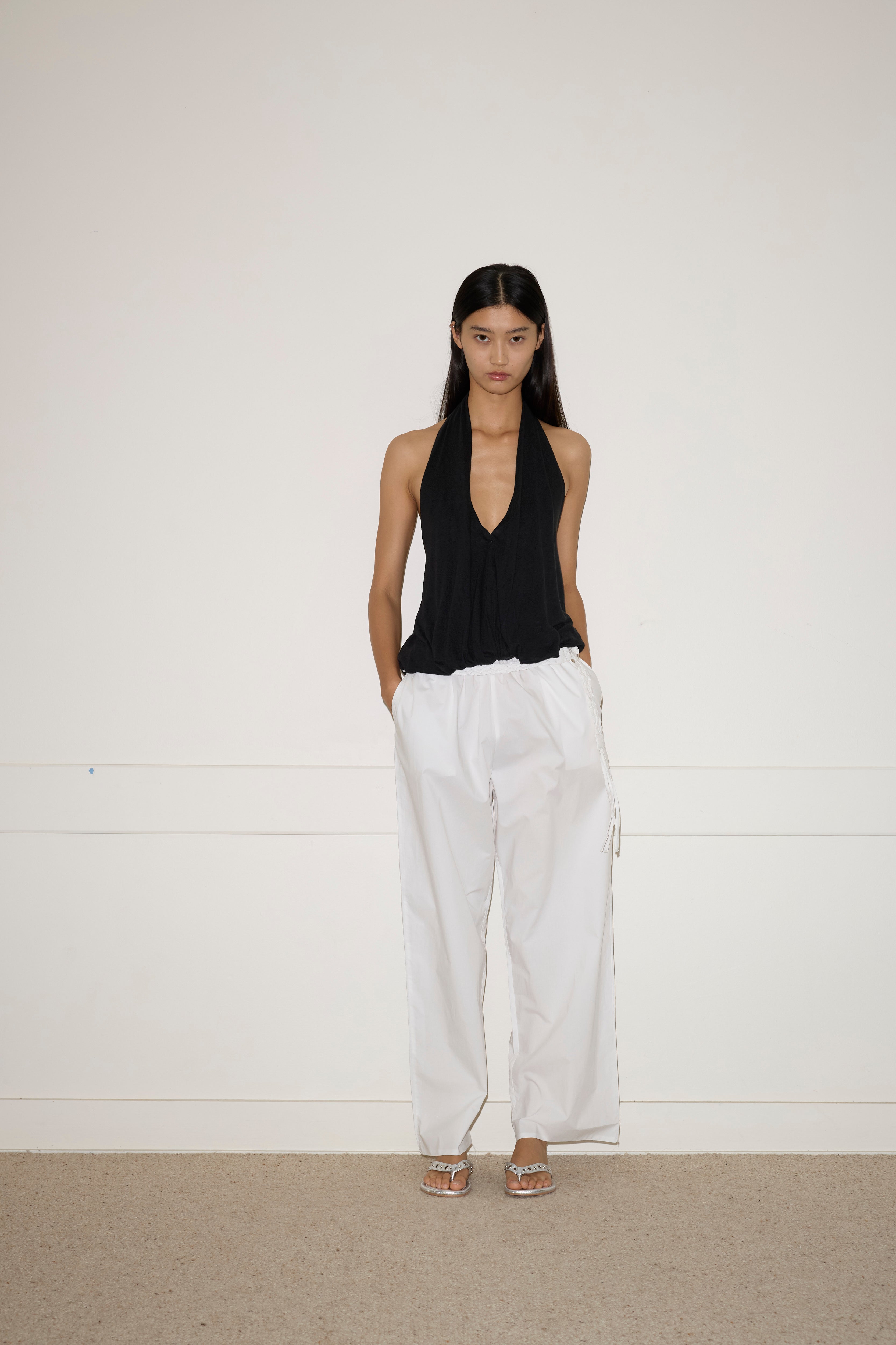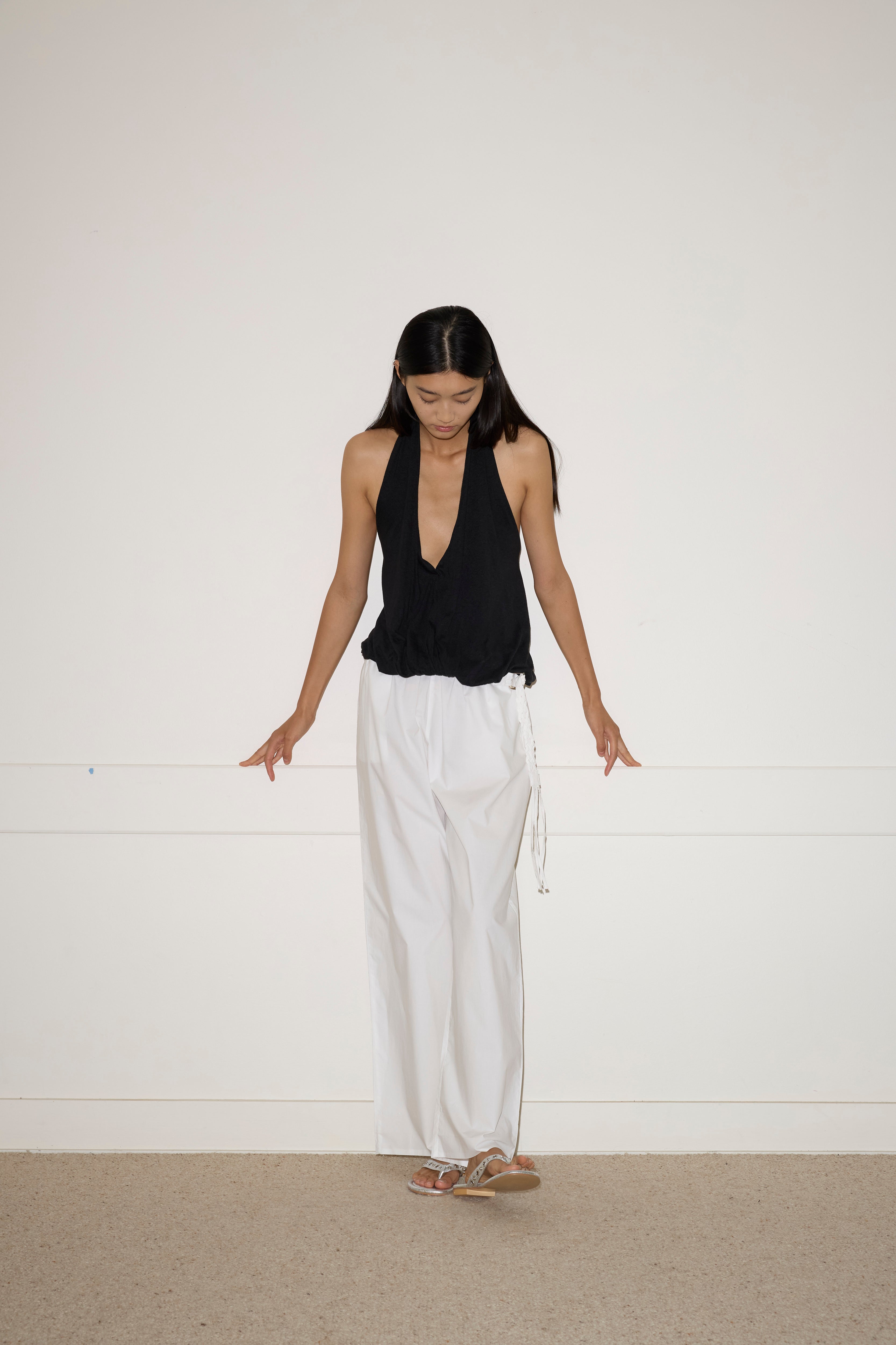 Relaxed halter top features flattering v neckline, soft wrap over with elasticated bubble-hem, low back in a relaxed silhouette.