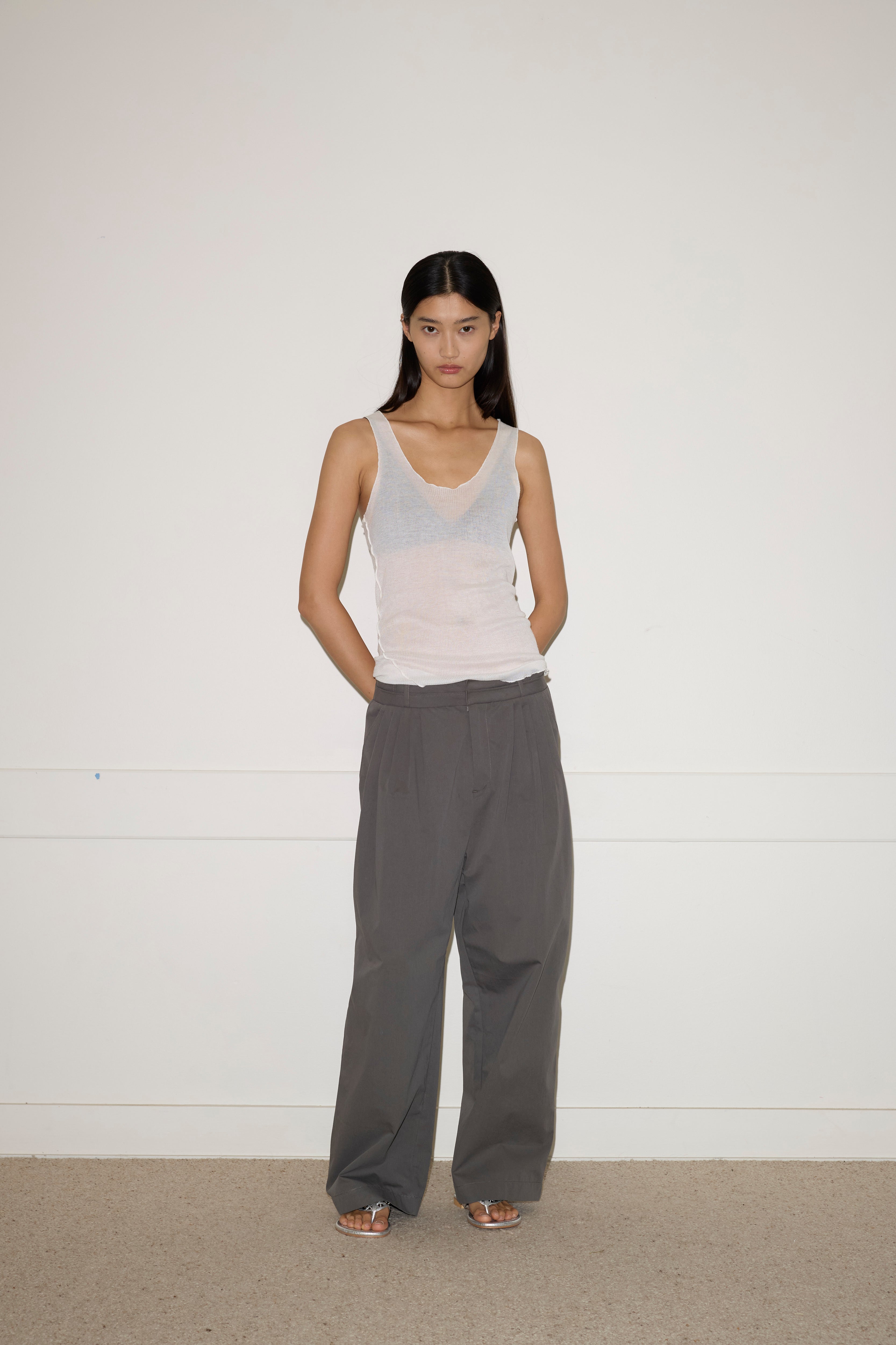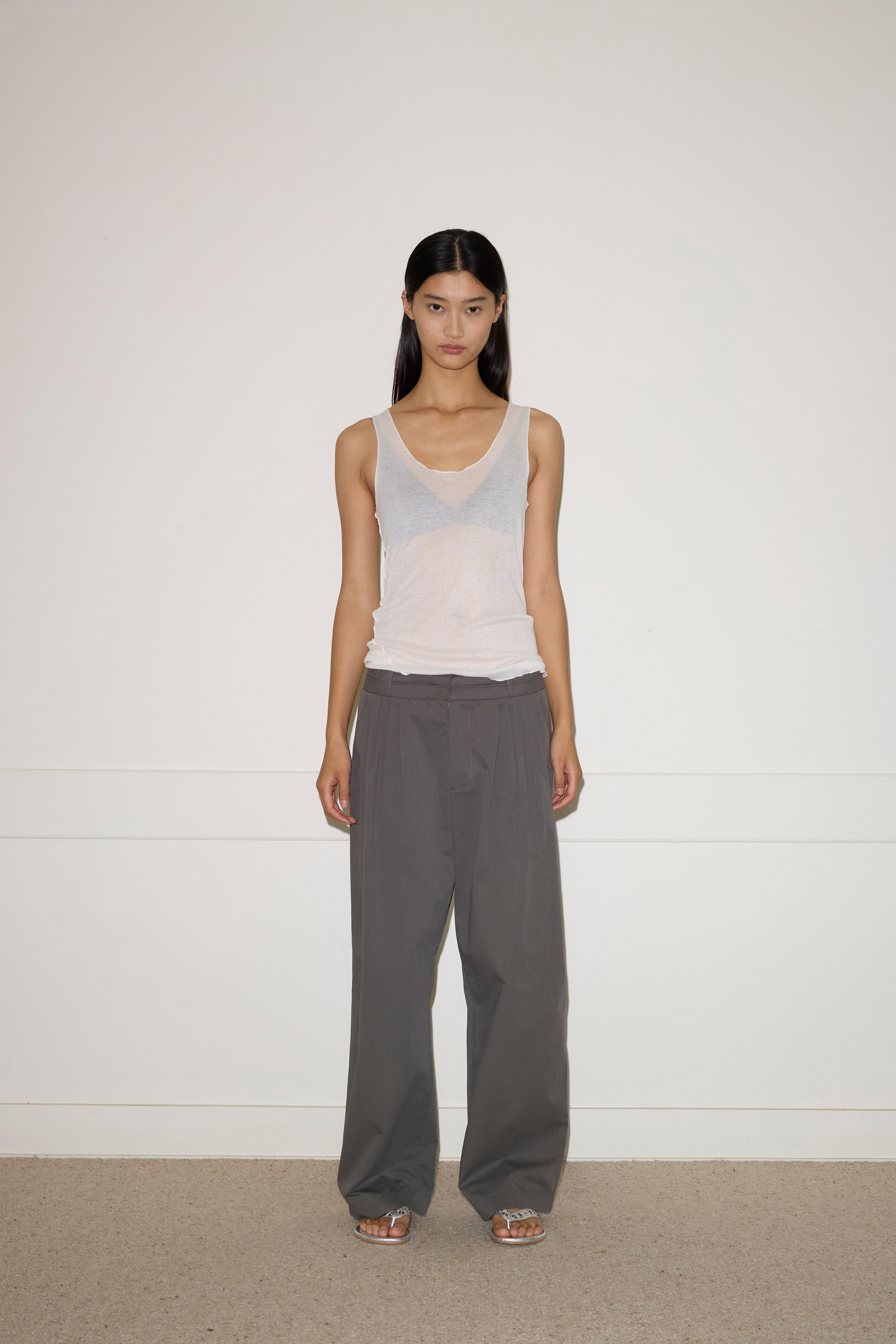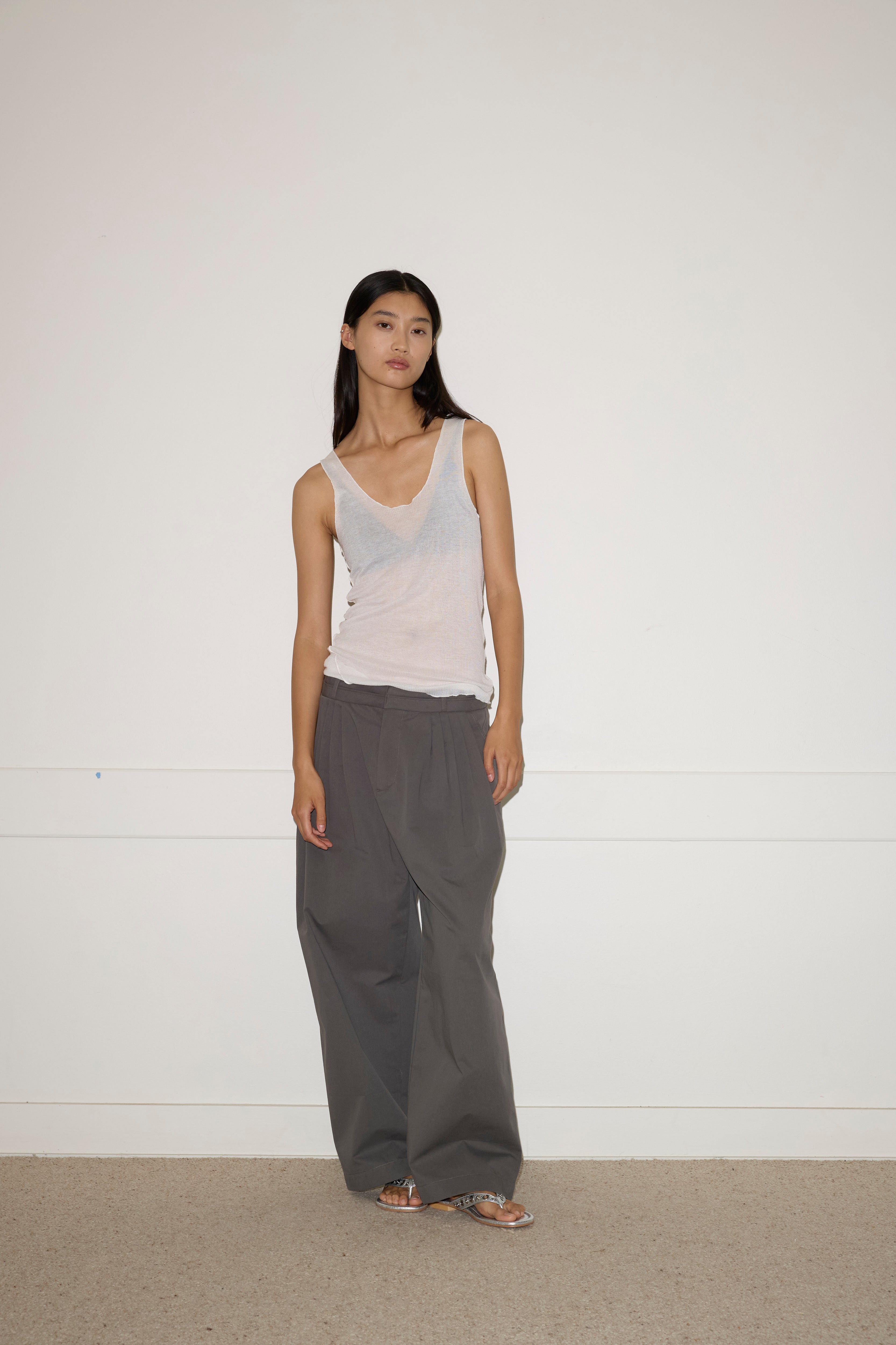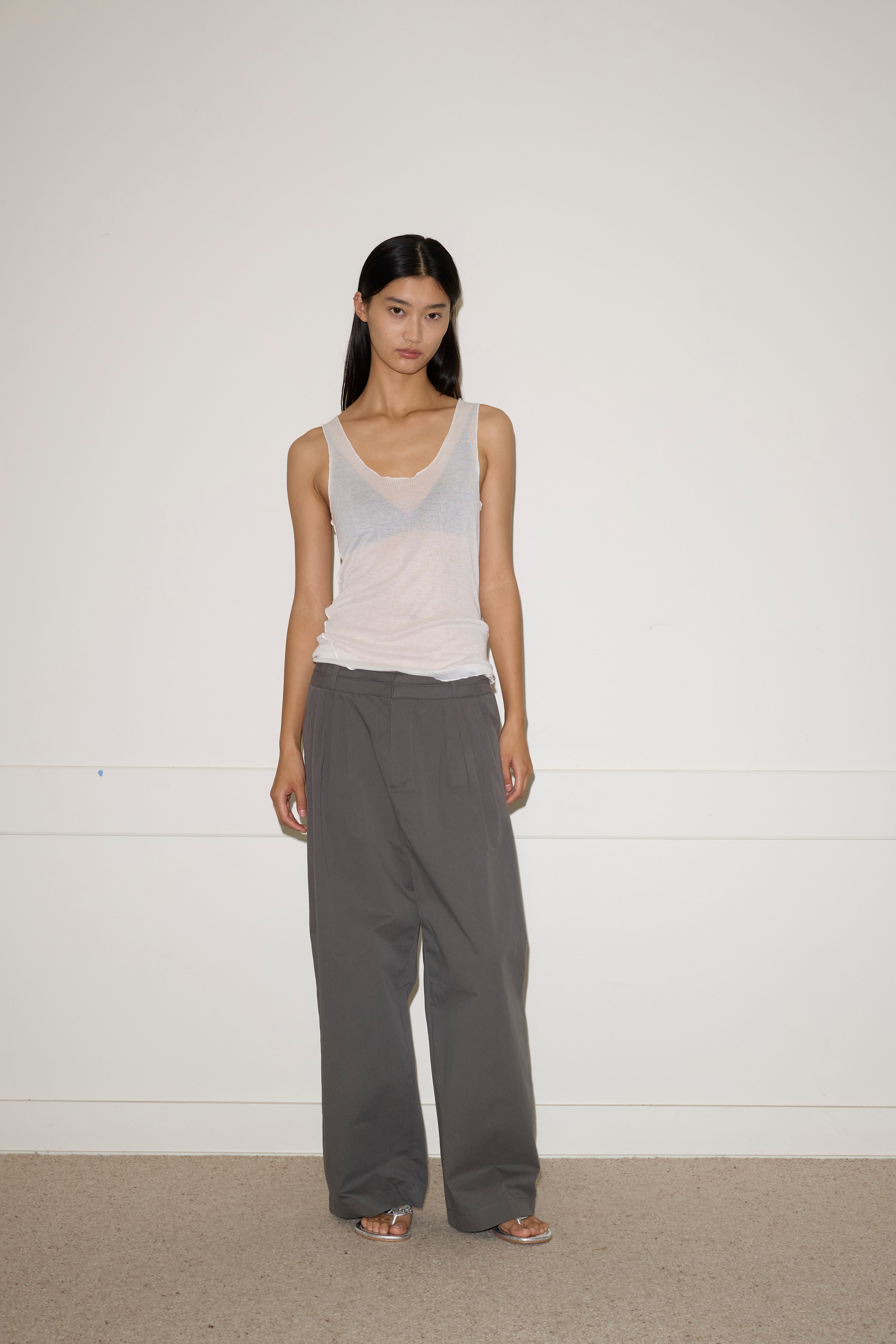 A softly structured full-length pant featuring a layered waistband detail with hook and eye closure and internal zip fly, gentle front tucks for volume, angled side seam pockets and a relaxed leg.