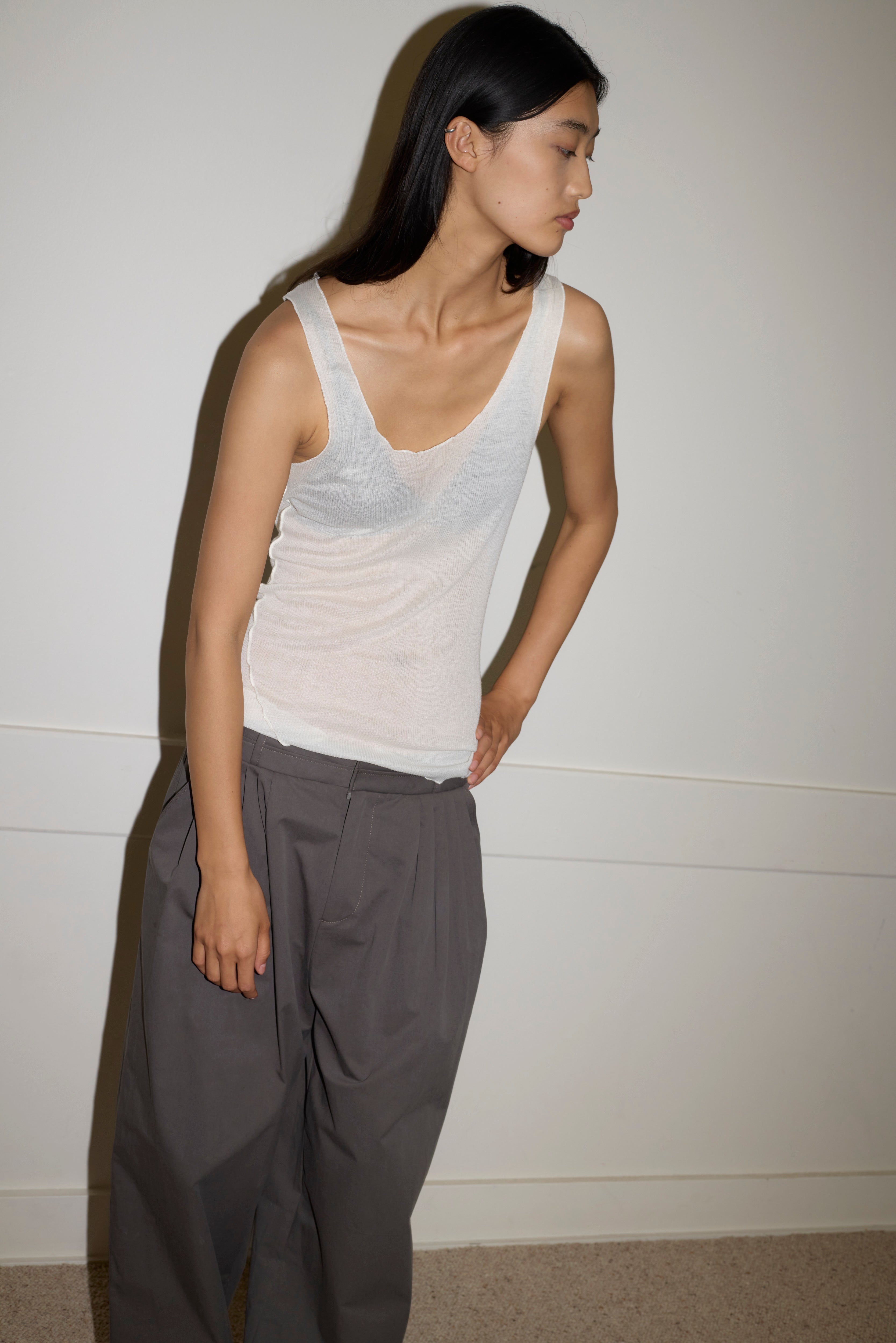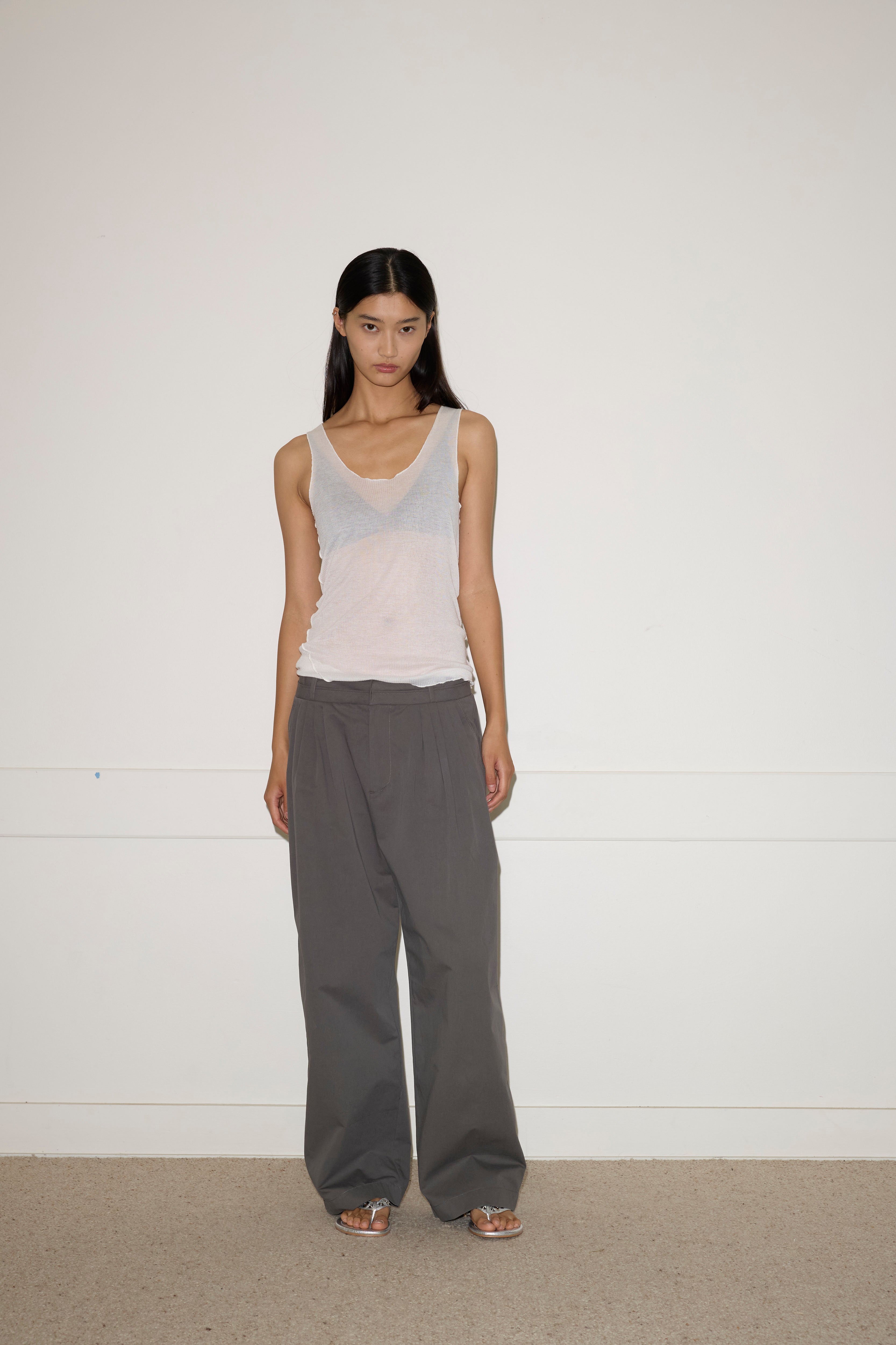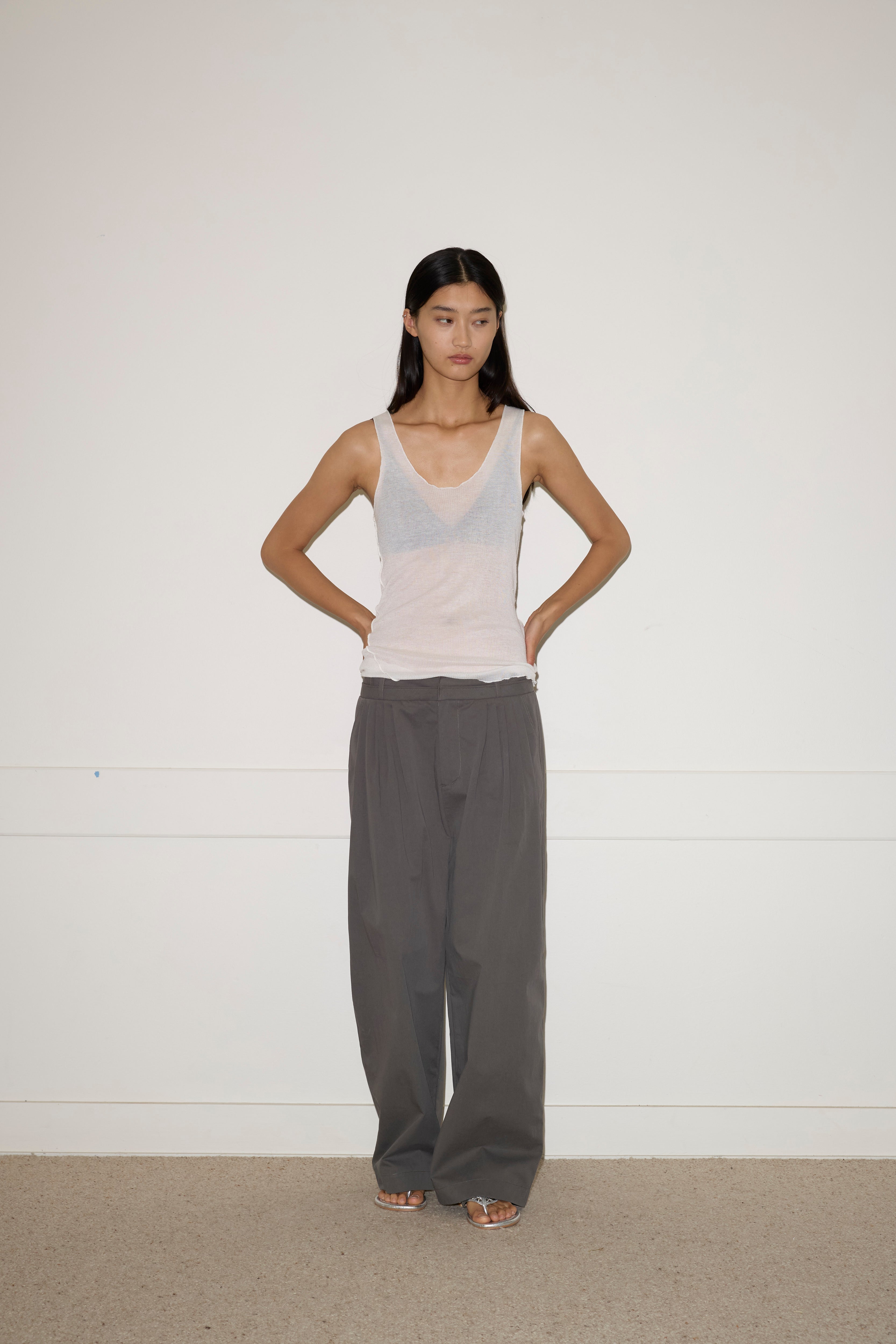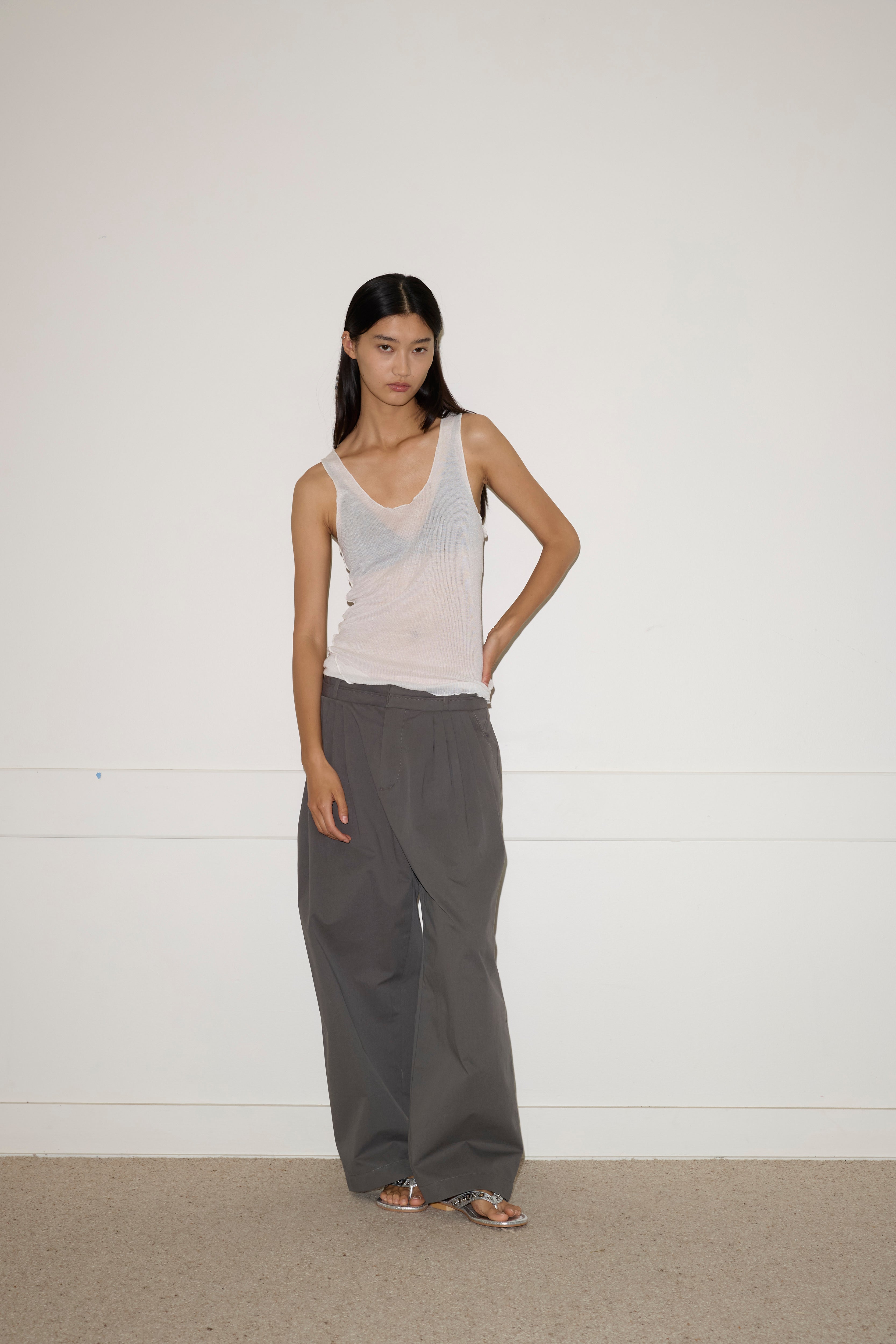 A softly structured full-length pant featuring a layered waistband detail with hook and eye closure and internal zip fly, gentle front tucks for volume, angled side seam pockets and a relaxed leg.