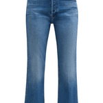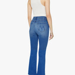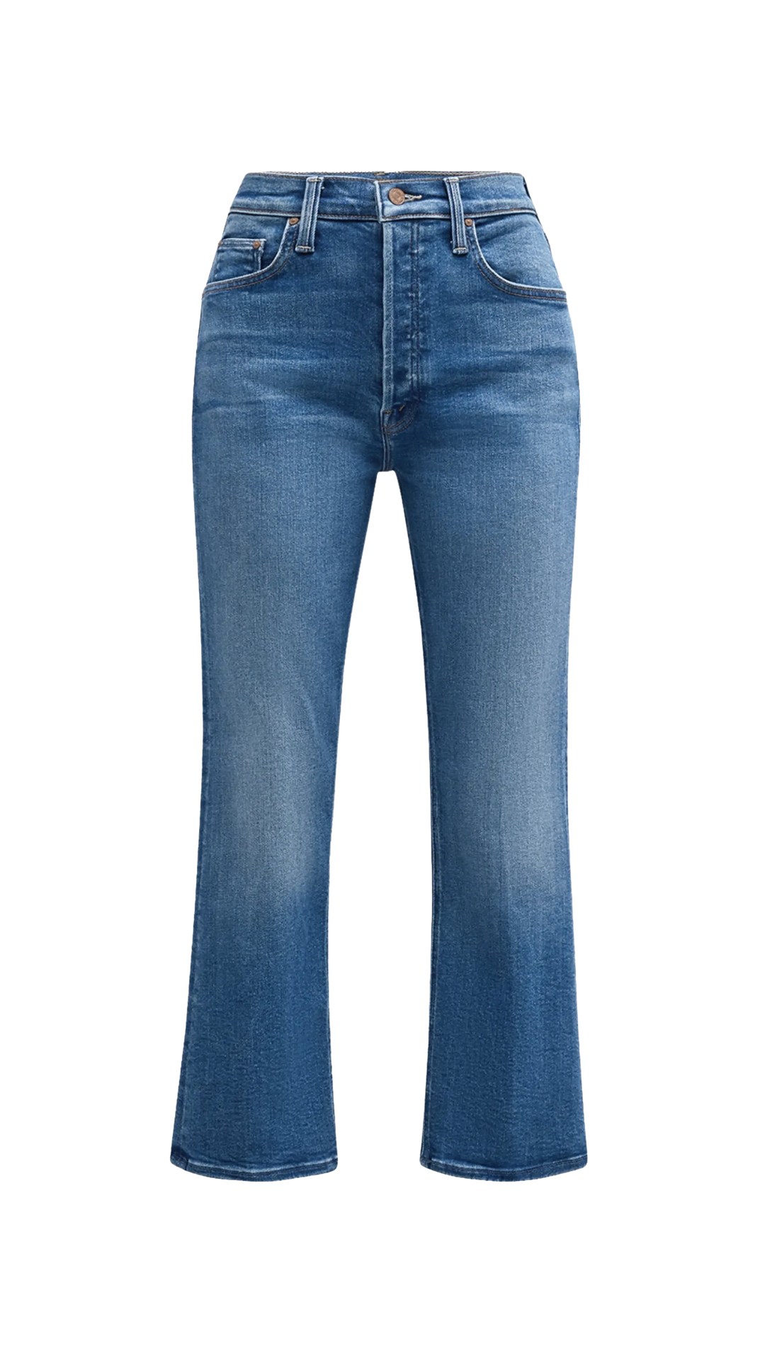 Mother's Work Hard Play Hard Tripper Ankle is a high-rise flare with a button fly and a clean ankle-length hem, crafted from stretch denim in a mid-blue wash with subtle whispering and fading at the knees.