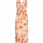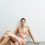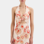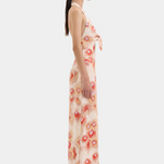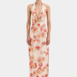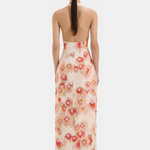 The Fiorella Tie Midi Dress in Petalo Lumina is made from SIR's midweight linen and features a feminine silhouette with watercolor inspired florals. It has a halter neckline with wide front ties, an open back, and a side split for comfort.