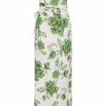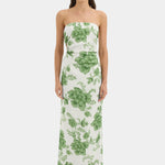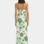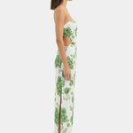 The Gardella Strapless Midi Dress features midweight natural linen with a unique SIR. floral pattern. It has a strapless design with a distinctive SIR. side cutout, gathered waist, and a side slit for comfortable movement.