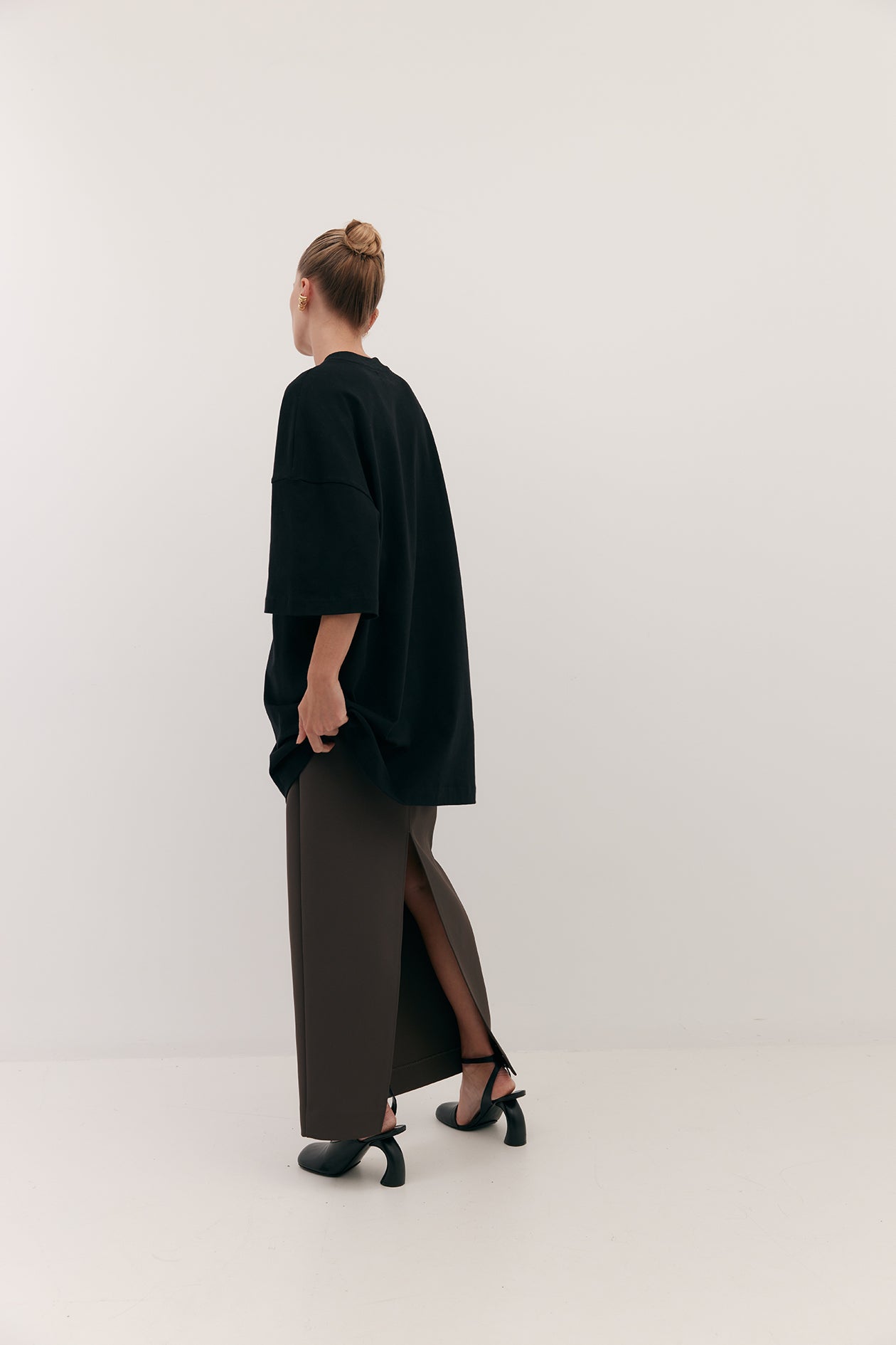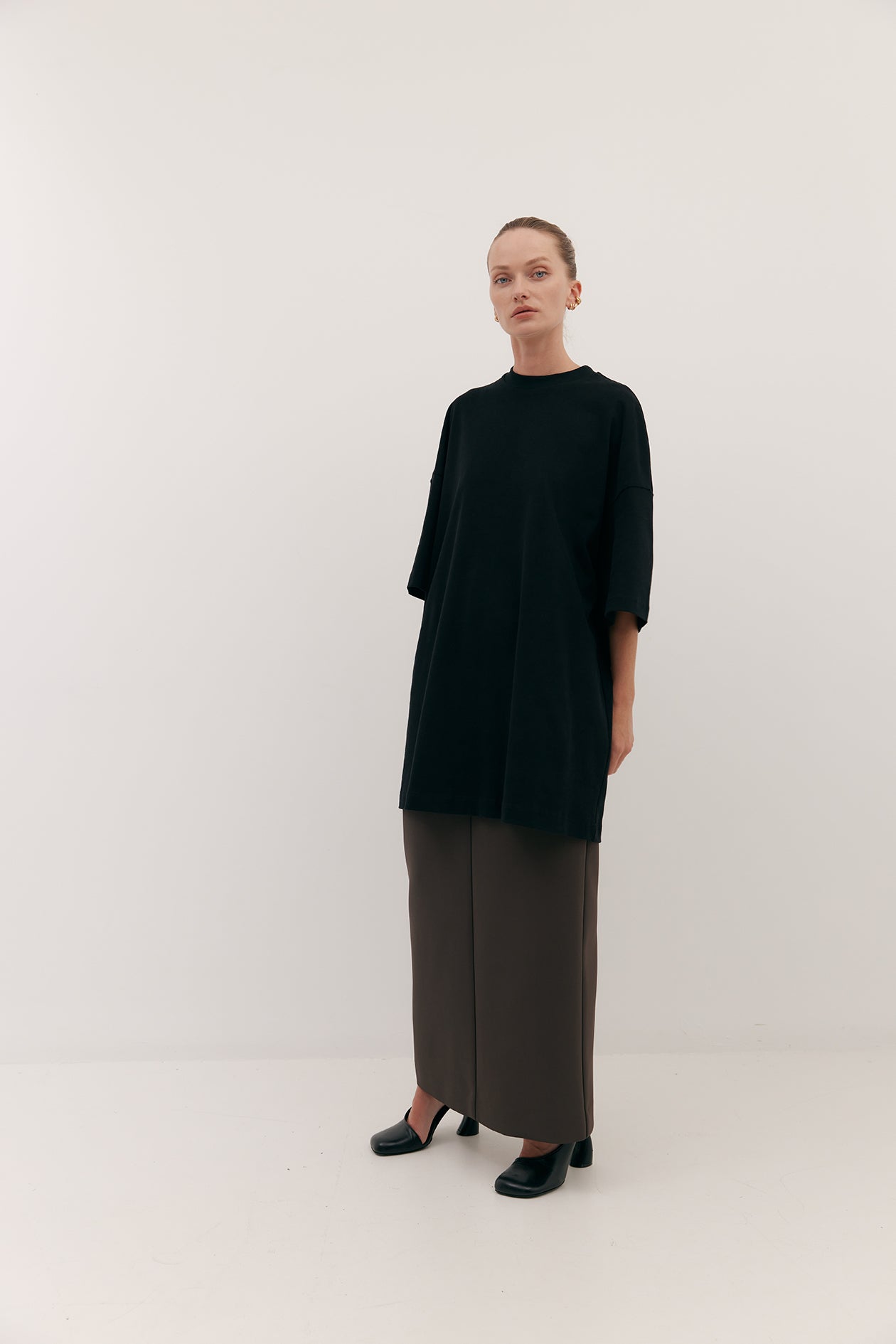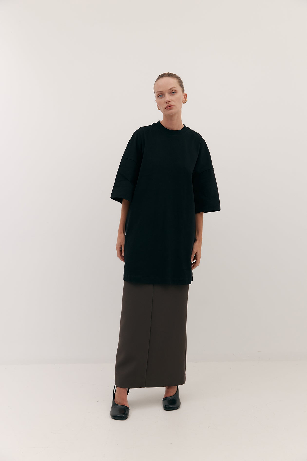 Cut in brushed cotton with a suede-like hand-feel. Drop shoulders and elbow grazing sleeves are intentionally designed for an oversized fit. Finishes mid-thigh.