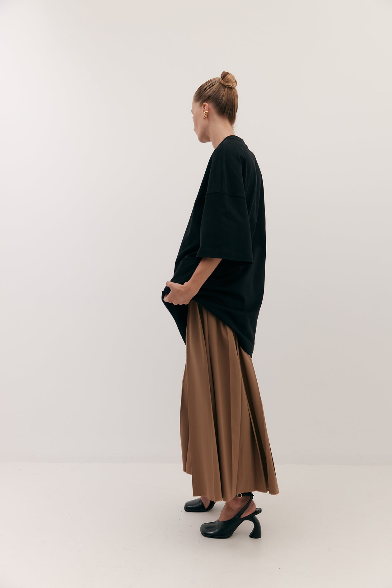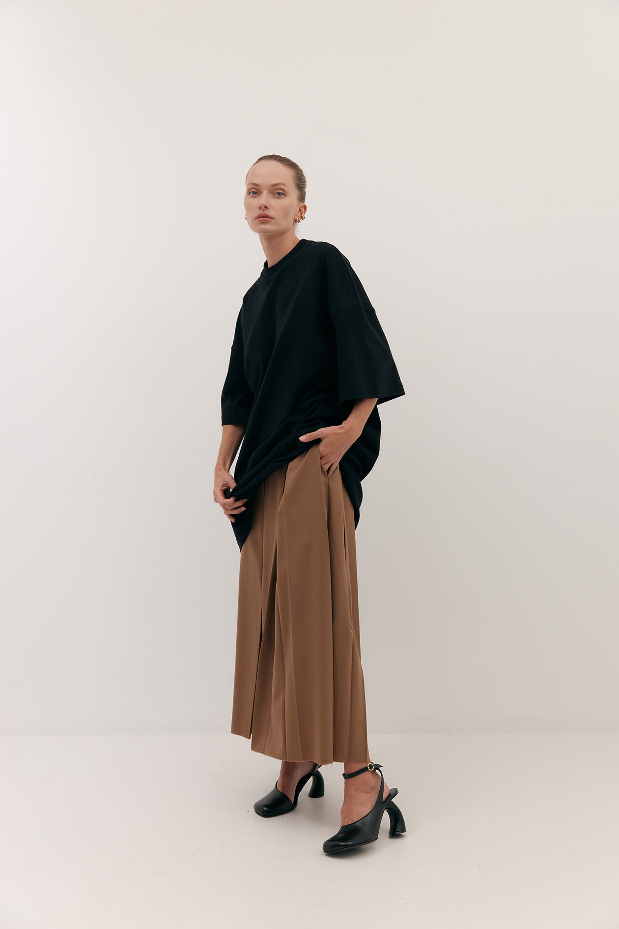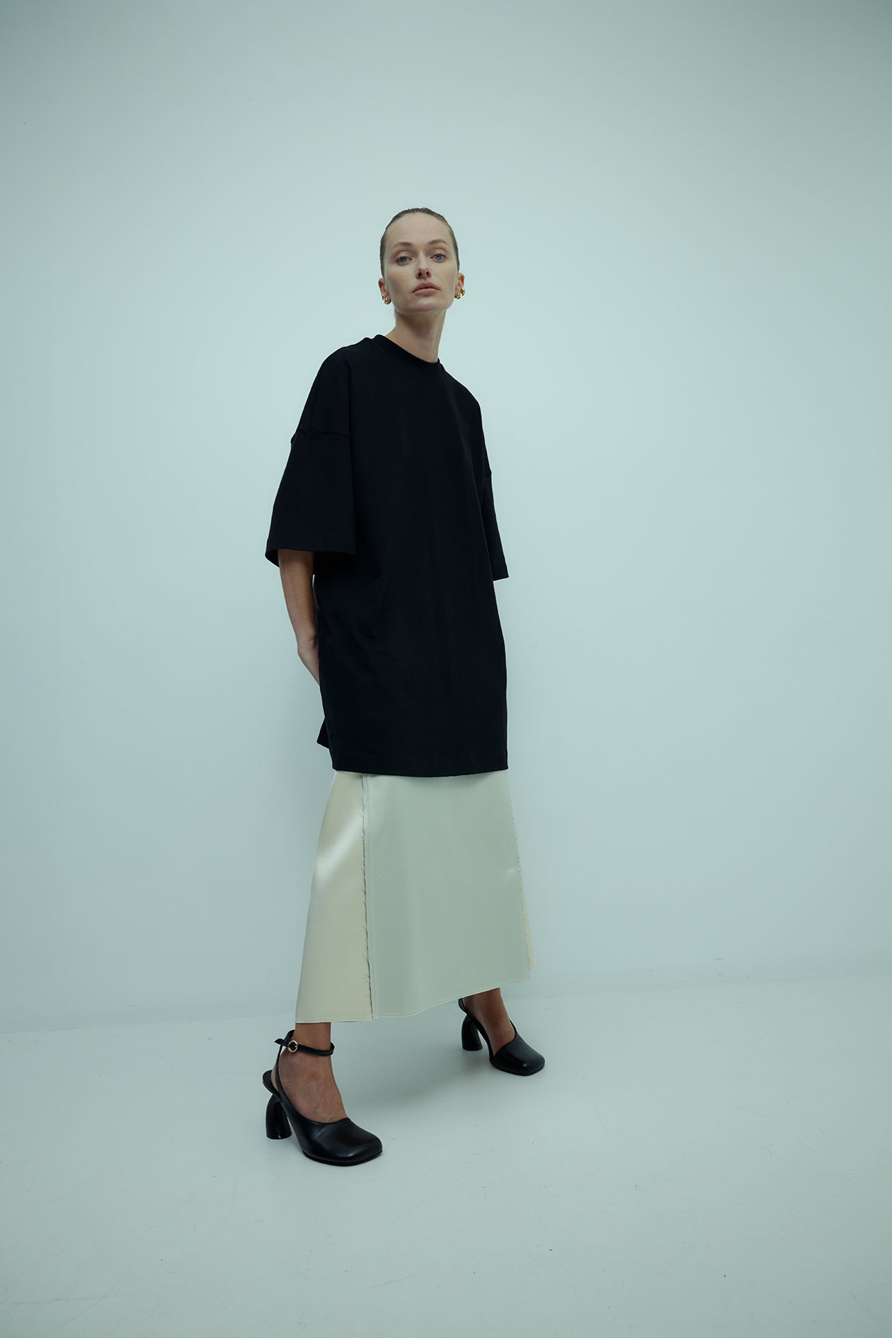 Cut in brushed cotton with a suede-like hand-feel. Drop shoulders and elbow grazing sleeves are intentionally designed for an oversized fit. Finishes mid-thigh.
