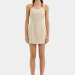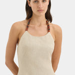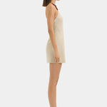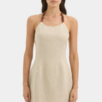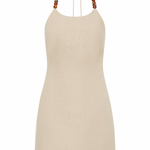 The Moretti Halter Mini Dress in Natural is made from our signature midweight linen, offering a soft and luxurious feel. It has a halter neckline with decorative beaded ties, a relaxed skirt, and shaping darts for a gently tailored look.