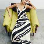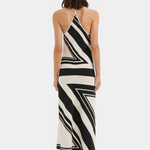 The Pietra V Neck Slip Dress in Milano Nero is a maxi silhouette made from matte silk crepe fabric, featuring a monochromatic geometric print. It is cut on the bias with a soft drape against the body and has a deep v-neckline and adjustable halter straps.