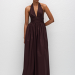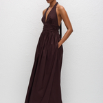 The Plunge Halter Dress in rich Aubergine is crafted from soft, sustainable Organic Cotton, combining comfort with elegance. Its fitted bodice accentuates the silhouette, while the elongated neck tie adds a sophisticated, adjustable detail. The dramatic low back offers a stylish, modern edge perfect for warm days or evening occasions. Pair this versatile dress with strappy sandals or heels to create a refined, polished look that transitions effortlessly from daytime events to night outings. A timeless piece that enhances your wardrobe with understated luxury and sustainable style.