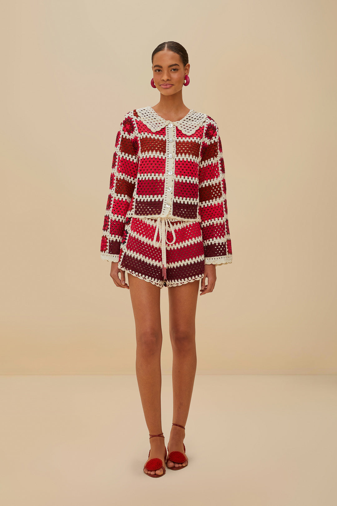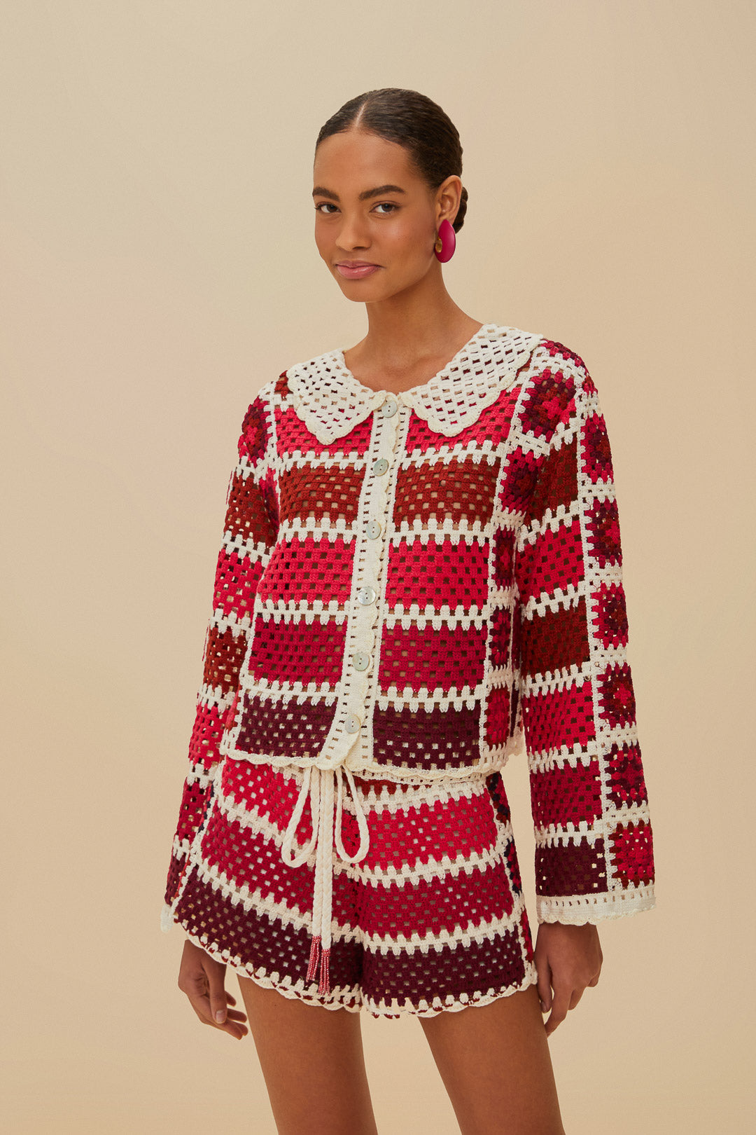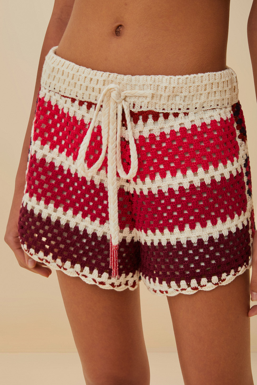 Discover FARM Rio's Red Colorful Crochet Tiles Shorts, showcasing an exquisite tapestry of reds, pinks, and rich maroon tones artfully crafted into a stunning crochet mosaic. These fashion-forward shorts feature a sophisticated tile-inspired pattern with luxurious texture and artisanal quality. The comfortable elastic waistband and breezy silhouette combine practicality with elevated style—the ultimate statement piece for sun-drenched days when effortless sophistication is your aesthetic goal.
