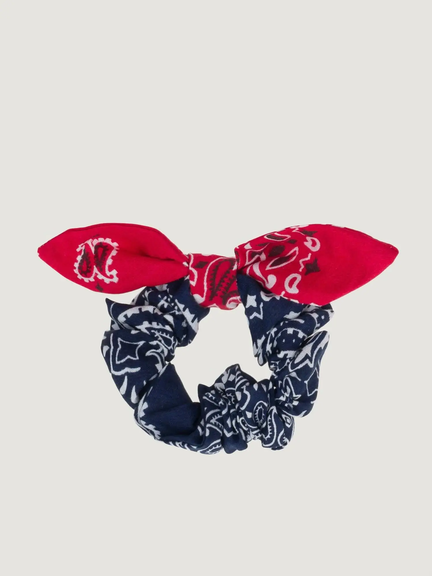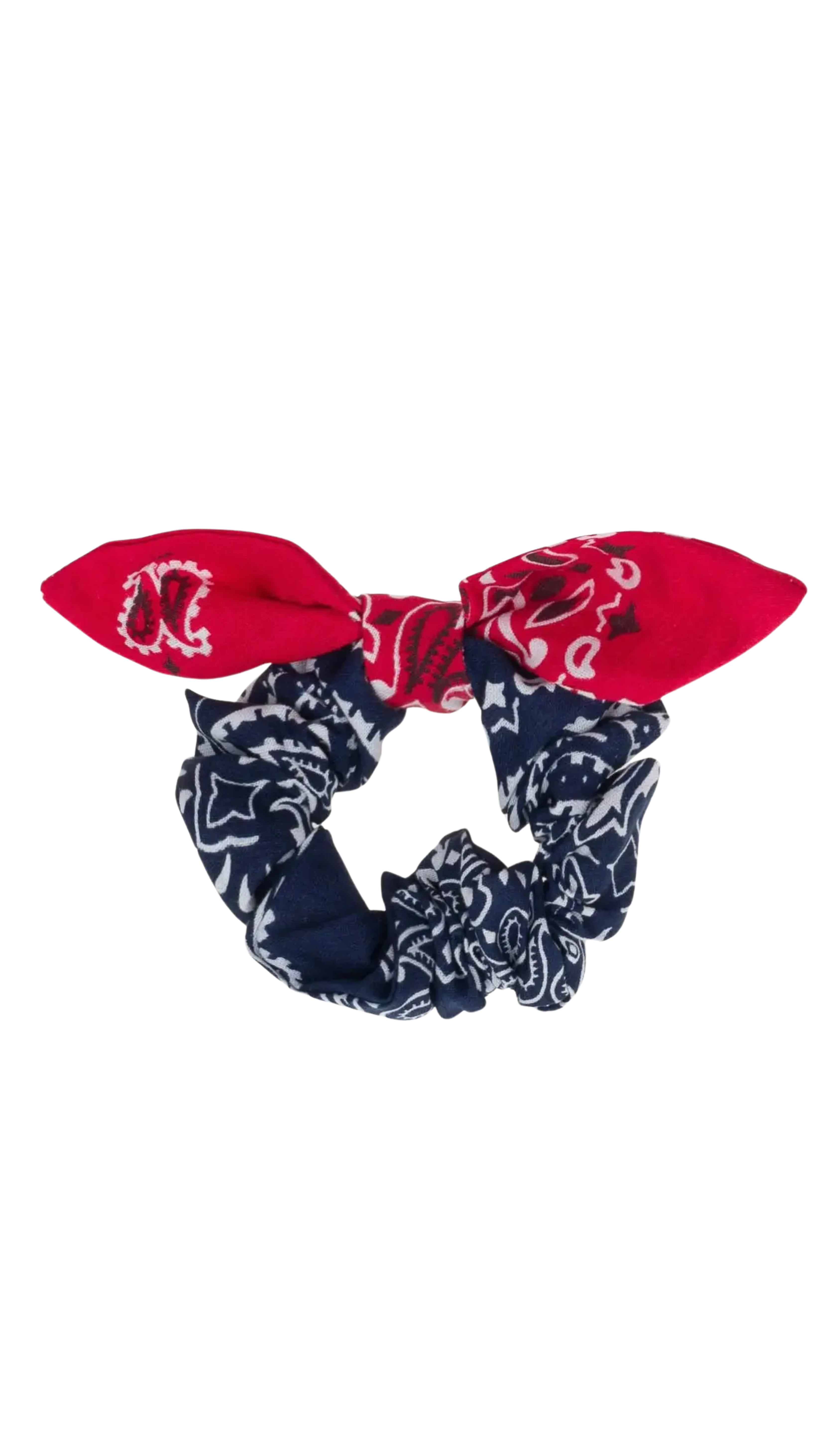 The Navy & Real Red Scrunchy reimagines a timeless accessory with flair. Made from 100% cotton, it offers a soft yet sturdy grip that treats your hair gently. Handmade in the USA, each piece is one-of-a-kind, featuring subtle dye variations from unique dye baths. Its deep navy background paired with vivid real red highlights delivers a bold statement, perfect for elevating everyday looks or adding sophistication to special events. Crafted from leftover bandana fabric, each scrunchy is sold separately.