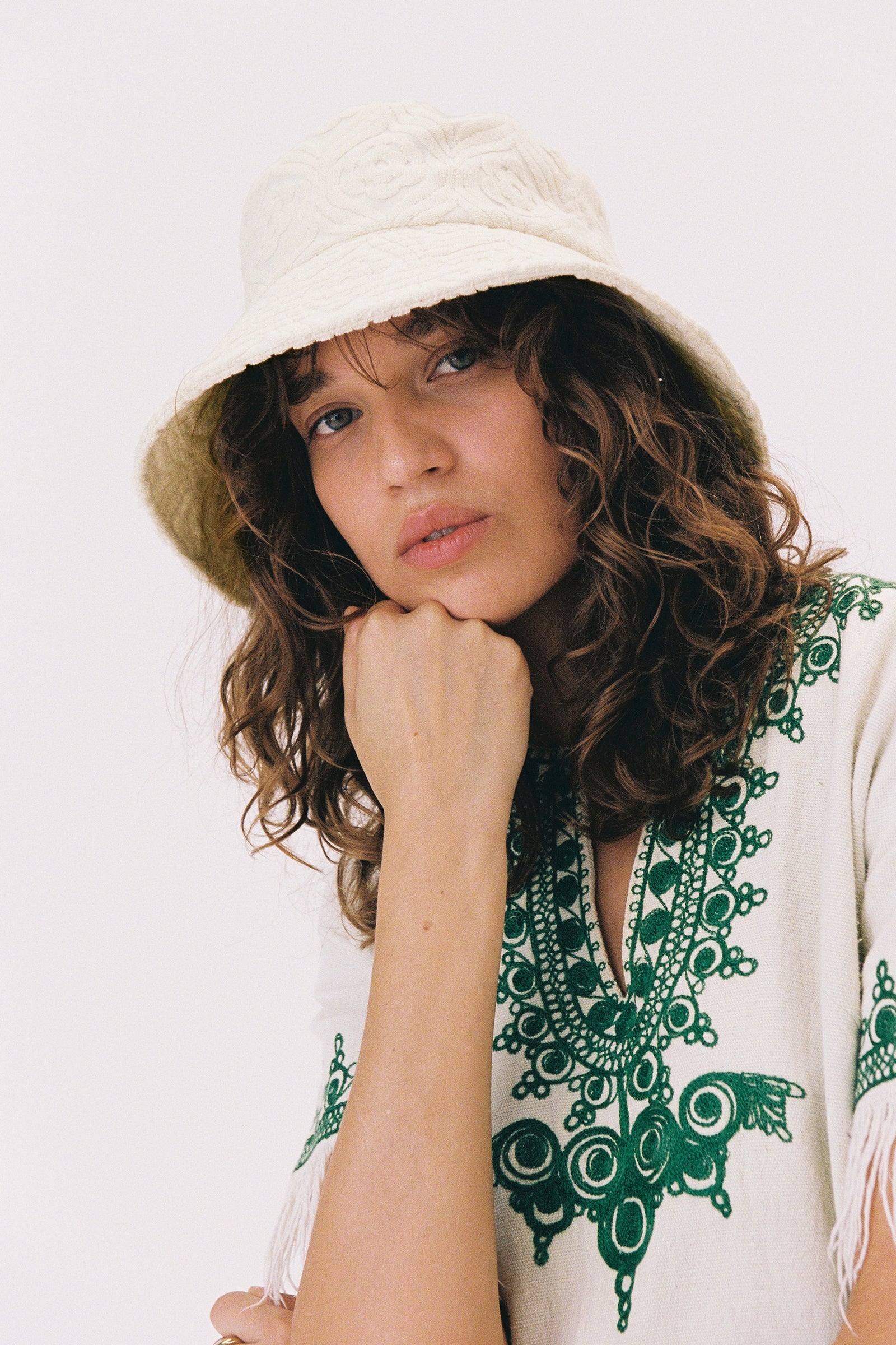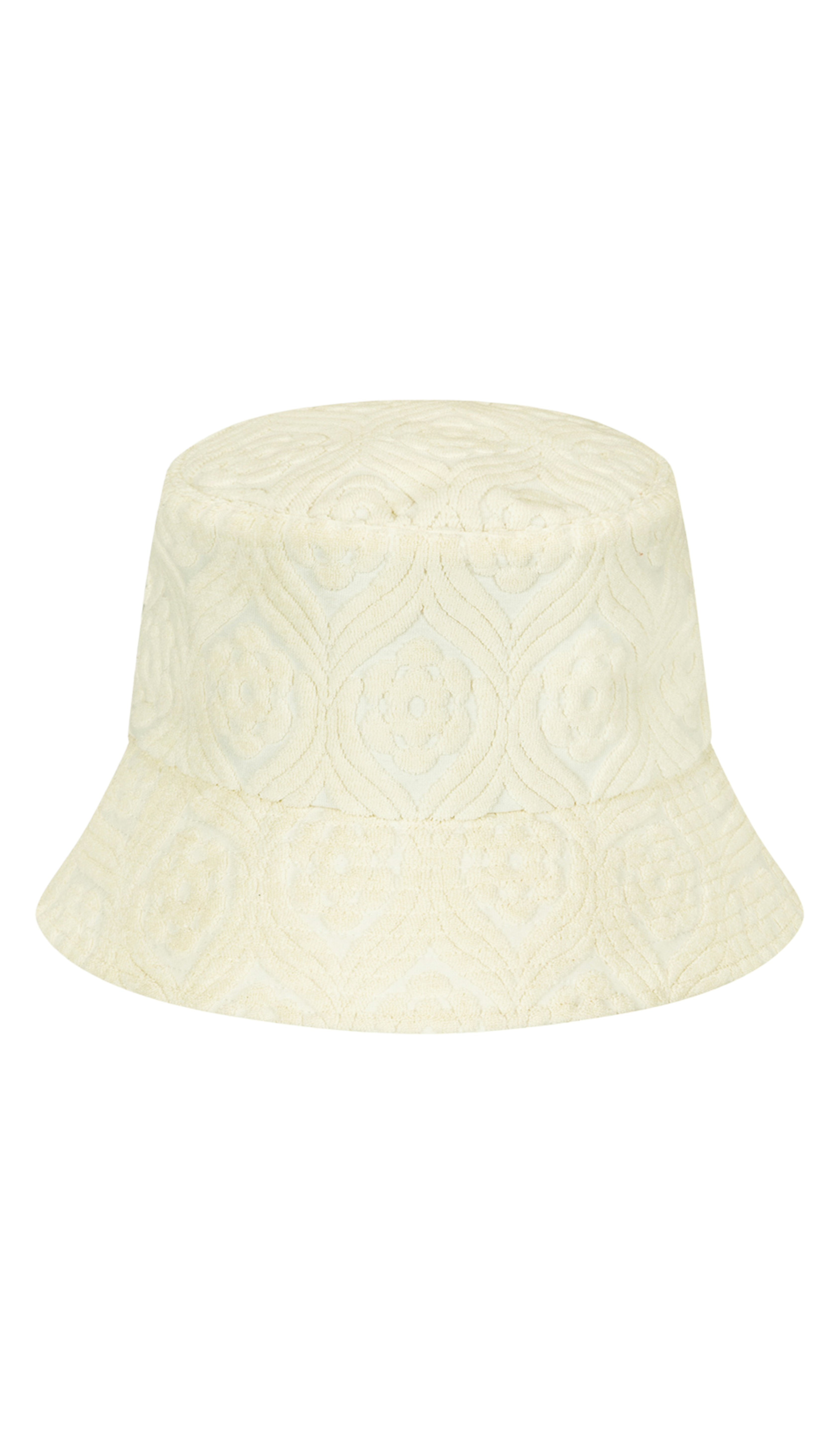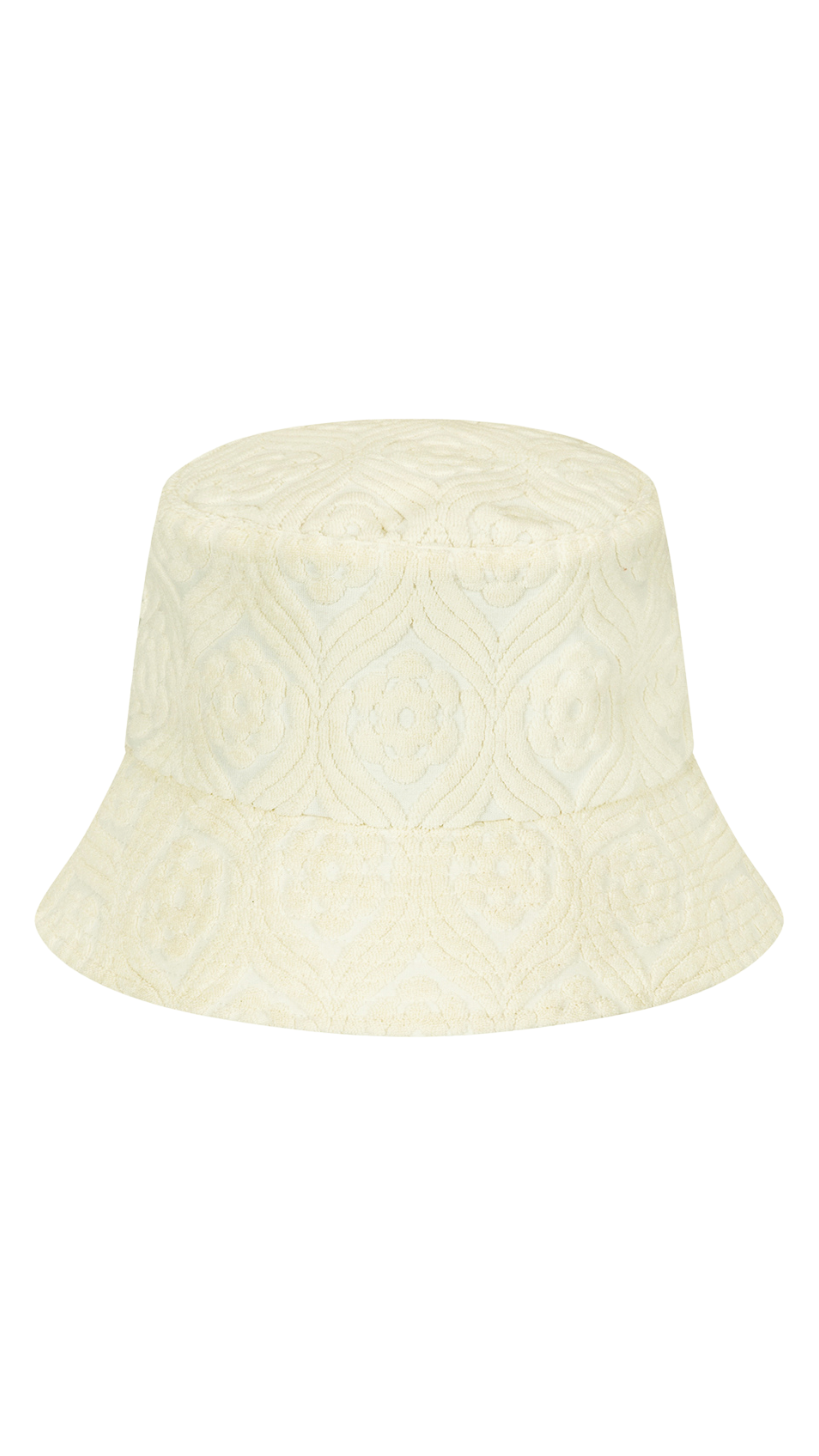Made from a comfortable cotton blend, the Palm Bucket in Cream features a neutral cream tone that is easy to style with your summer wardrobe. Its brim offers practical sun protection, while the playful tone-on-tone Terry print adds subtle texture and style. Lightweight and breathable, this bucket hat is perfect for sunny beach days, outdoor activities, or casual outings. Easy to pair with your favorite summer outfits, it combines fashion and function for an effortless seasonal look.