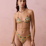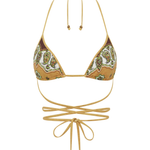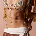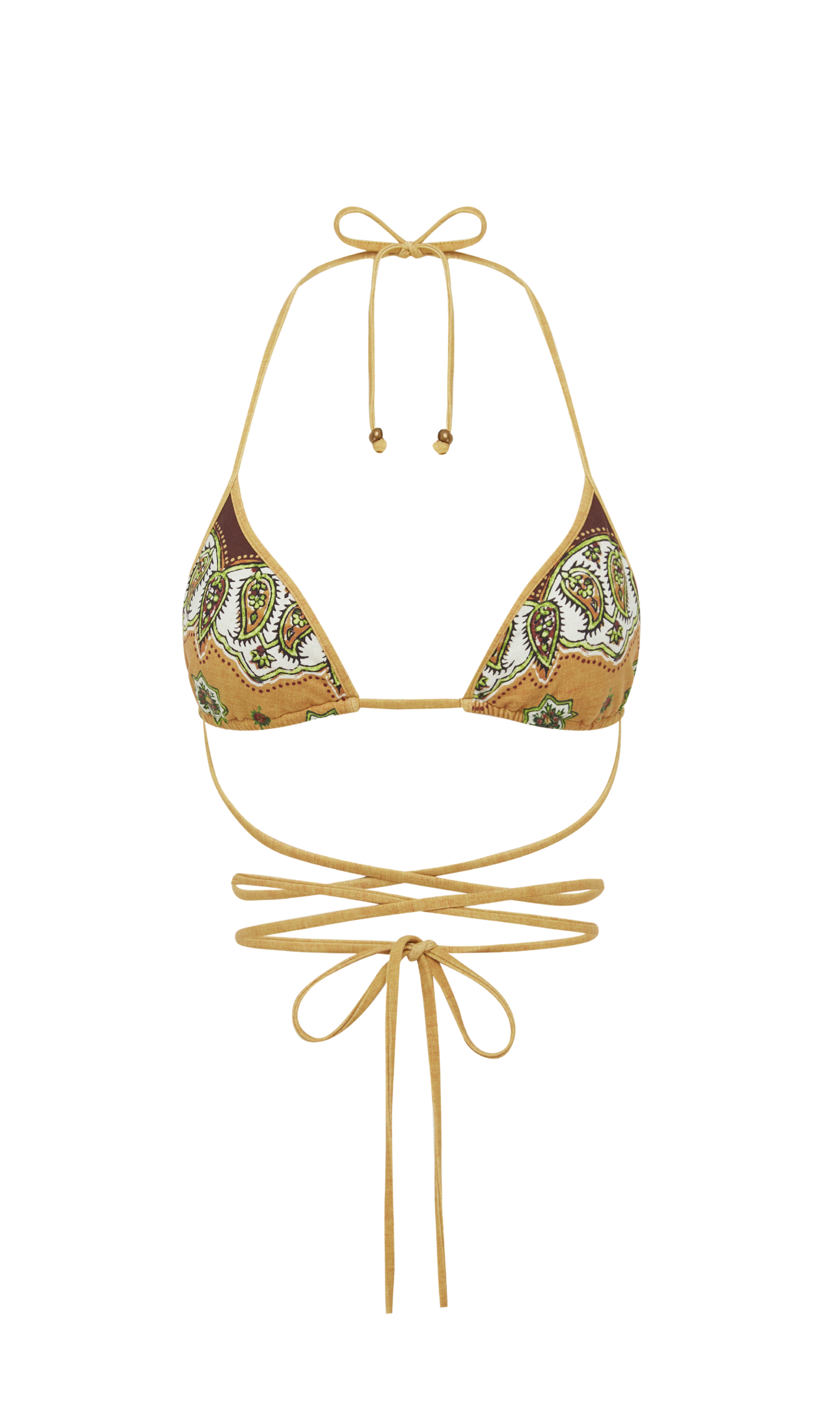 Introducing the Alhambra Paz Tri in Tierra—a versatile triangle bikini top that seamlessly transitions between styles. Crafted from regenerated polyamide and elastane, this piece combines sustainability with superior comfort and durability. The removable cups offer customizable coverage, while adjustable straight back straps can be worn traditionally over the shoulder or styled as a flattering halter. An innovative feature includes extra-long underbust straps designed to tie around your midriff, creating a chic, secure fit that works with various body types and swimwear preferences. Whether you're lounging poolside or catching waves, this adaptable top delivers both confidence and effortless elegance.