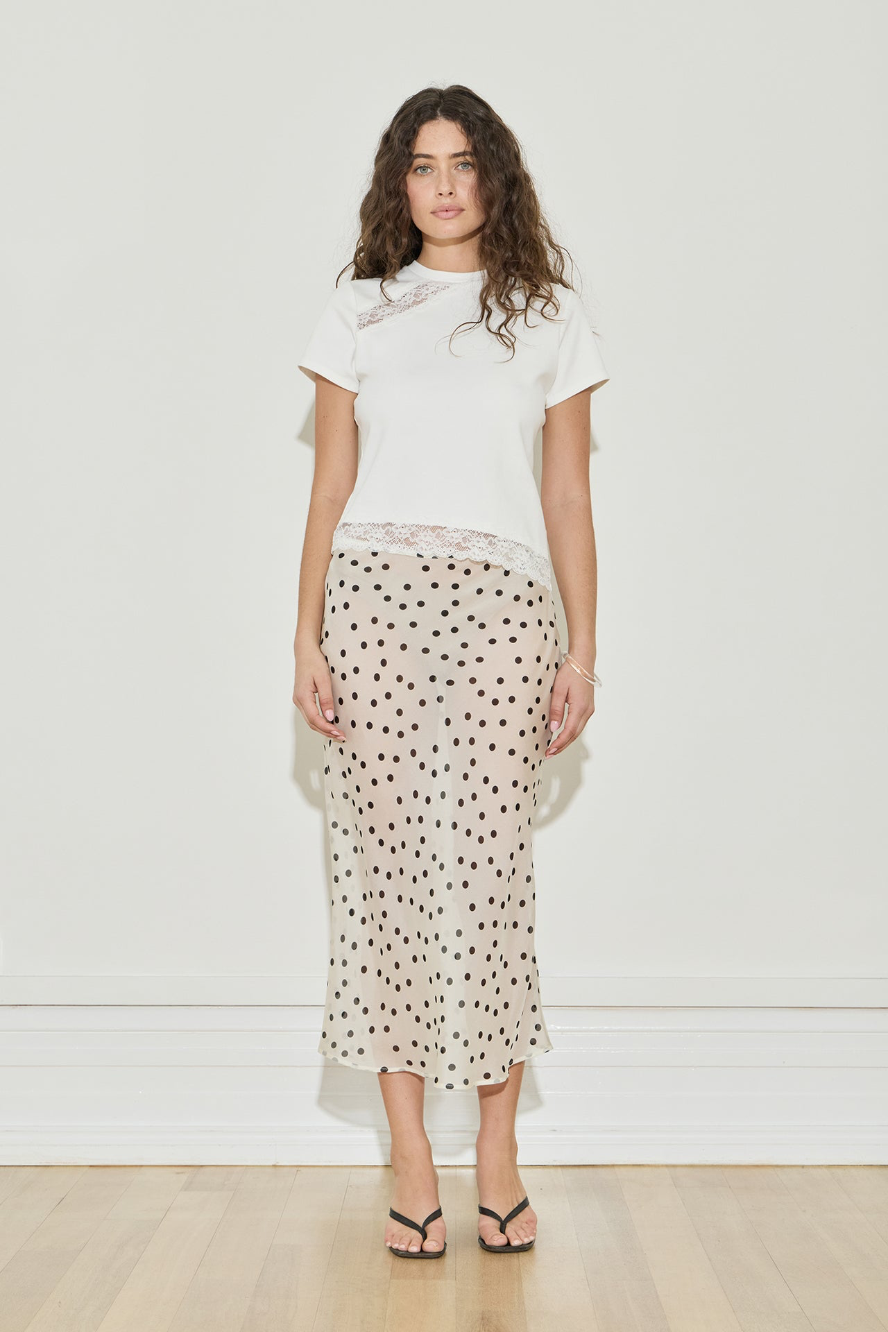 The Lace Trimmed Baby Tee presents a sophisticated version of a fundamental garment, characterized by a traditional silhouette complemented by asymmetrical lace accents at the shoulder and hem. The model, an AU size 8, is wearing a size small. This piece includes a classic crew neckline and lace trim features, along with an asymmetric hemline.