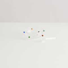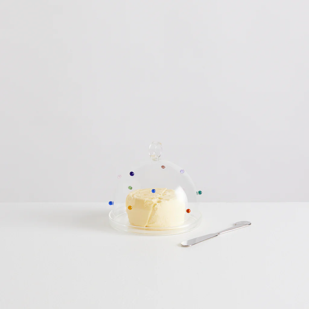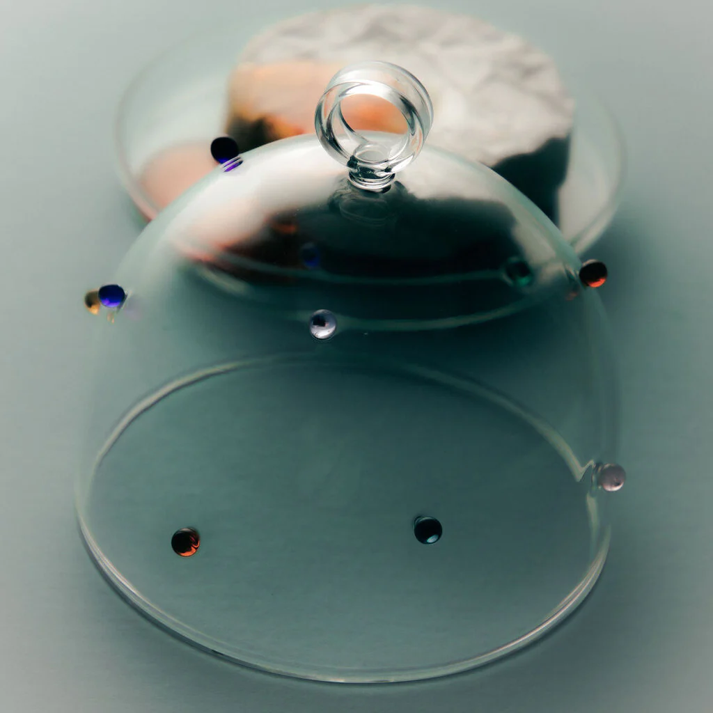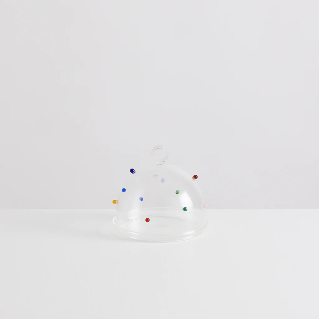 Display your finest pastries, artisanal cheeses, and baked goods beneath this elegant glass bell. Handcrafted from premium borosilicate glass in a striking clear and multicoloured design, each piece is individually blown, creating subtle variations that enhance its sophisticated appeal. These natural imperfections are a hallmark of authentic craftsmanship and won't compromise the bell's stunning appearance or practical function. Perfect for adding a touch of refined elegance to your table.