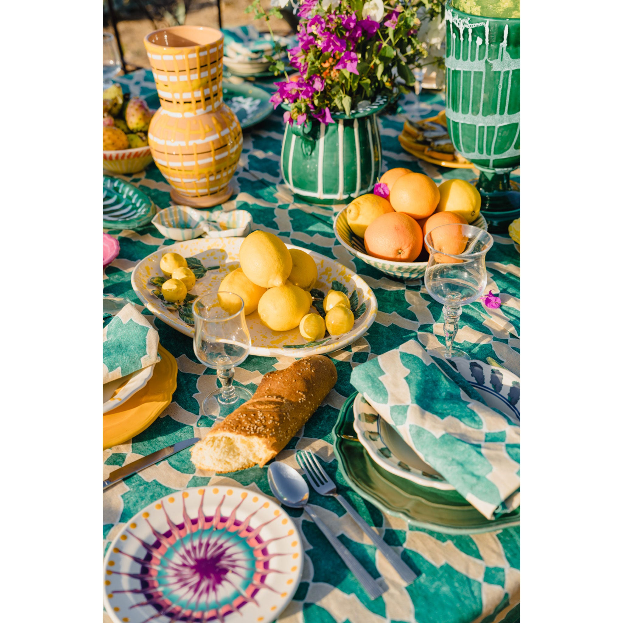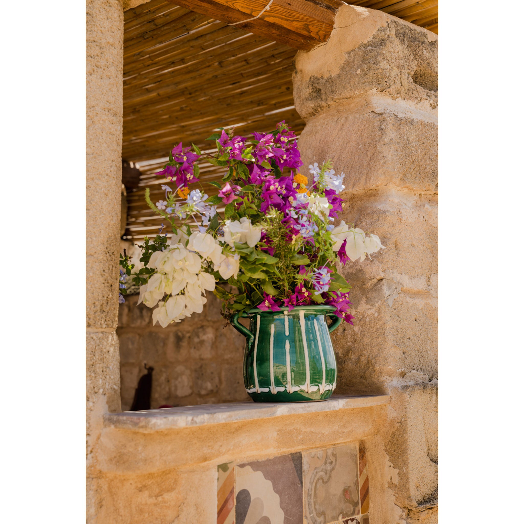 Handcrafted in Puglia, Italy, this striking ceramic piece marries form and function with effortless elegance. The luminous sea green glaze, accented with crisp white detailing, makes it equally at home as a table centrepiece for special occasions or a sculptural accent throughout your interior. Each vase is individually hand-painted by skilled artisans, ensuring no two pieces are identical. Diameter 21cm (excluding handles), height 19cm. Ceramic; hand wash only. Not suitable for oven or microwave use.