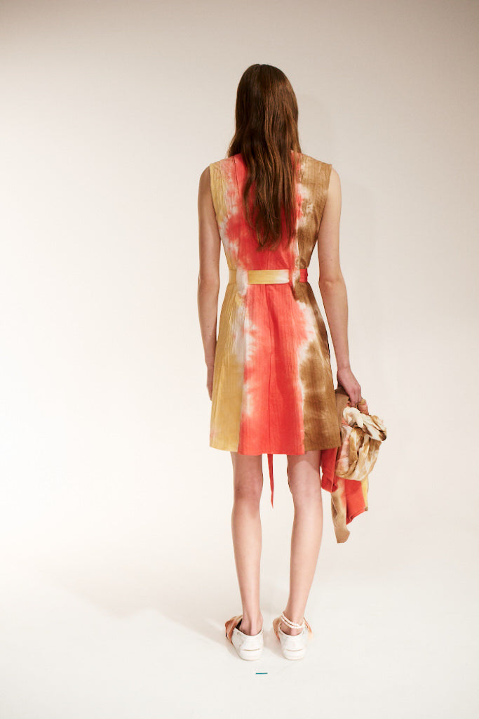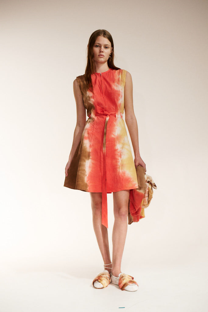 - Sleeveless dress with front zipper and waist tie.