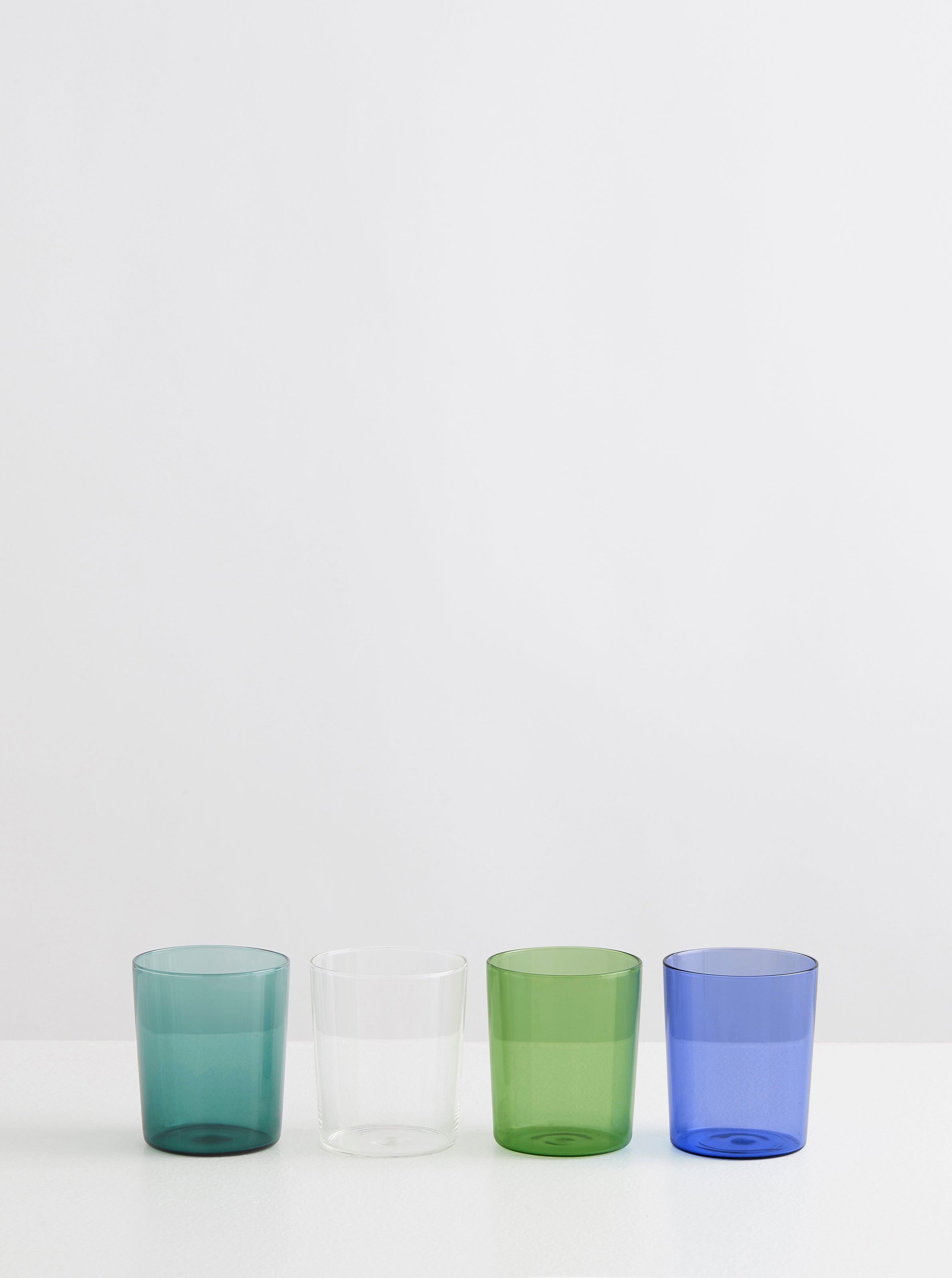 These four drinking tumblers are each hand crafted from a mix of teal, azure, green and clear borosilicate glass. A timeless design for everyday and special occasions alike, each tumbler adds extraordinary pleasure to the simple act of sipping your favourite drink.