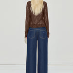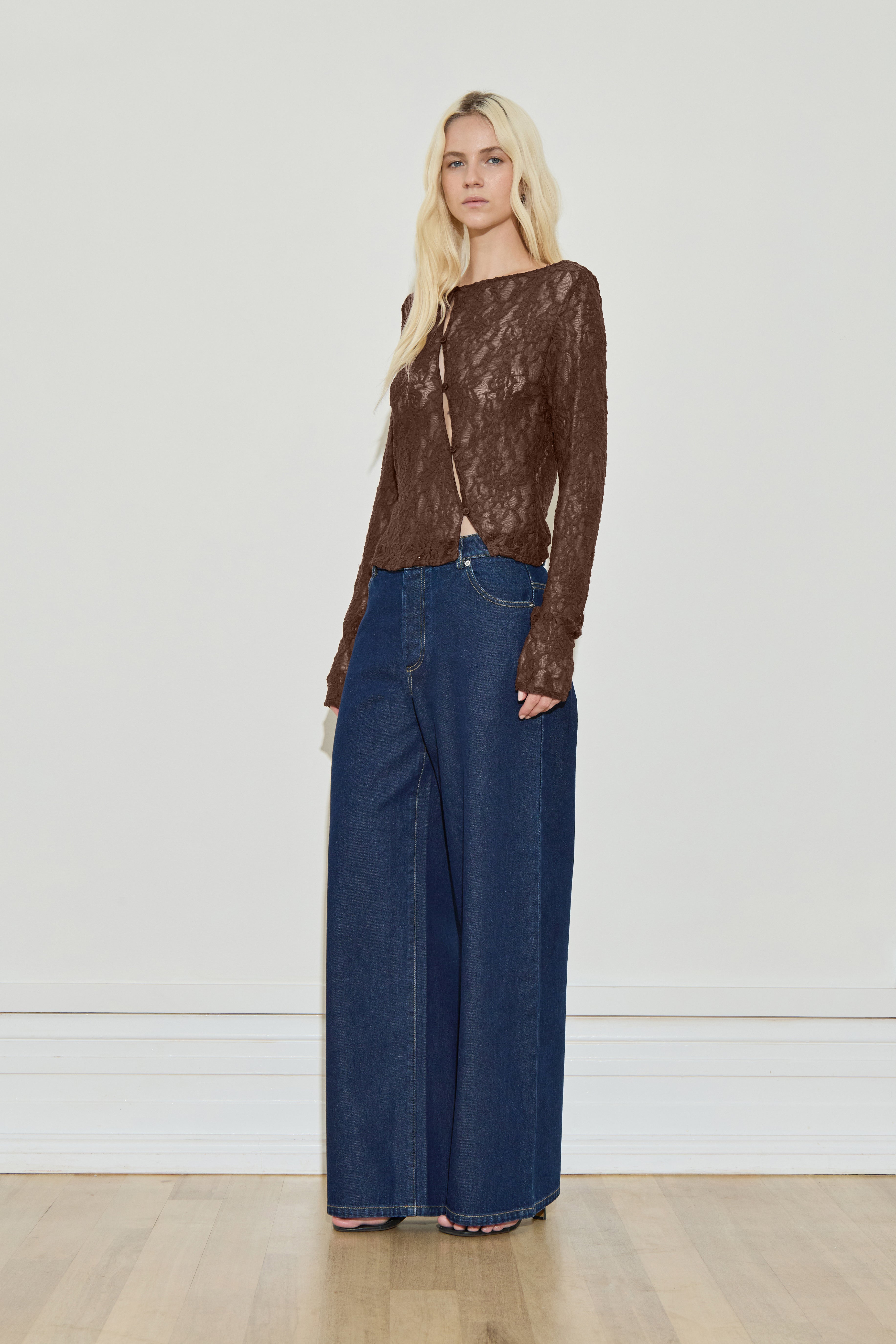 Long Sleeve Asymmetric Lace Top in Chocolate by Maison Essentiele.