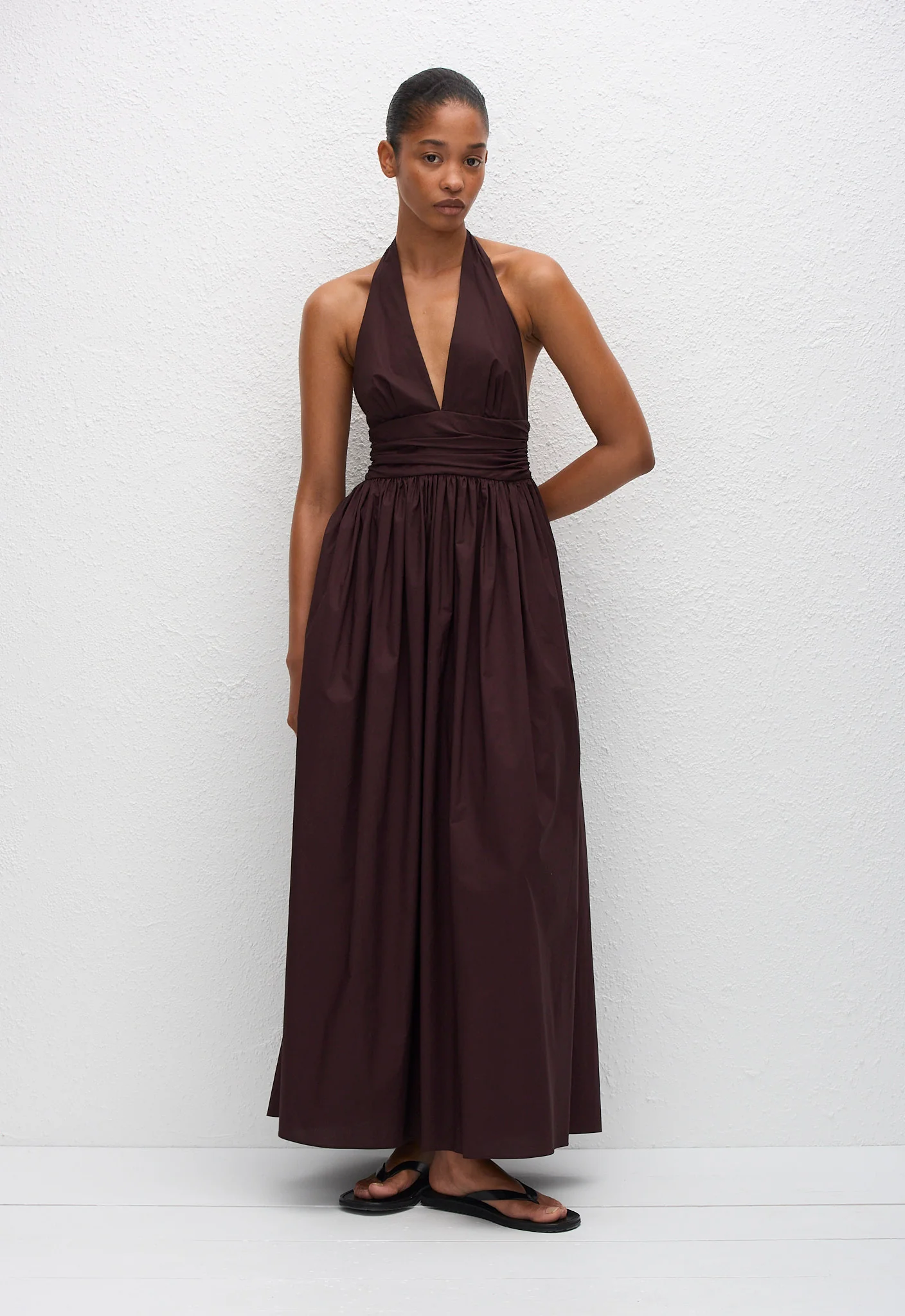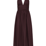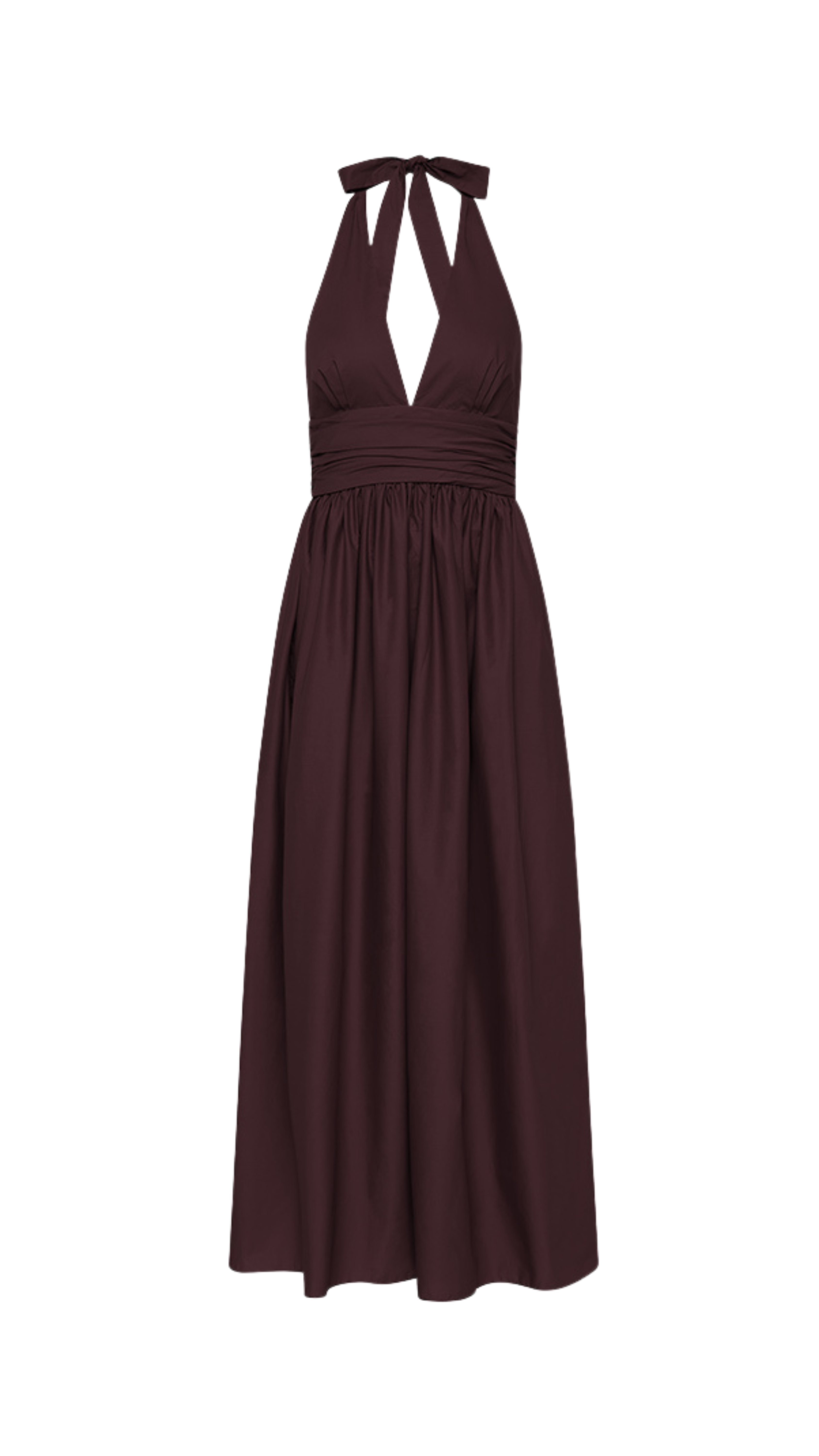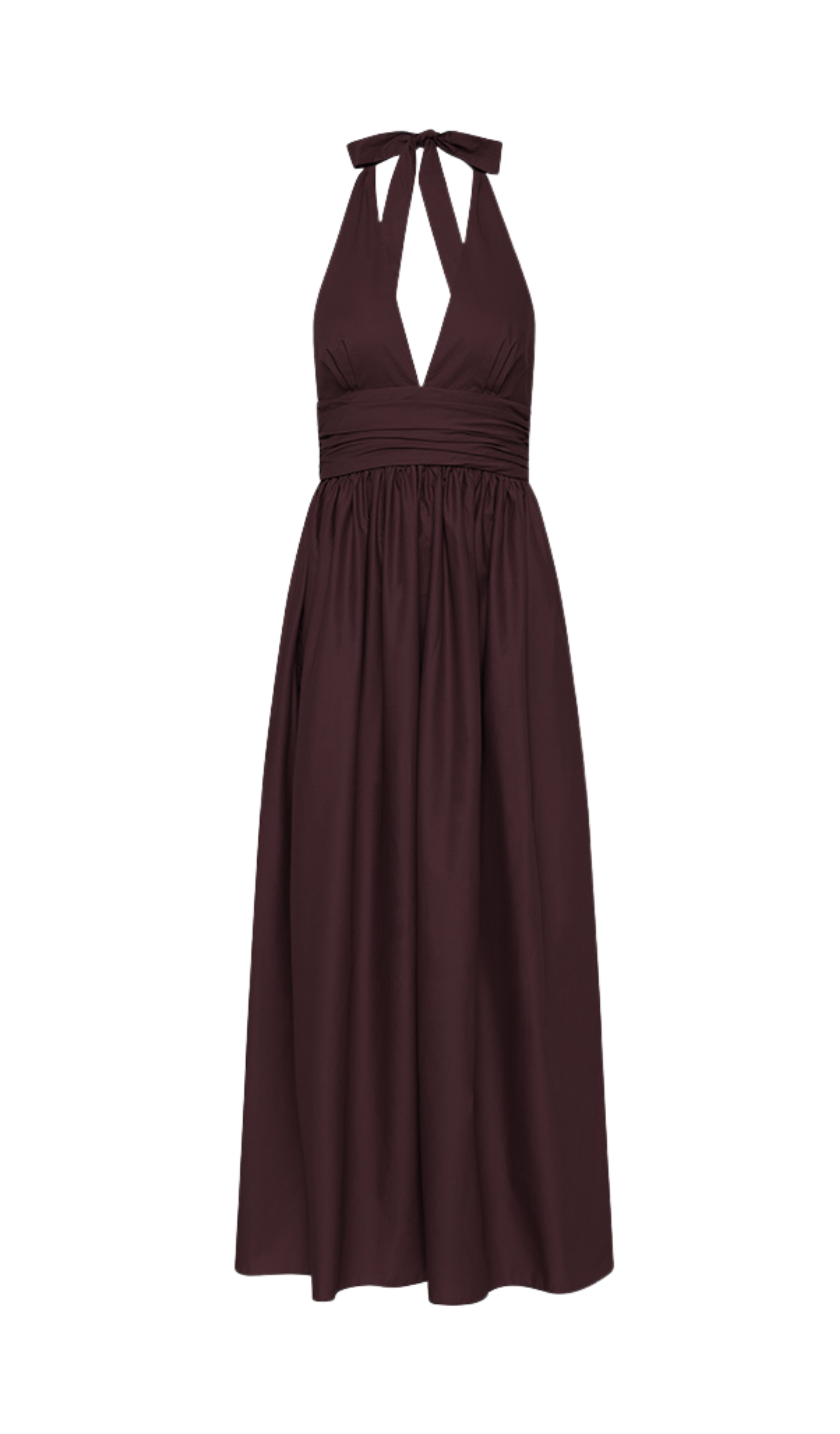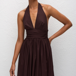 The Plunge Halter Dress in rich Aubergine is crafted from soft, sustainable Organic Cotton, combining comfort with elegance. Its fitted bodice accentuates the silhouette, while the elongated neck tie adds a sophisticated, adjustable detail. The dramatic low back offers a stylish, modern edge perfect for warm days or evening occasions. Pair this versatile dress with strappy sandals or heels to create a refined, polished look that transitions effortlessly from daytime events to night outings. A timeless piece that enhances your wardrobe with understated luxury and sustainable style.