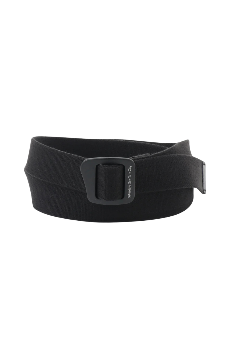 The Aluminum Buckle Belt in Black by Saturdays NYC is a tape belt that features a logo-engraved aluminum buckle and cotton-touch acrylic tape.