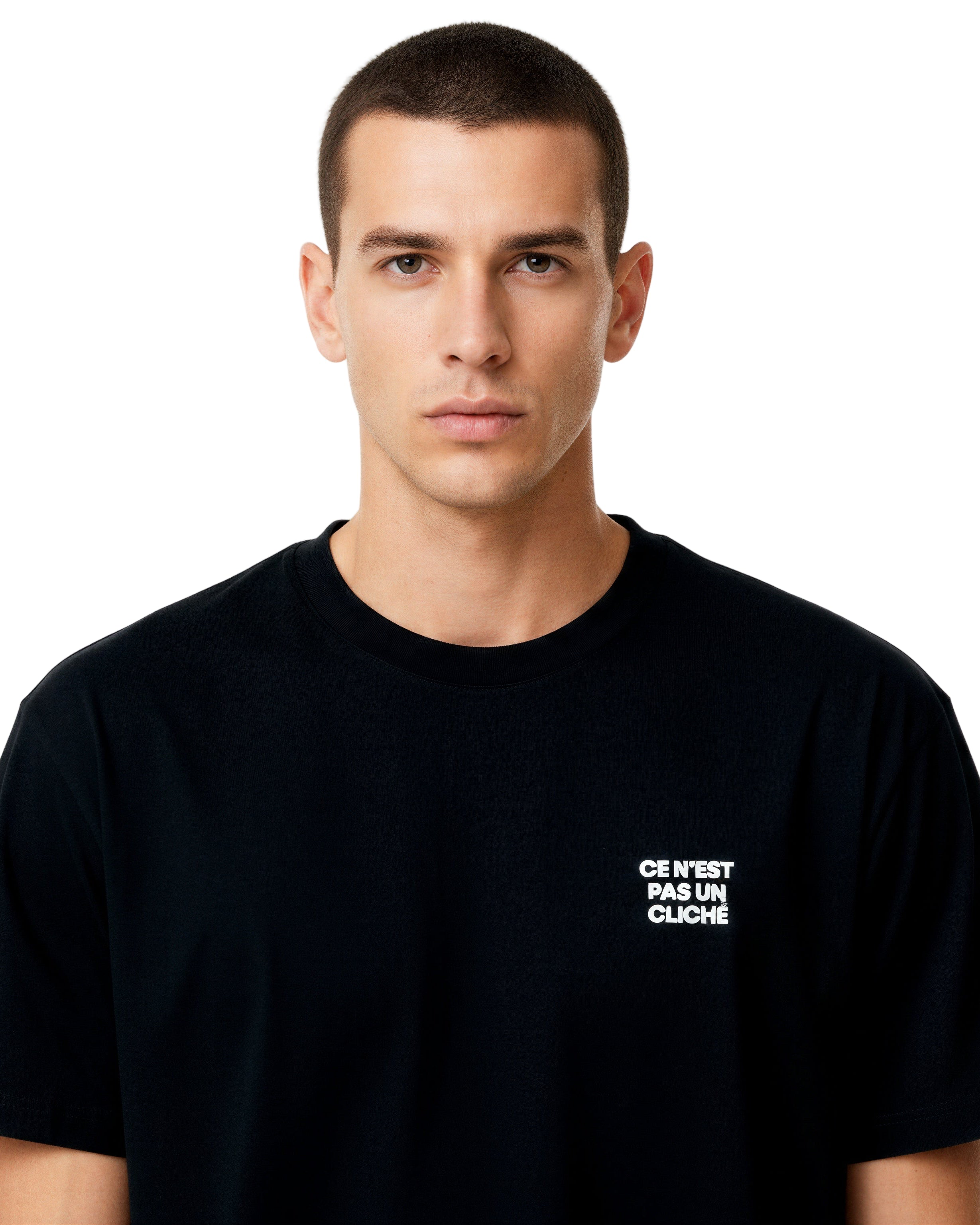 Crafted from 260 GSM 100% cotton, this premium black tee delivers structure, comfort, and attitude. Featuring the bold ‘CE N’EST PAS UN CLICHÉ’slogan screen printed on both the front and back.