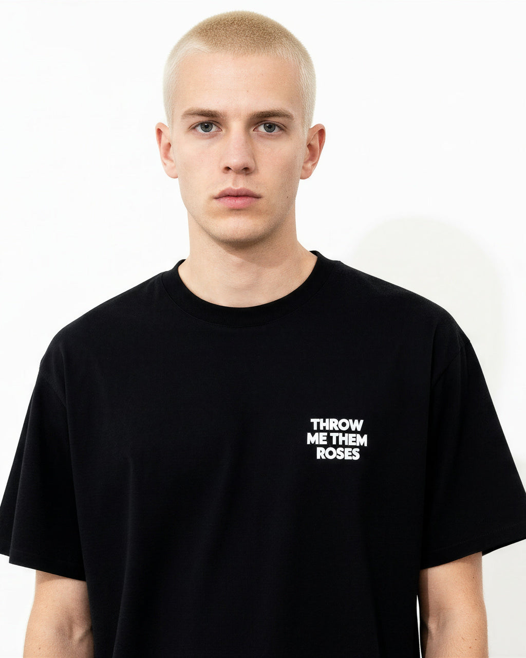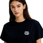 Crafted from 260 GSM 100% cotton, this premium black tee delivers structure, comfort, and attitude. Featuring the 'THROW ME THEM ROSES’ slogan. screen printed on both the front and back.