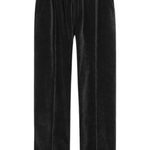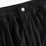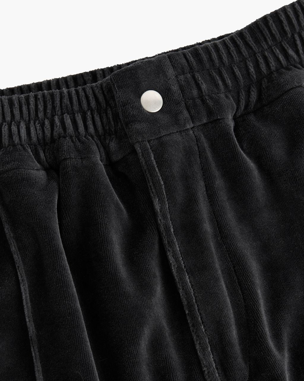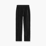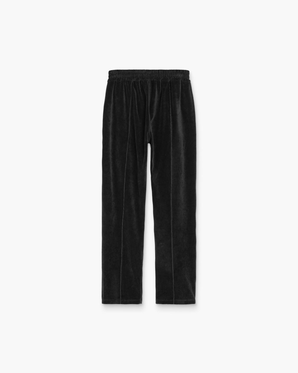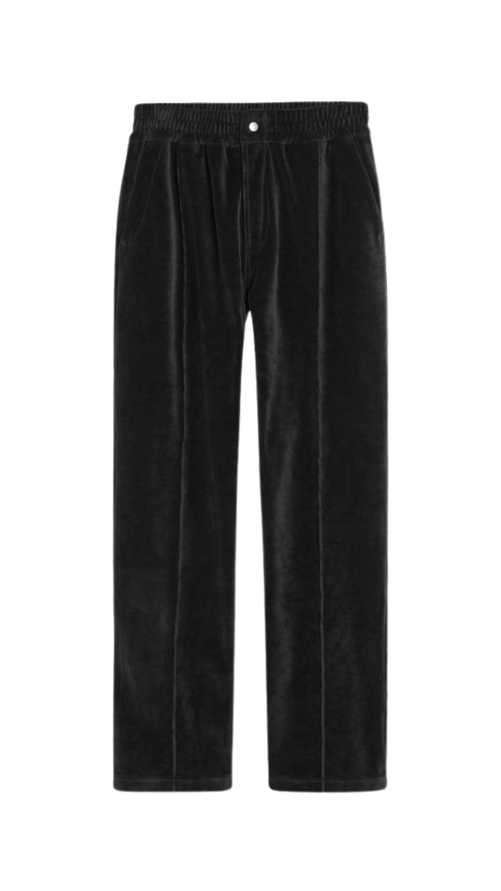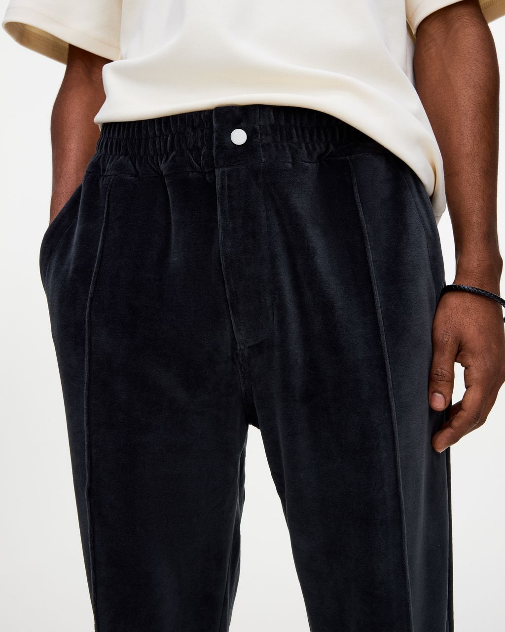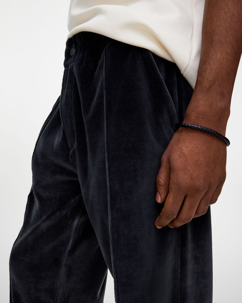 Black velour pants tailored to a longline silhouette with topstitched pleats. Elastic waist, concealed zip fly, and slanted side pockets. Model is 180 cm/5'11" and wears size M.
