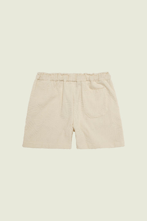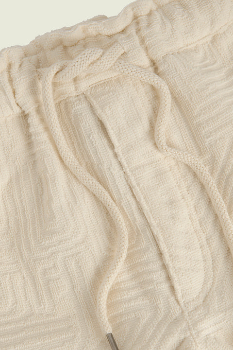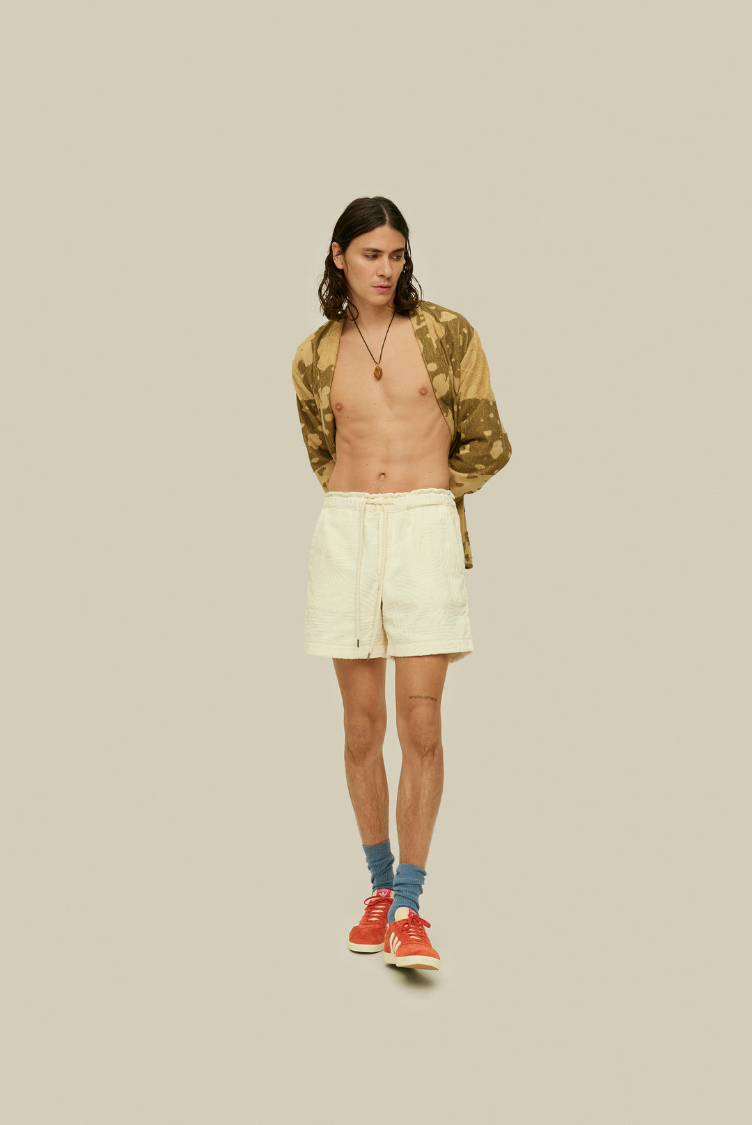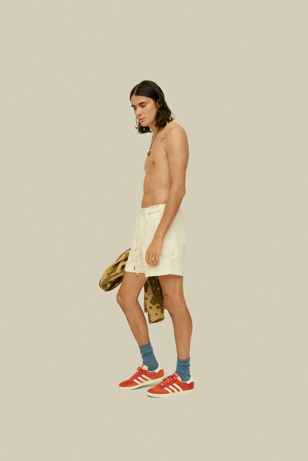 The Cream Golconda terry shorts by OAS COMPANY are patterned with hand-drawn labyrinthine shapes, jacquard-woven from heavyweight cotton terry that's soft and breathable. Cut for a relaxed fit, these shorts come with multiple pockets and have a comfortable drawstring waistband.