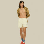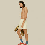 The Cream Golconda terry shorts by OAS COMPANY are patterned with hand-drawn labyrinthine shapes, jacquard-woven from heavyweight cotton terry that's soft and breathable. Cut for a relaxed fit, these shorts come with multiple pockets and have a comfortable drawstring waistband.