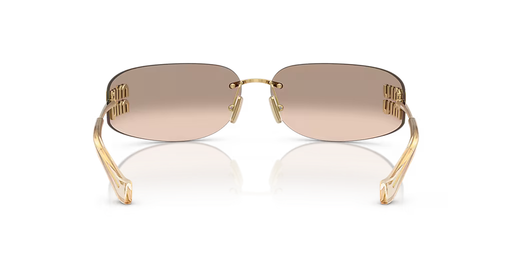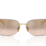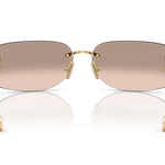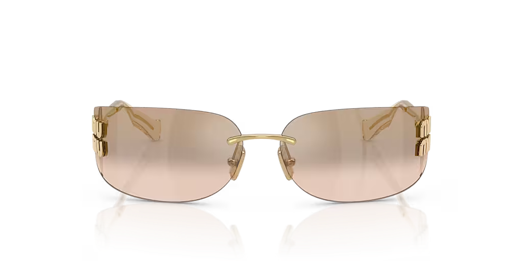 Effortlessly sleek and contemporary, the Miu Miu MU A51S sunglasses feature minimalist rimless rectangular frames in lightweight metal that add structure to your look. The gold finish exudes understated elegance, complemented by brown mirrored lenses for a reflective shine that reduces glare while protecting against intense light. Adjustable nose pads ensure a comfortable fit, perfect for all-day wear. A refined essential that blends modern sophistication with everyday practicality, embodying the timeless appeal of Miu Miu sunglasses.
