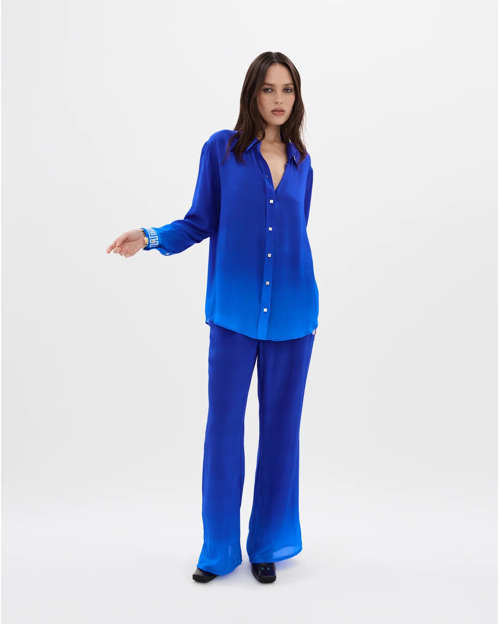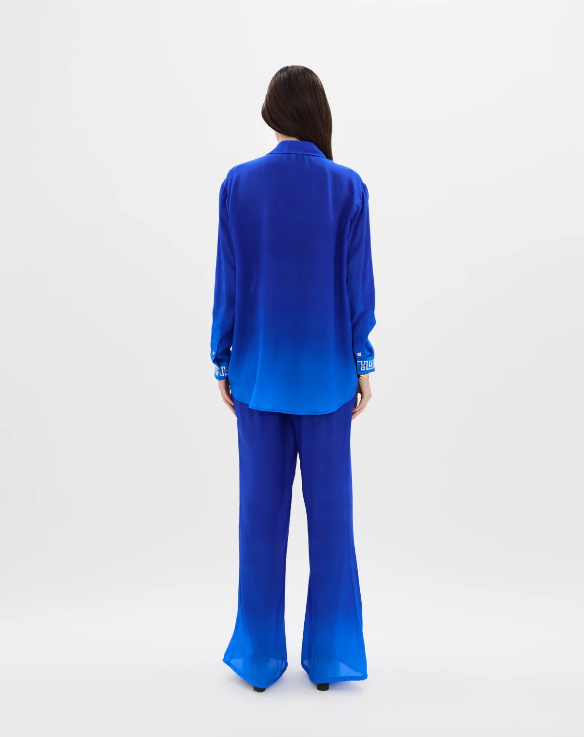 Set on 16mm silk for visual elegance and tactile luxury, the classic bias pants follow the classic Muma Logo stripe for structure to the floor, offset by the luxurious drape in a soft Cuban Nights gradient. With a wide-leg bias cut that allows the fabric to flow and move gracefully with the body, enhancing the fluidity and comfort of the design, the waistband is designed for versatility and elasticated at the back. The pants offer comfort without sacrificing style. These pants are semi-sheer, adding to the casual aesthetic of the look, perfect for warm climates or layering in transitional seasons.