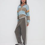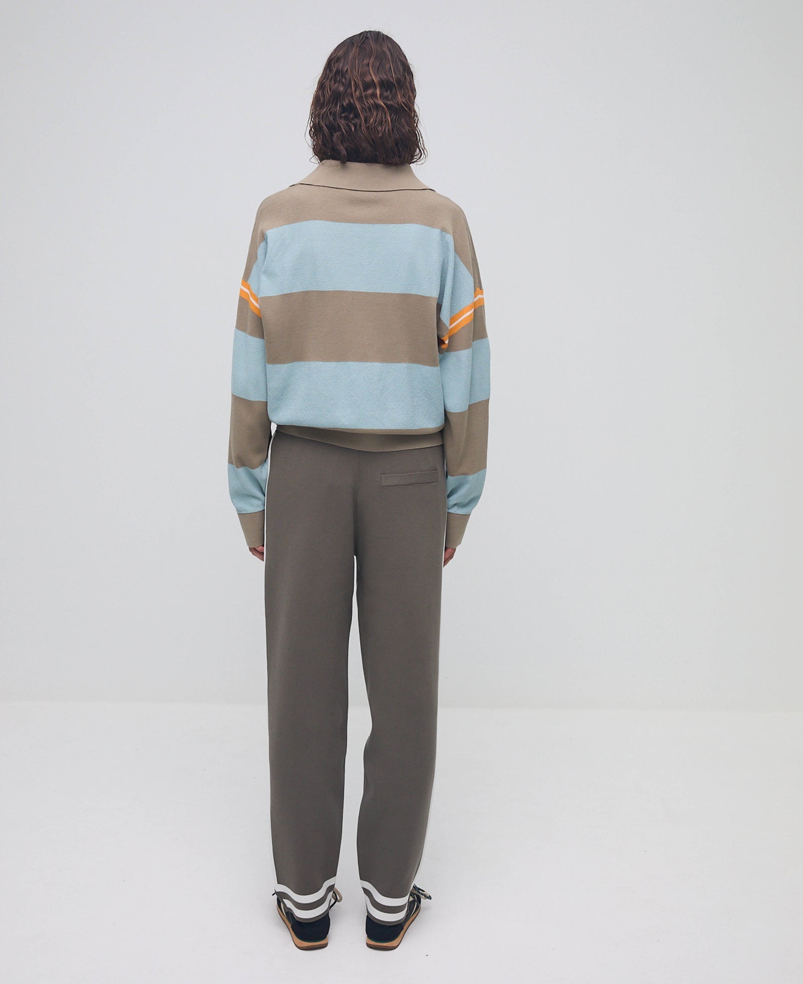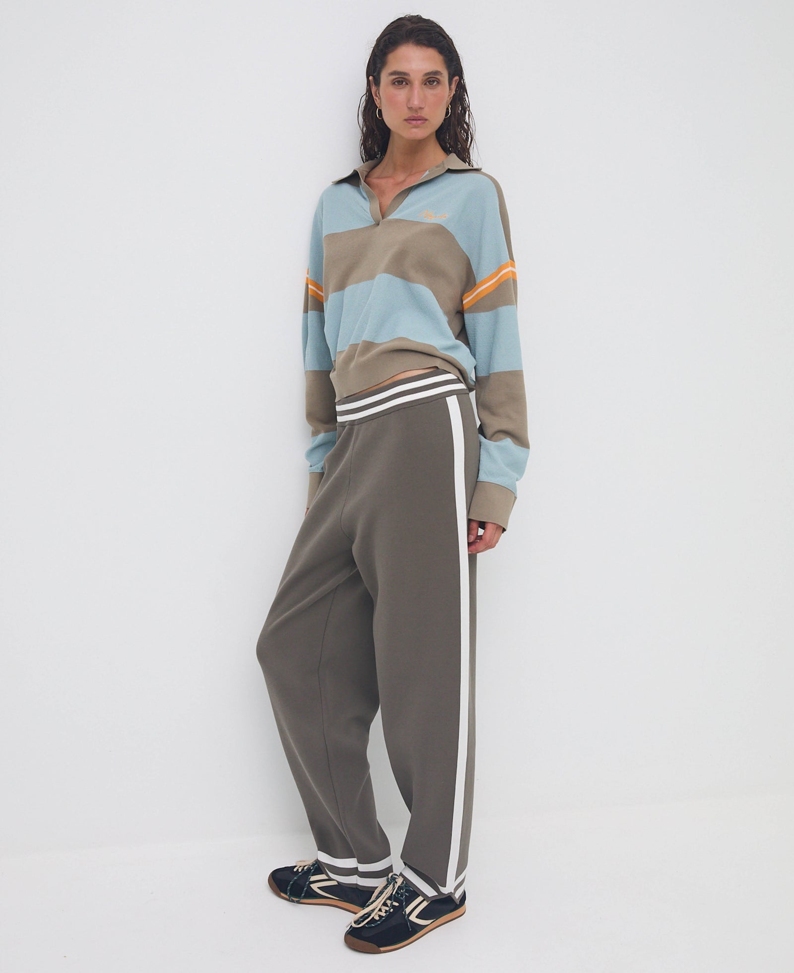 The Romeo Track Pant is part of Nagnata's SAMA genderless collection and is designed with a versatile fit. An evolution from the original Romeo pant, the Romeo 3.0 now features recycled nylon, offering better stretch and recovery. Merging fashion with sports aesthetic the relaxed knit track pant with jacquard contrast placement side stripe trims, elevates the standard streetwear style. Crafted in signature Nagnata heavy-weight bird's eye jacquard the Romeo pant now features a back pocket. Wear your Romeo high on the waist for an ankle crop and slightly tapered leg. Nagnata male customer tend to wear the trackies dropped down low on the waist, but we also love them as a high-rise on the boys.