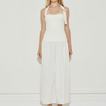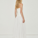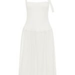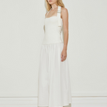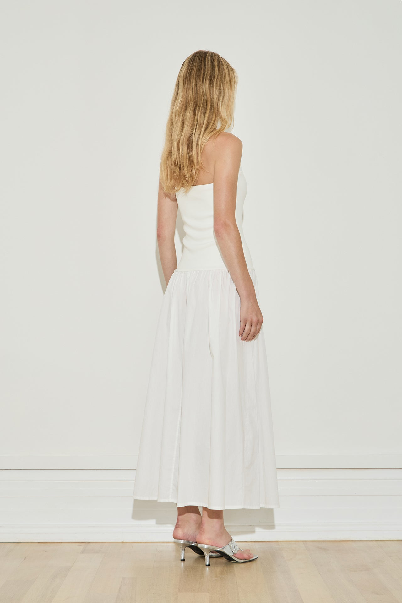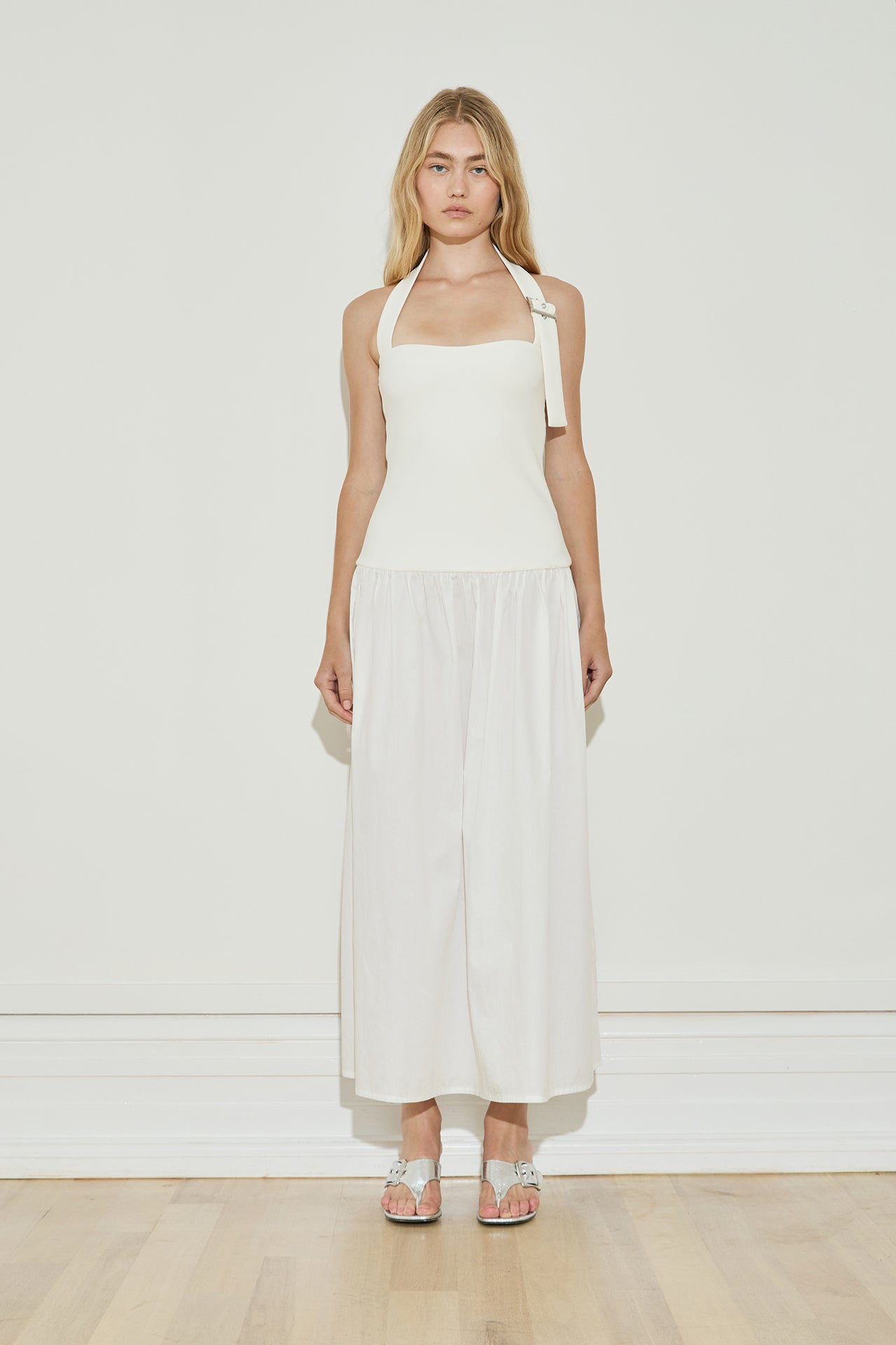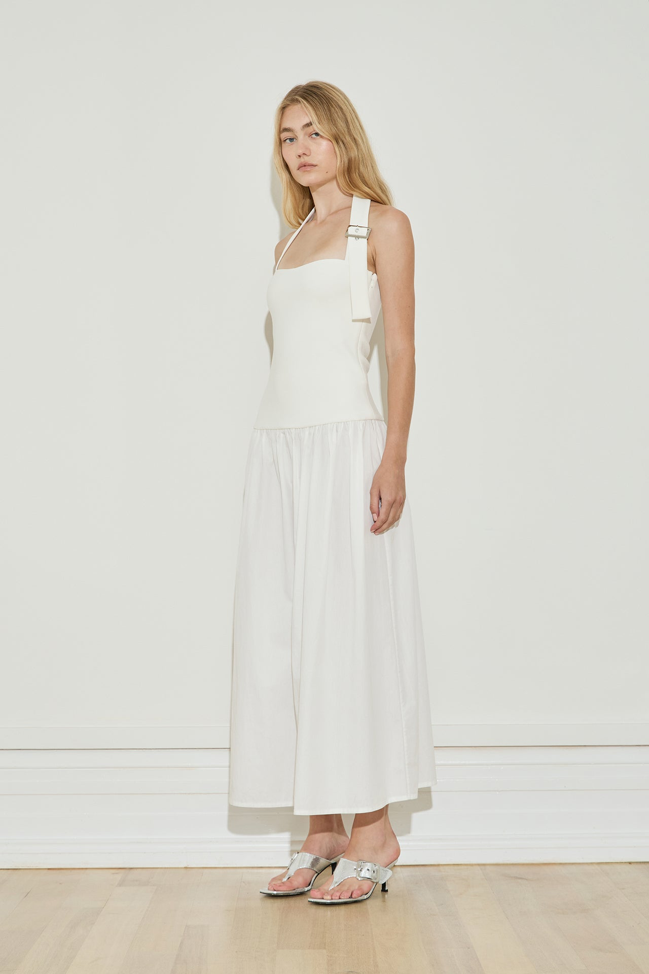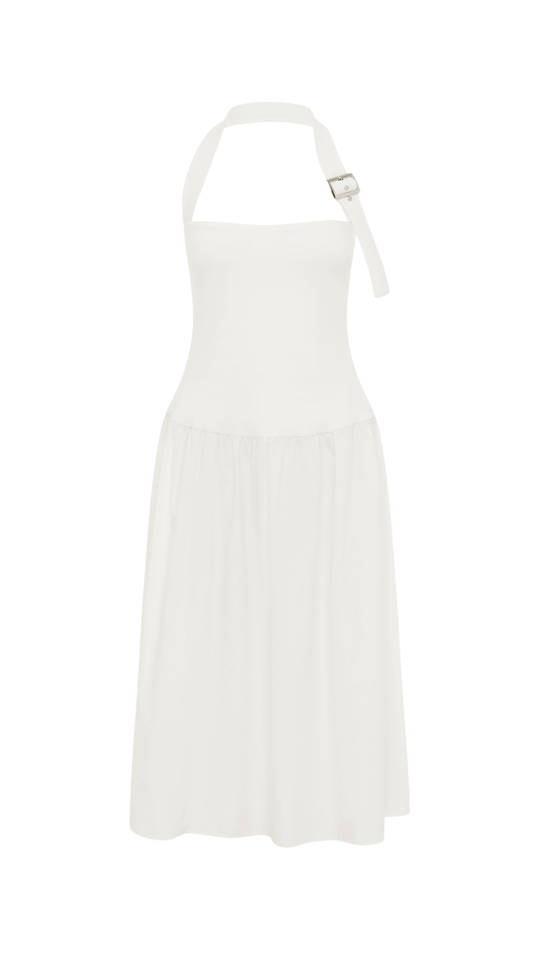 The Buckle dress in a fitted crepe knit with a contrasting cotton skirt detailing. Featuring an exposed buckle for an elevated look.