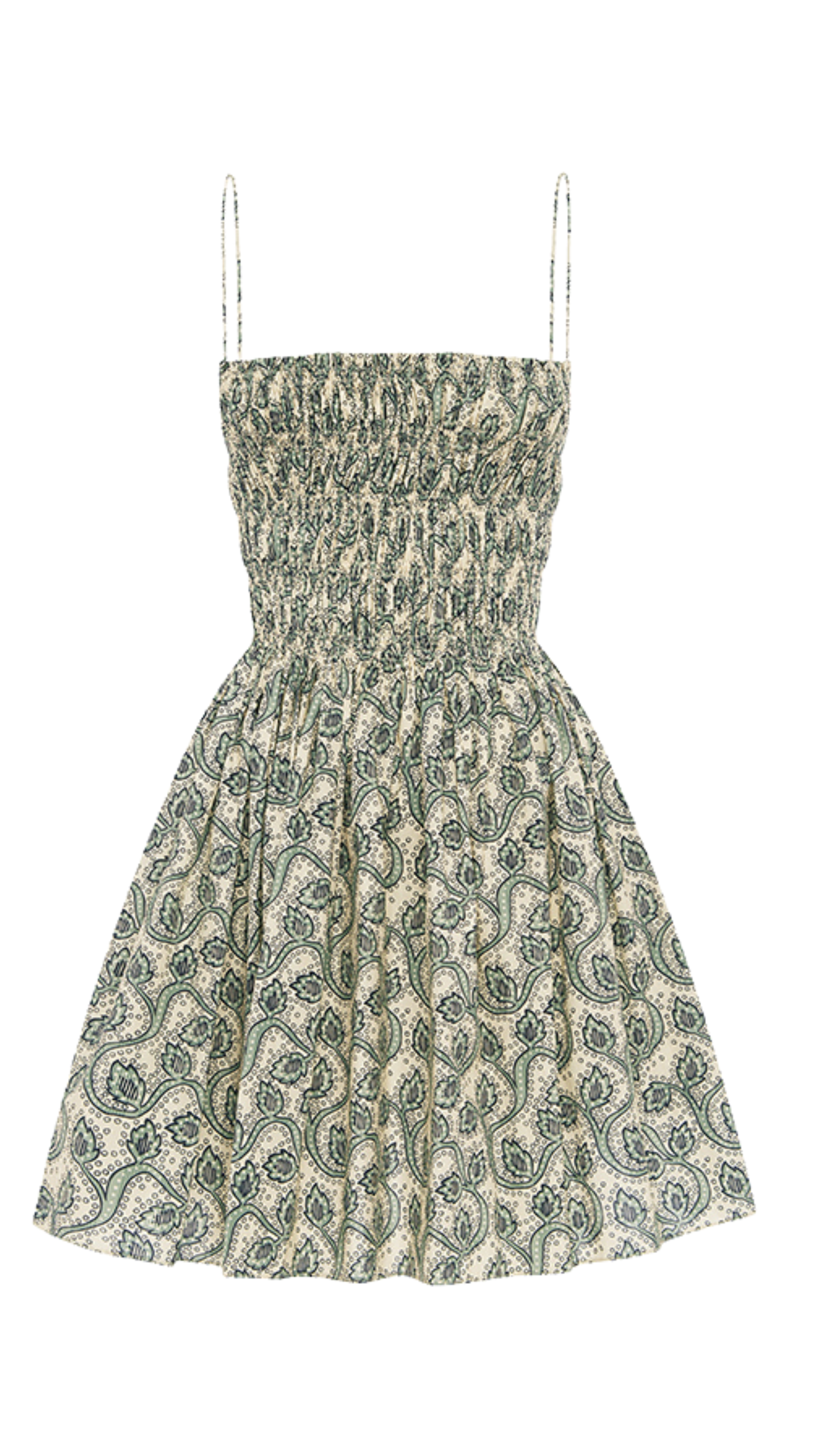 The Shirred Bodice Mini Dress in Vine by Matteau.