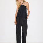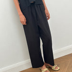 The Ease Pant by Deiji Studios in black combines comfort and style effortlessly. These ankle-length trousers feature a soft minimal elastic waistband and handy side seam pockets, offering practicality alongside a sleek, straight-leg silhouette. Crafted from 100% GOTS certified organic cotton poplin, they provide breathable softness ideal for lounging at home, relaxing in bed, or stepping out with a chic, understated look. Designed for ease and versatility, these pants elevate everyday wear with sustainable luxury. The model is 179cm tall, wears a size S, and typically fits an AU size 8.