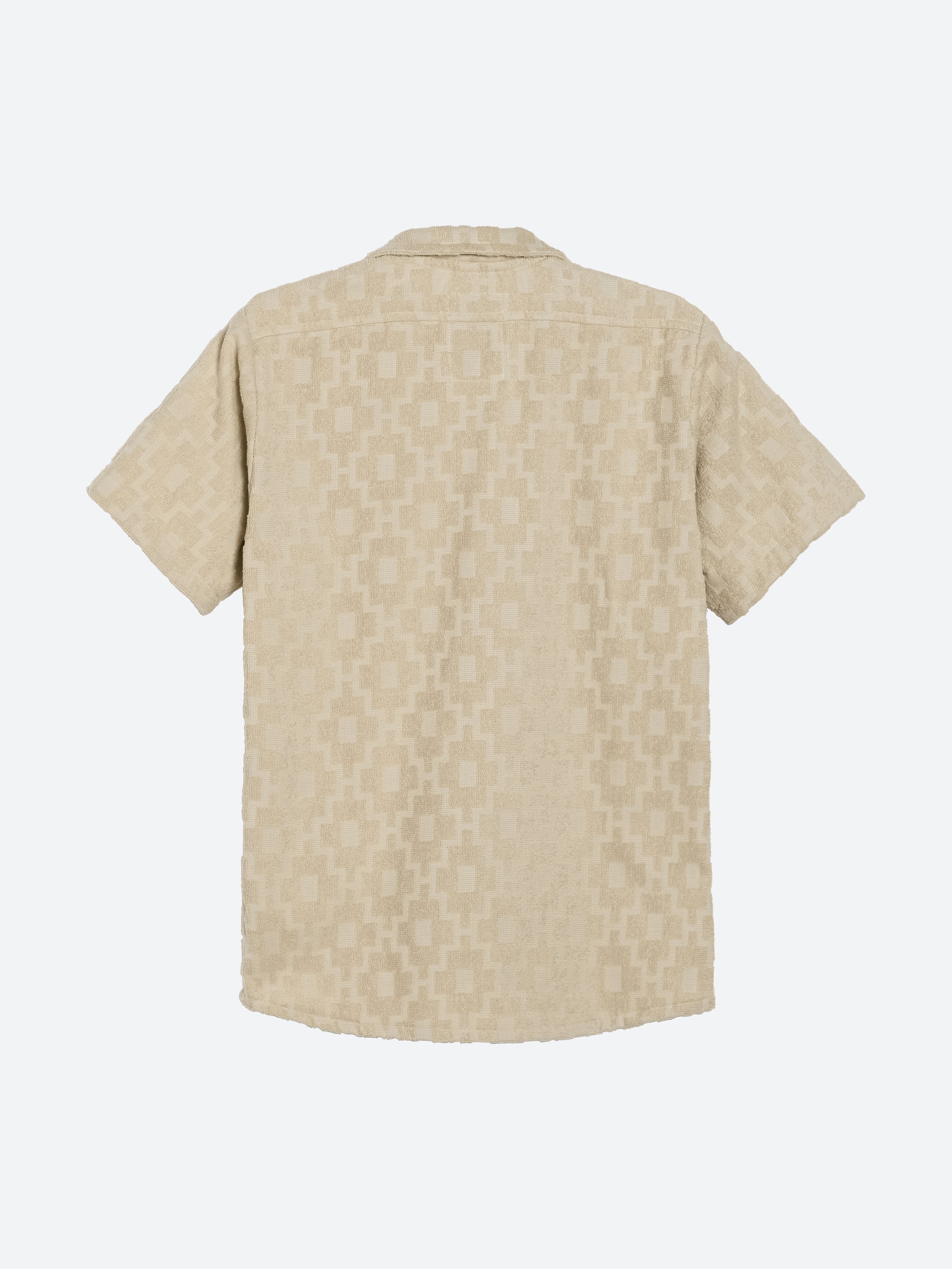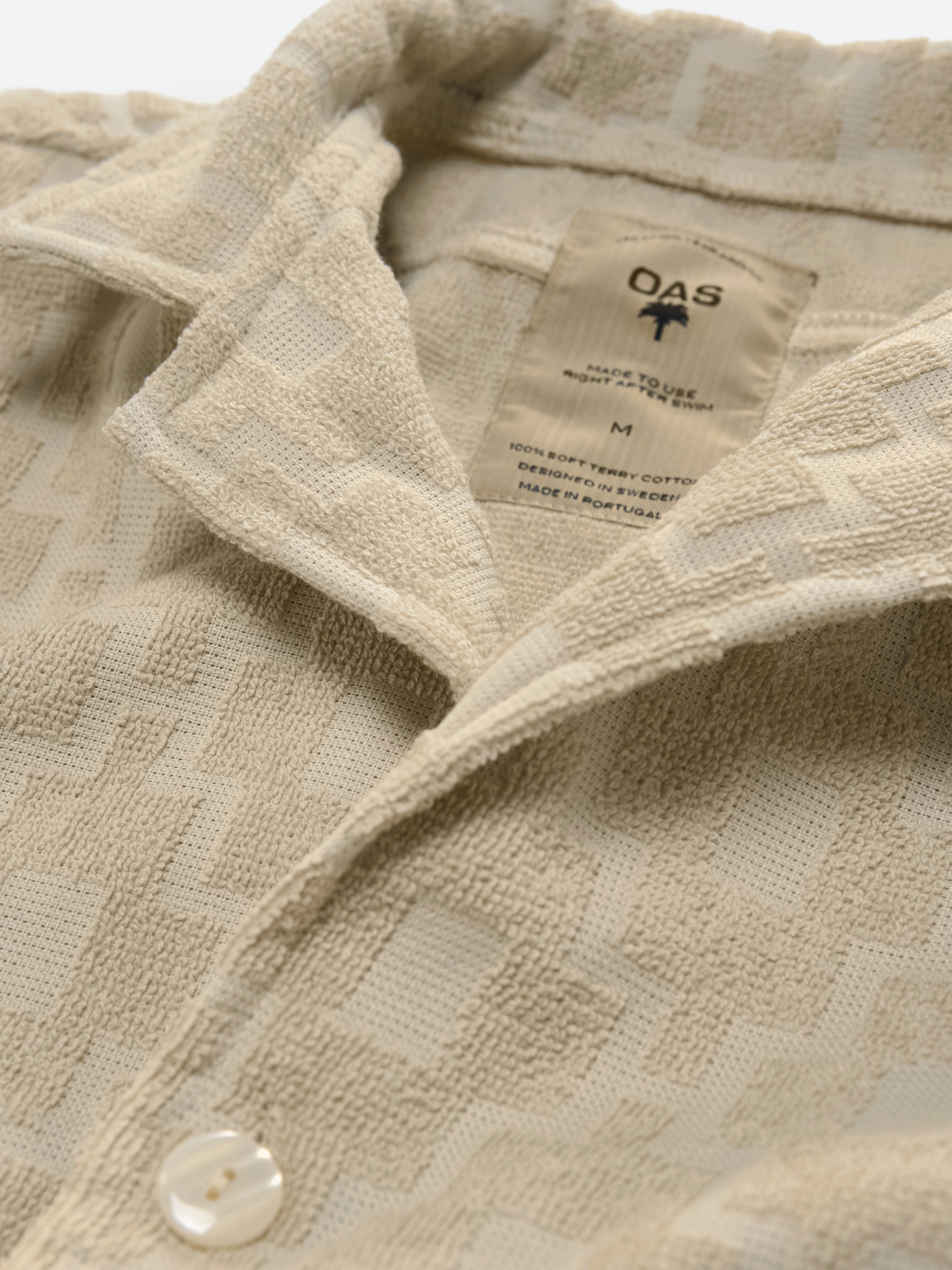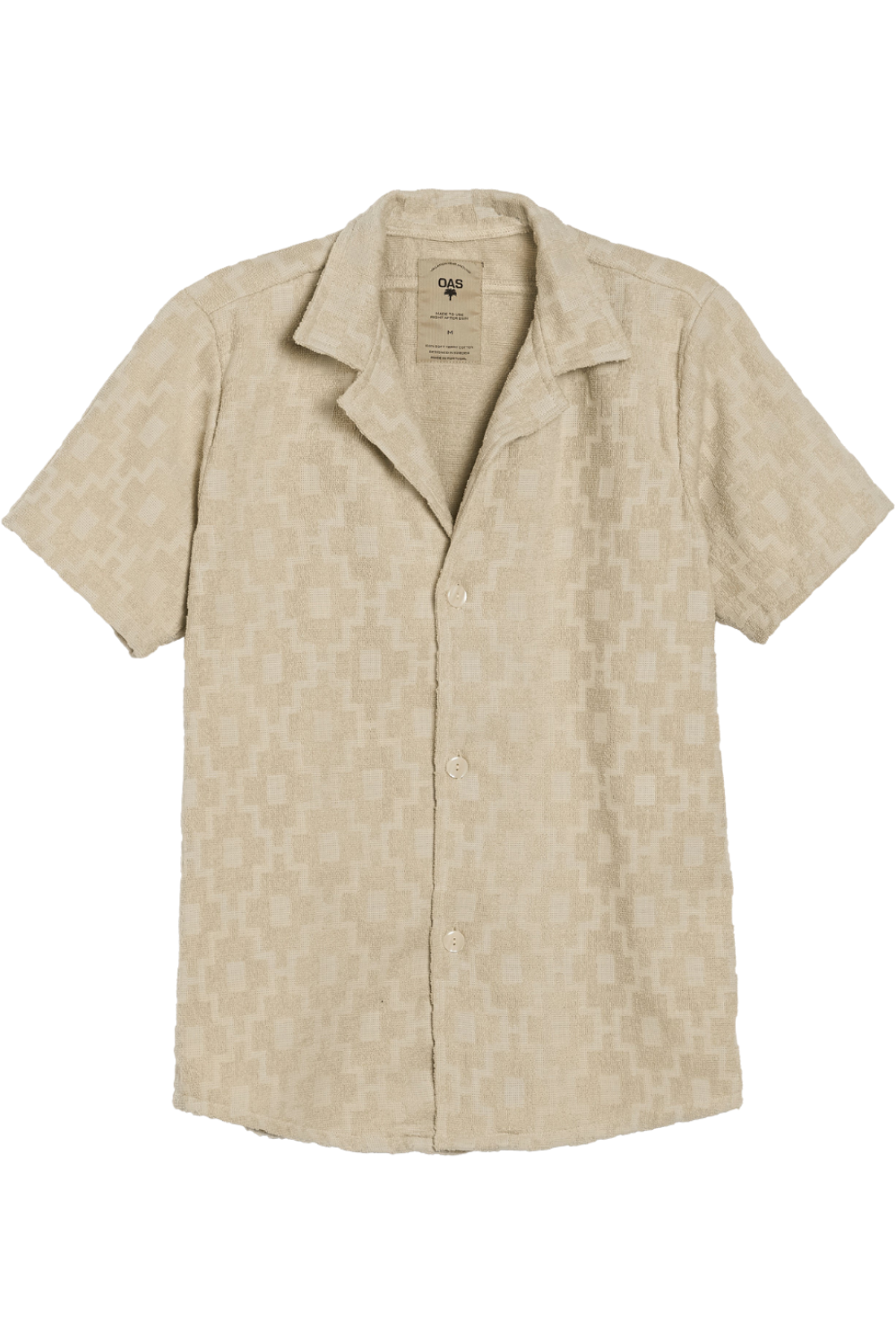 The Beige Machu Cuba Terry towel shirt by OAS Company is inspired by ancient motifs. The Machu pattern is designed in a crisp, light, and cool beige. Made in 100% heavyweight jacquard-woven terry cotton that lets your body breathe, the short-sleeved shirt is complemented with a flat resort collar, a relaxed fit, and a curved hemline. Designed in Stockholm and made in Portugal.